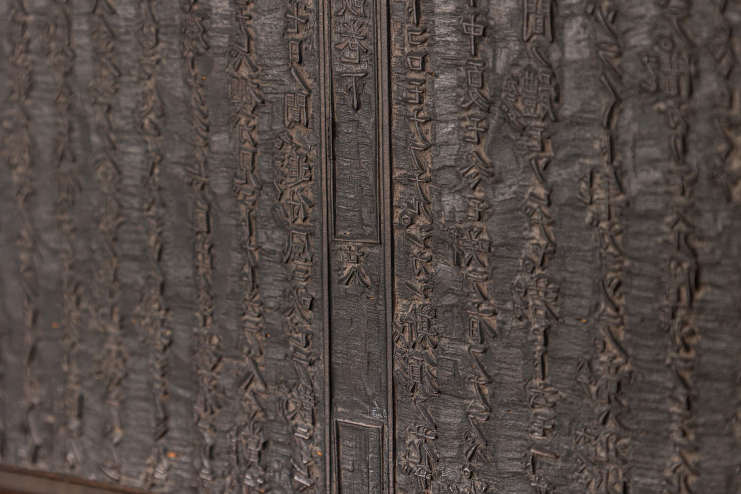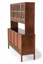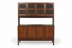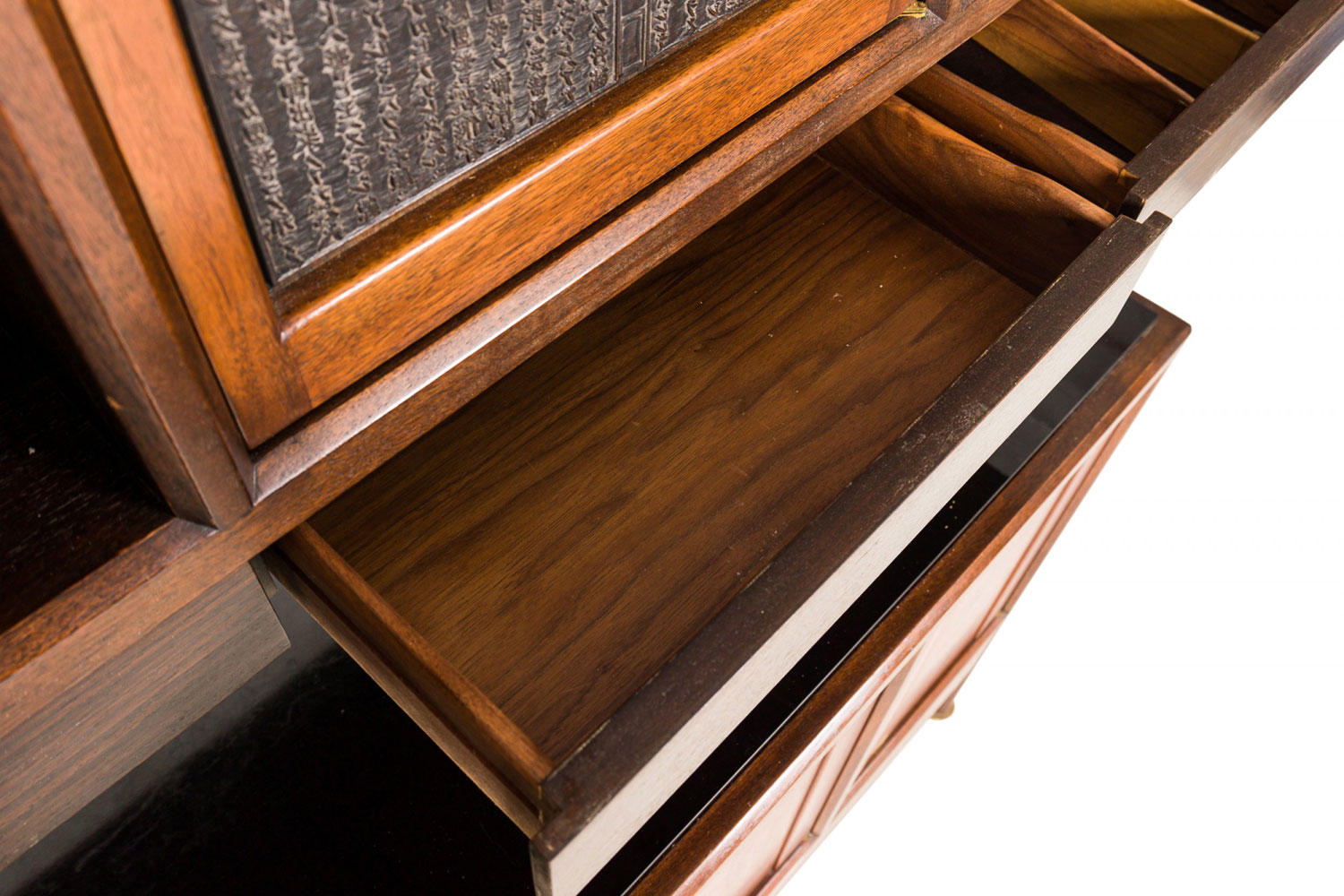 Mid-Century two-section china cabinet / hutch with an upper walnut case with four rosewood cabinet fronts featuring inset Japanese wood blocks depicting pastoral scenes with adjacent character panels that open to reveal four interior two-shelf cabinets, above a lower sideboard section containing an additional four cabinets with adjustable shelves and three drawers. (EDWARD J WORMLEY FOR DUNBAR / JANUS)