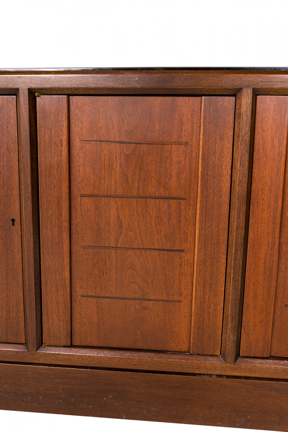 Mid-Century two-section china cabinet / hutch with an upper walnut case with four rosewood cabinet fronts featuring inset Japanese wood blocks depicting pastoral scenes with adjacent character panels that open to reveal four interior two-shelf cabinets, above a lower sideboard section containing an additional four cabinets with adjustable shelves and three drawers. (EDWARD J WORMLEY FOR DUNBAR / JANUS).