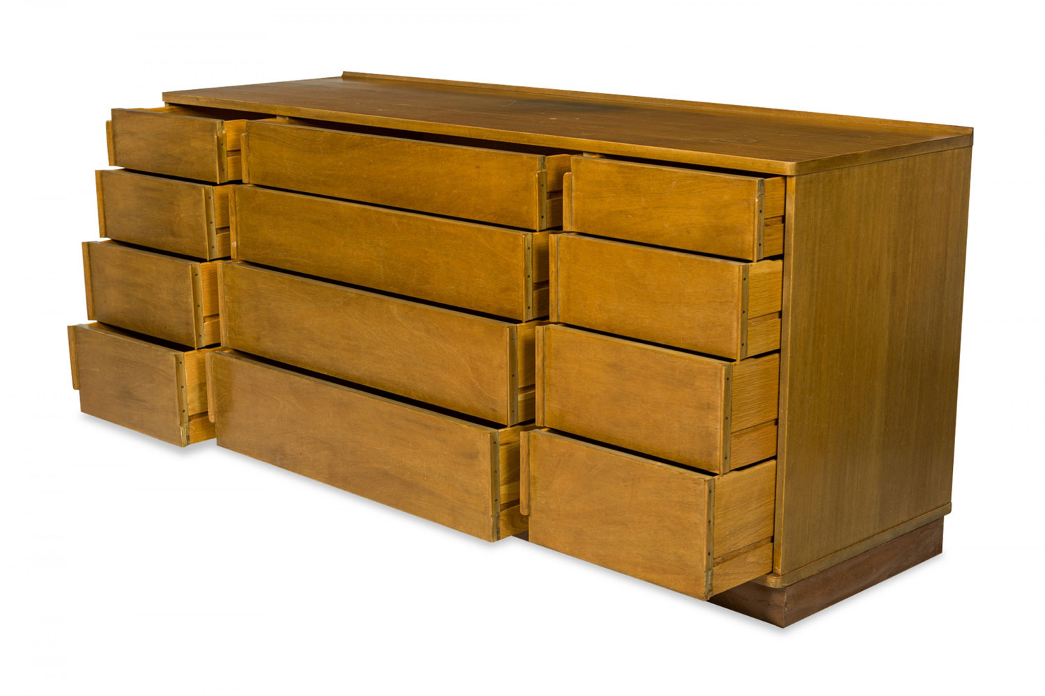 American Mid-Century walnut low chest of drawers with three sets of four drawers, one set wider and central, flanked on either side by two narrower sets of drawers. (EDWARD WORMLEY FOR DUNBAR FURNITURE CO.).