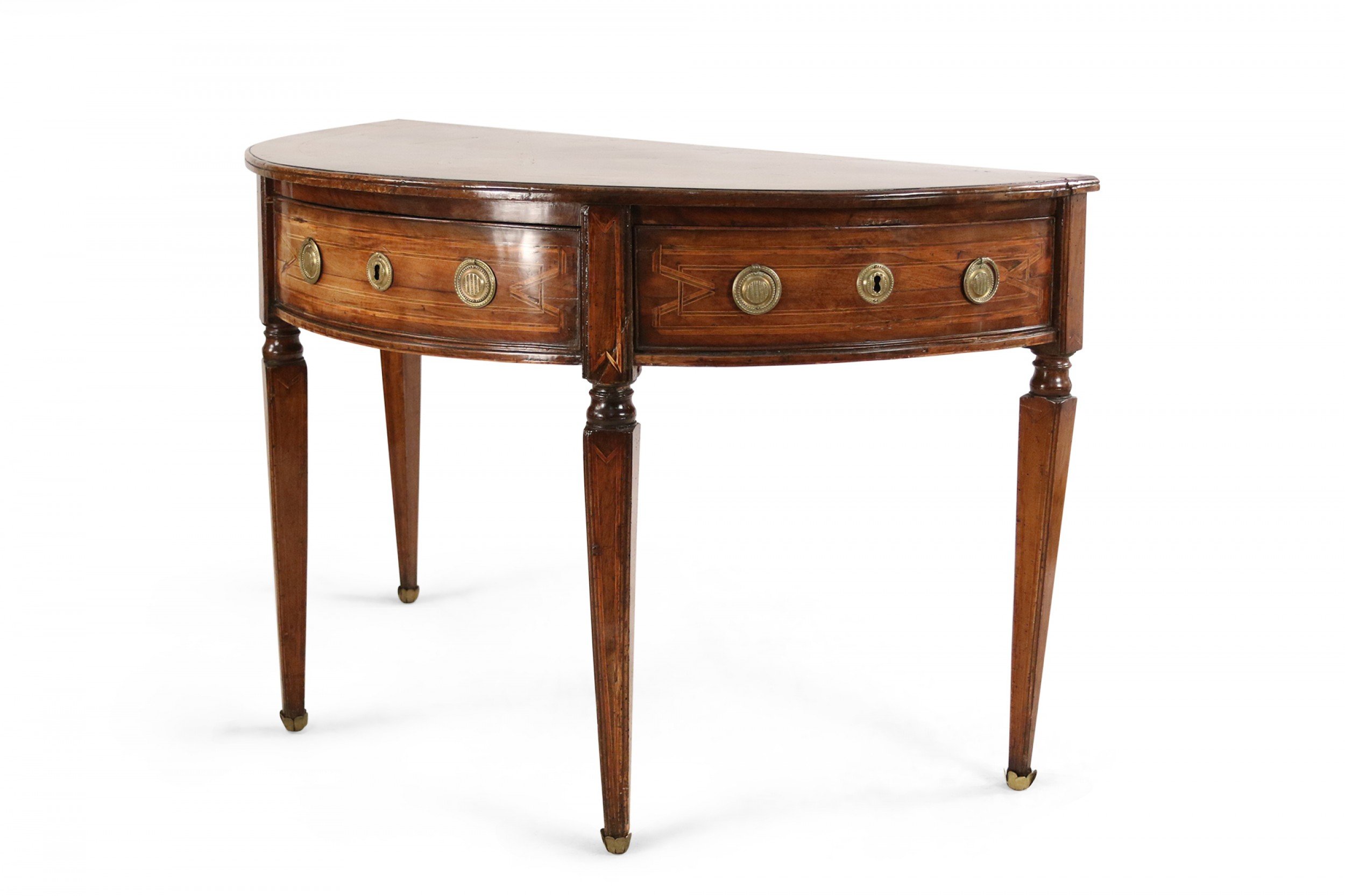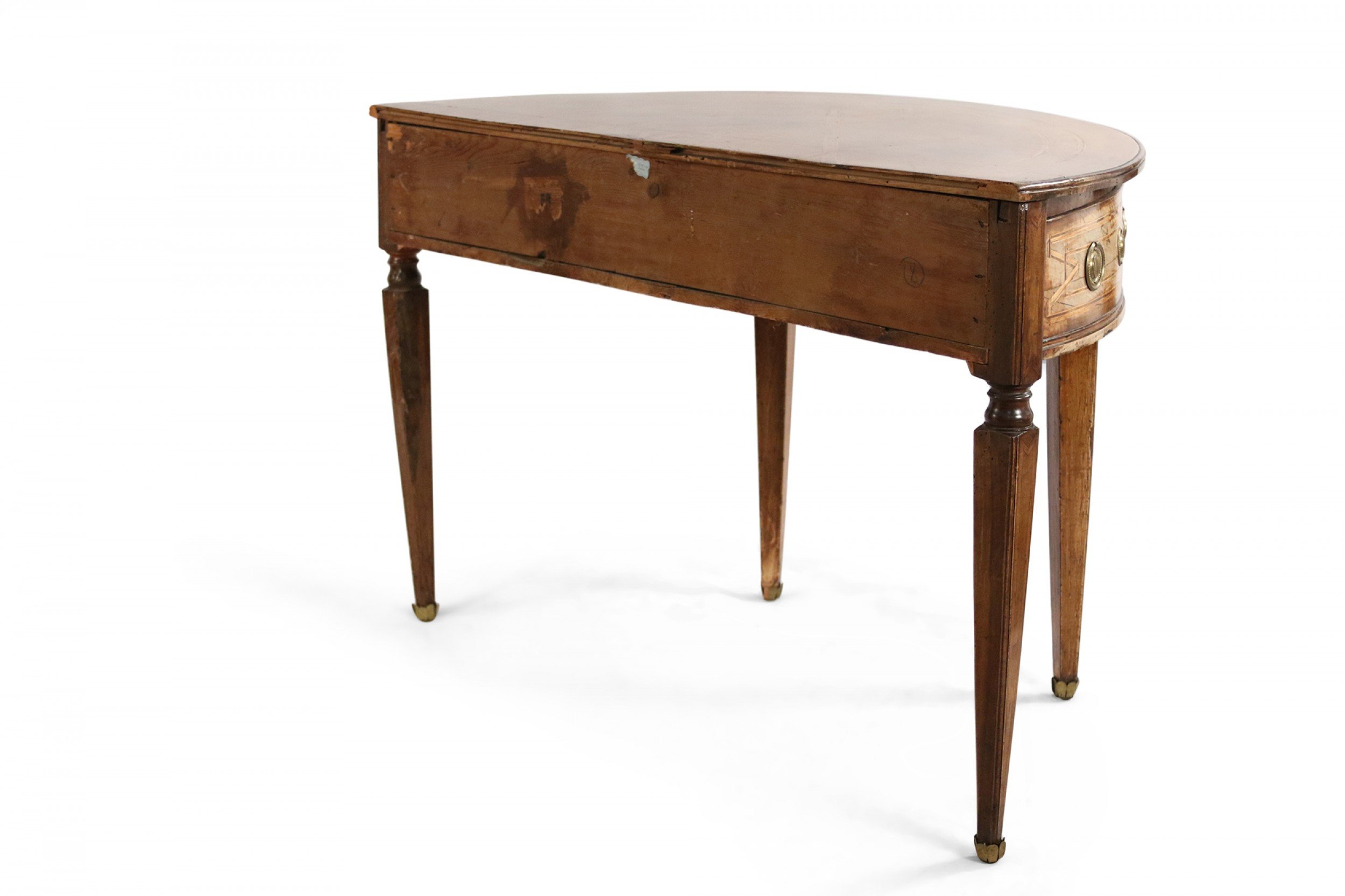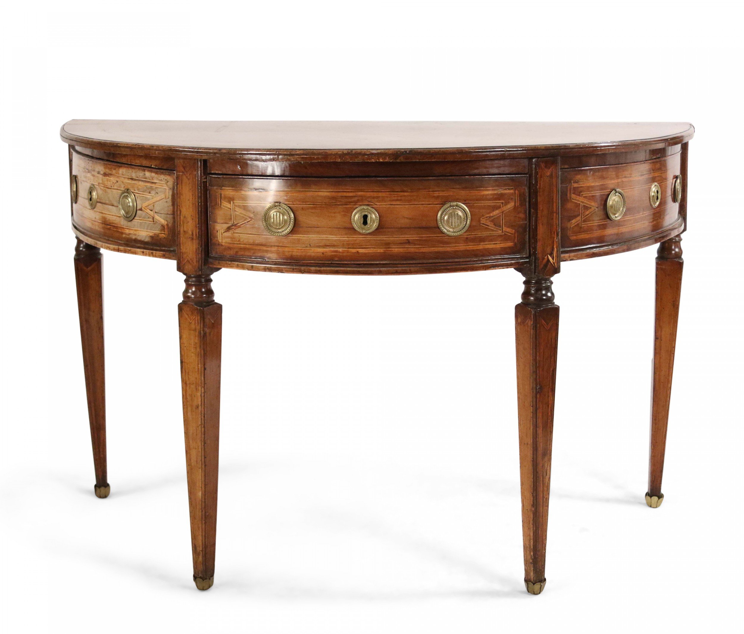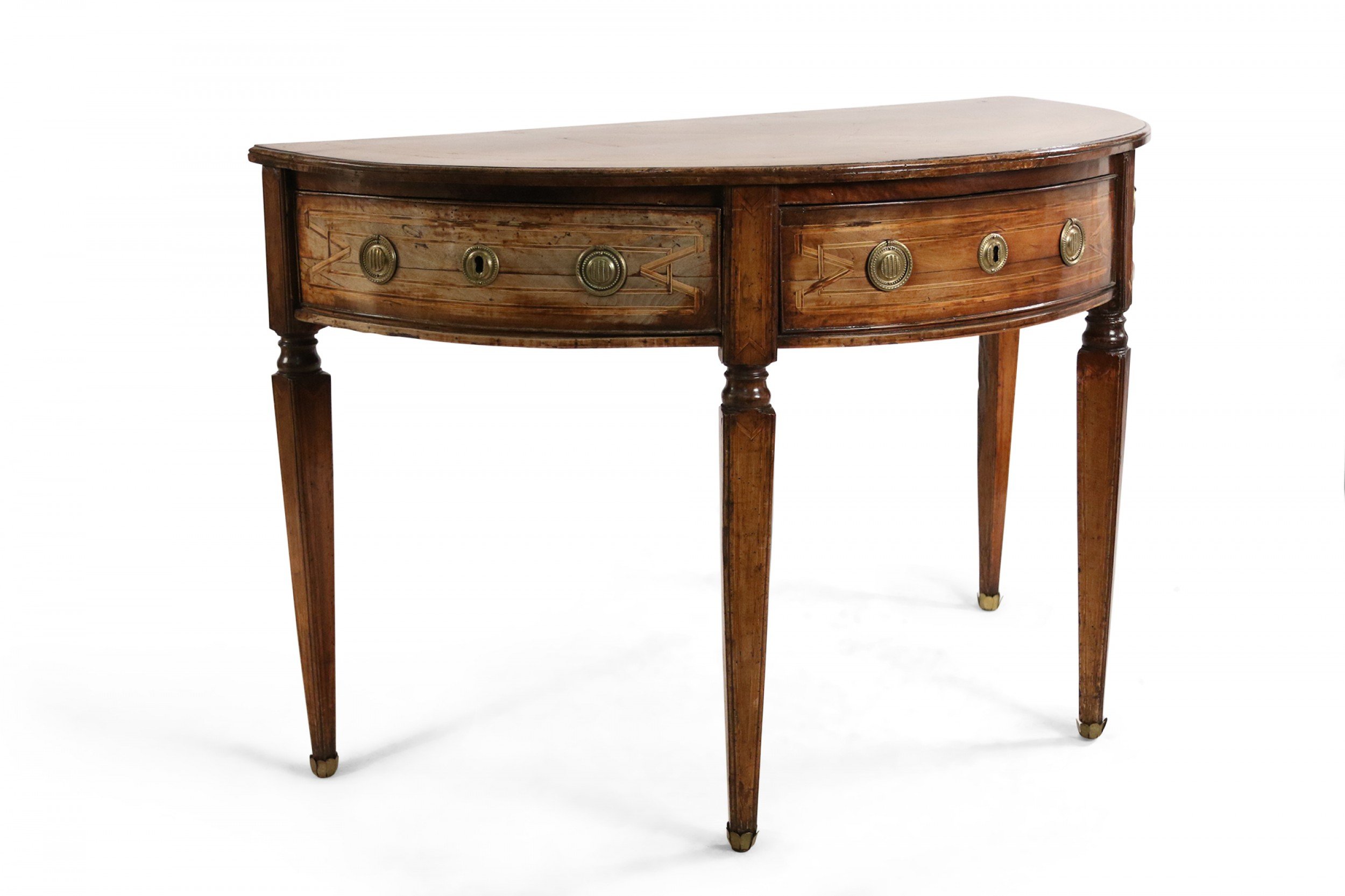 PAIR of English Sheraton (18th Century) demilune-shaped oak console tables with an inlaid compass patterned top, and 3 drawers with brass circular drawer pulls resting on four square tapered legs. (PRICED AS PAIR)