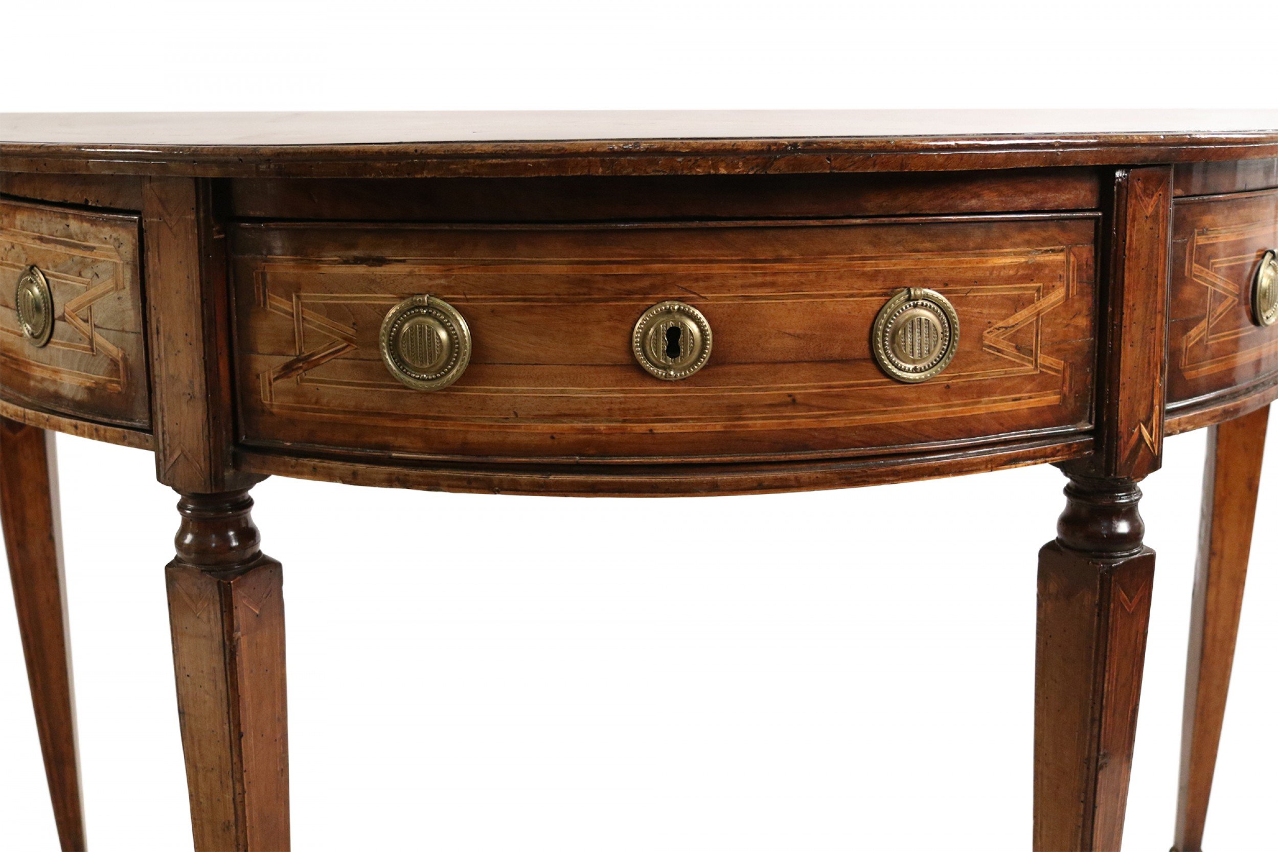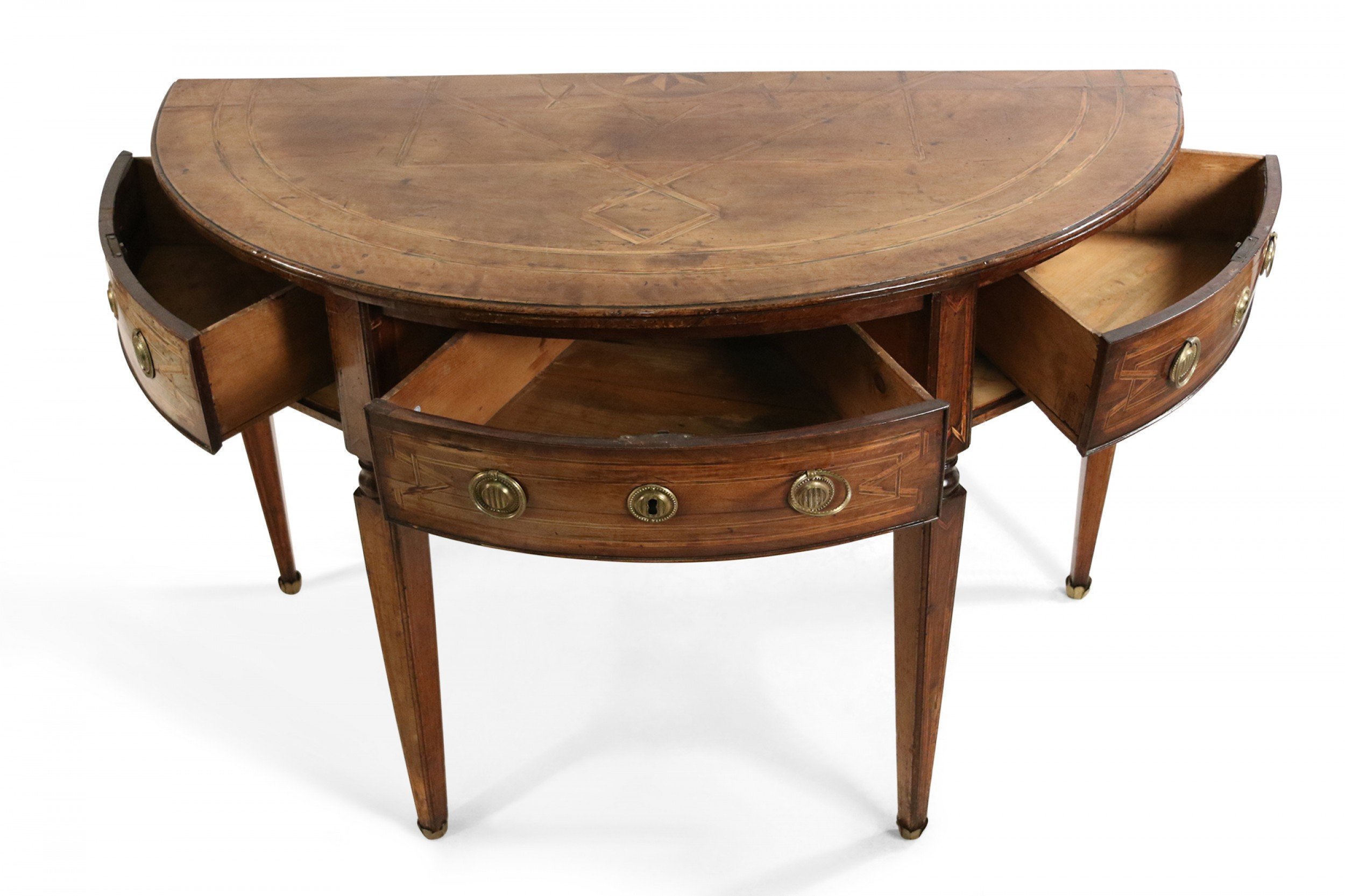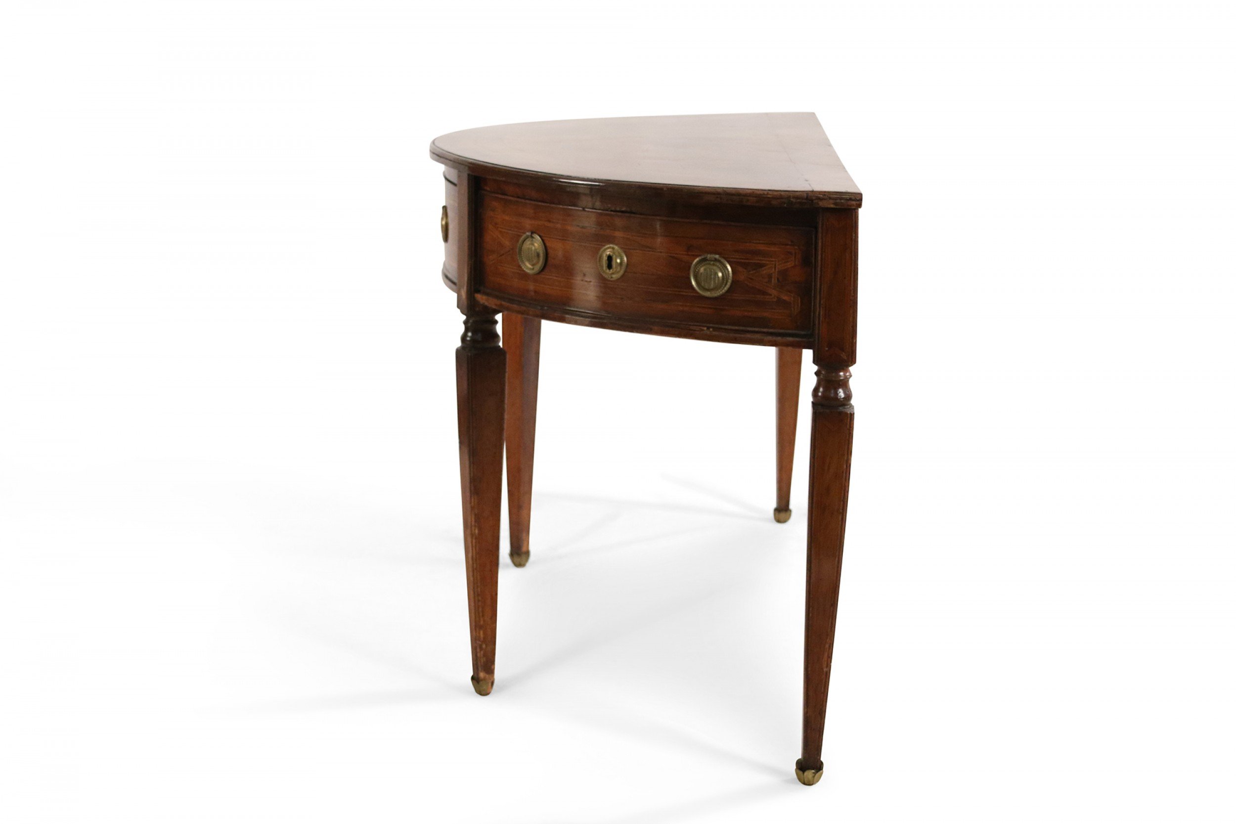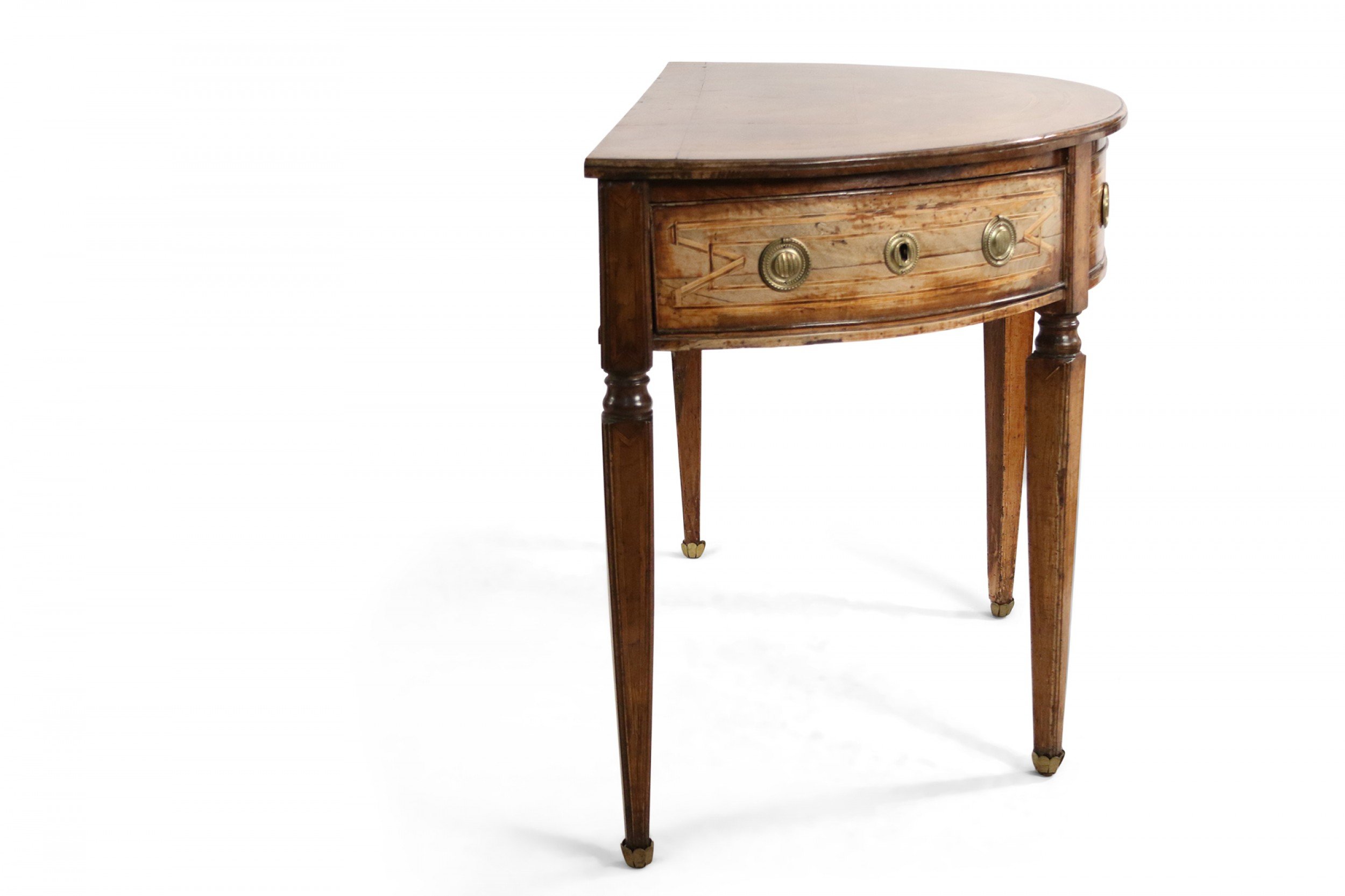 PAIR of English Sheraton (18th Century) demilune-shaped oak console tables with an inlaid compass patterned top, and 3 drawers with brass circular drawer pulls resting on four square tapered legs. (PRICED AS PAIR)