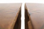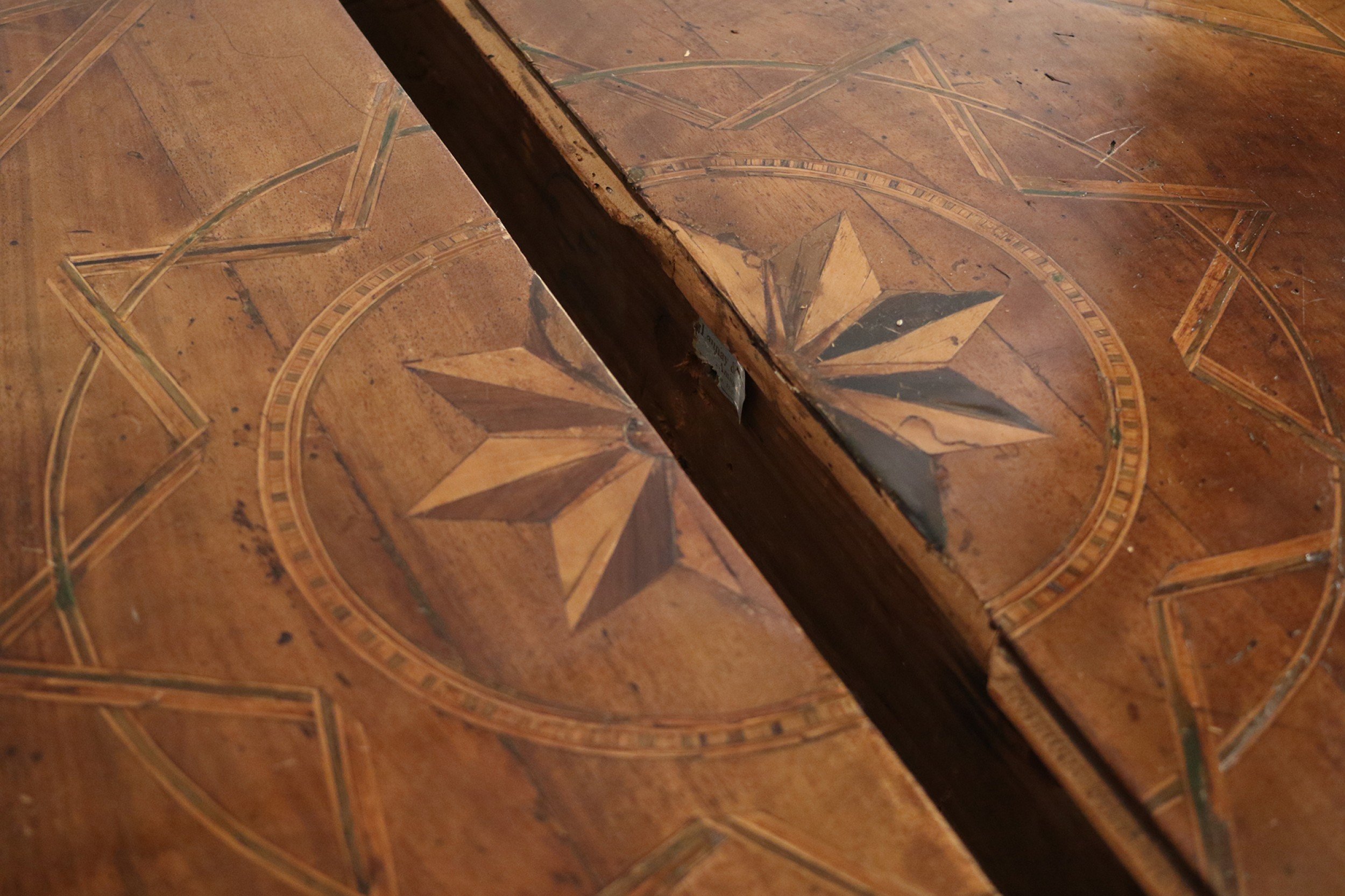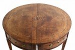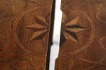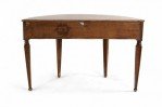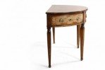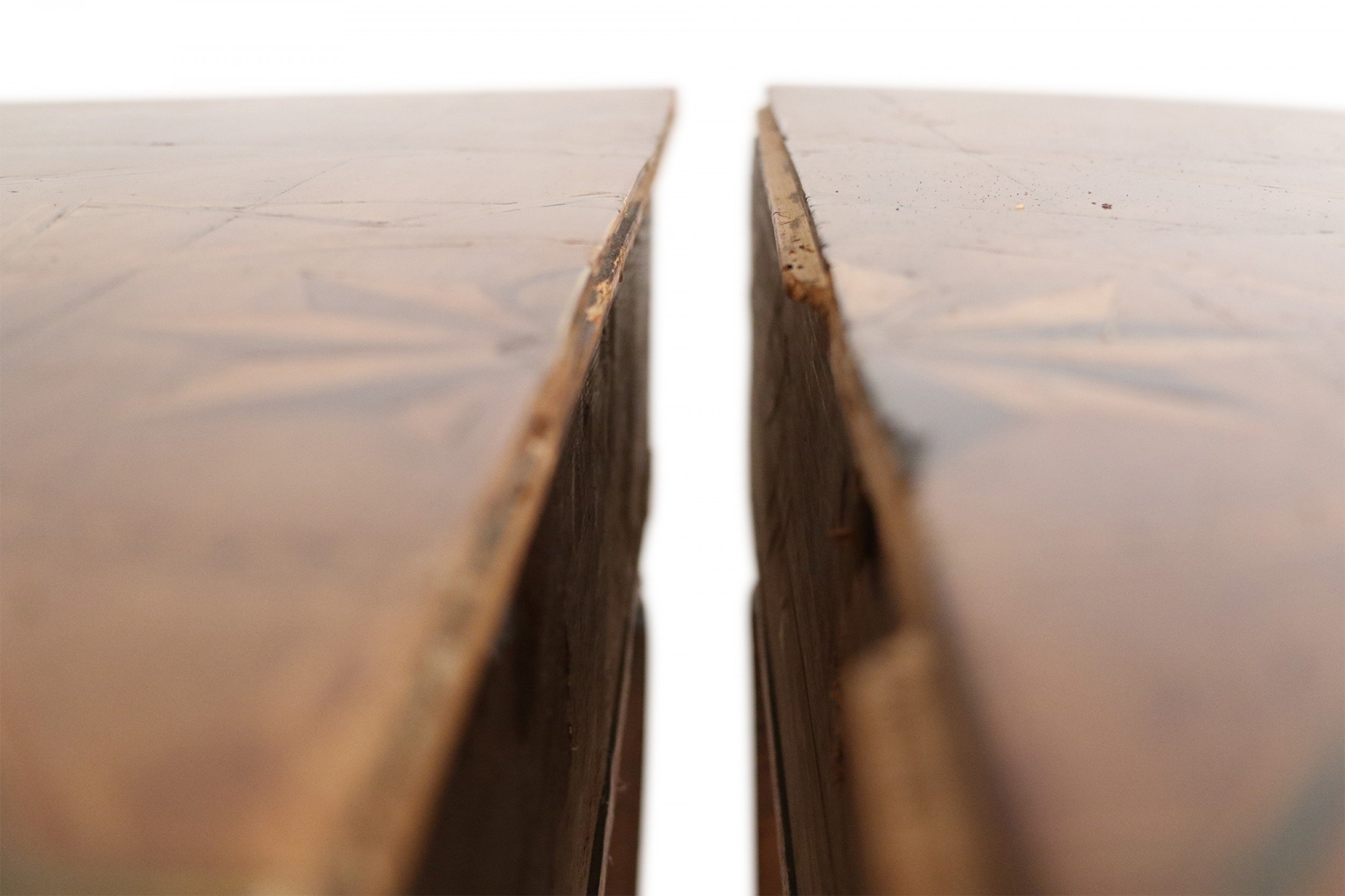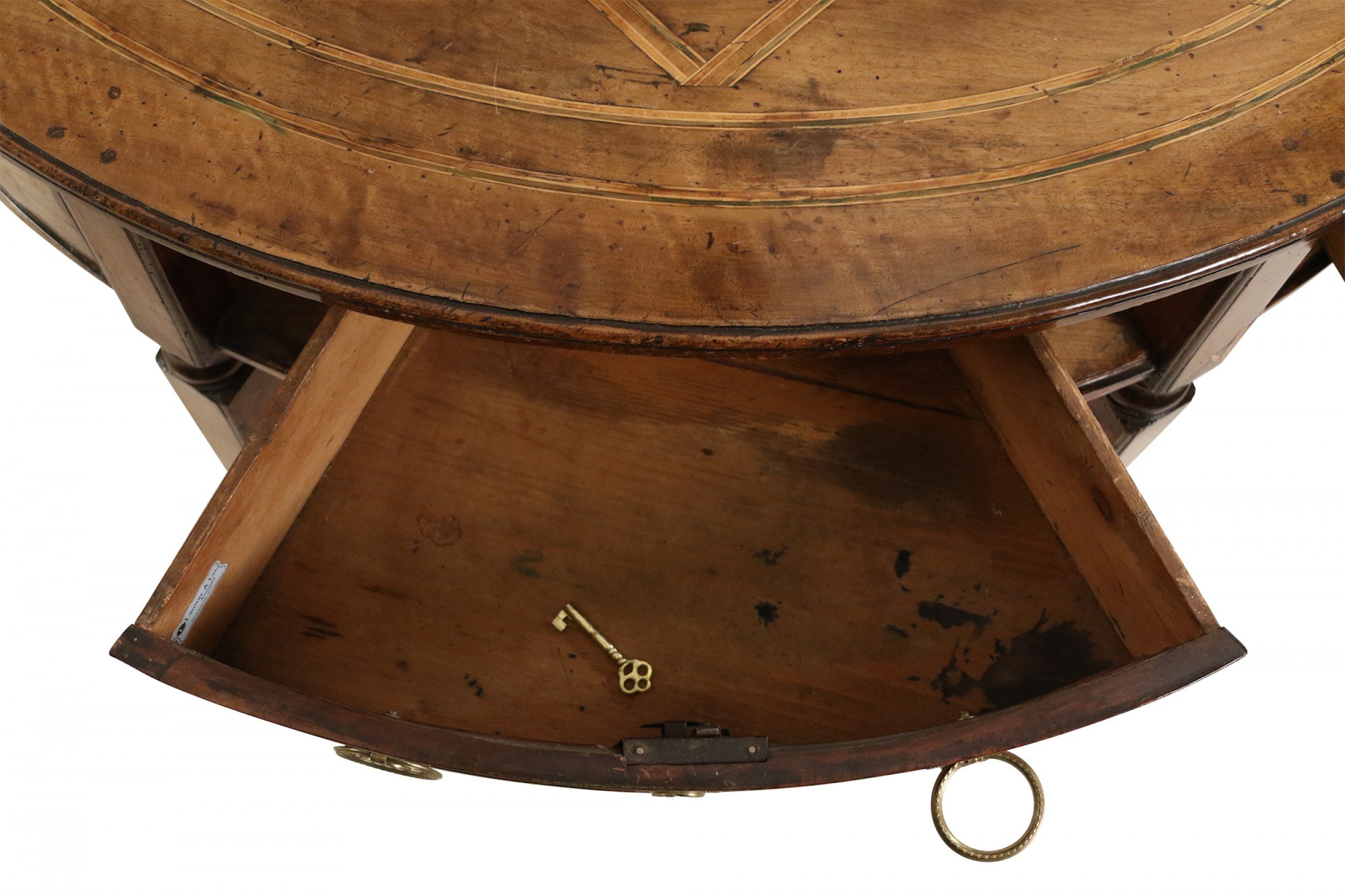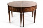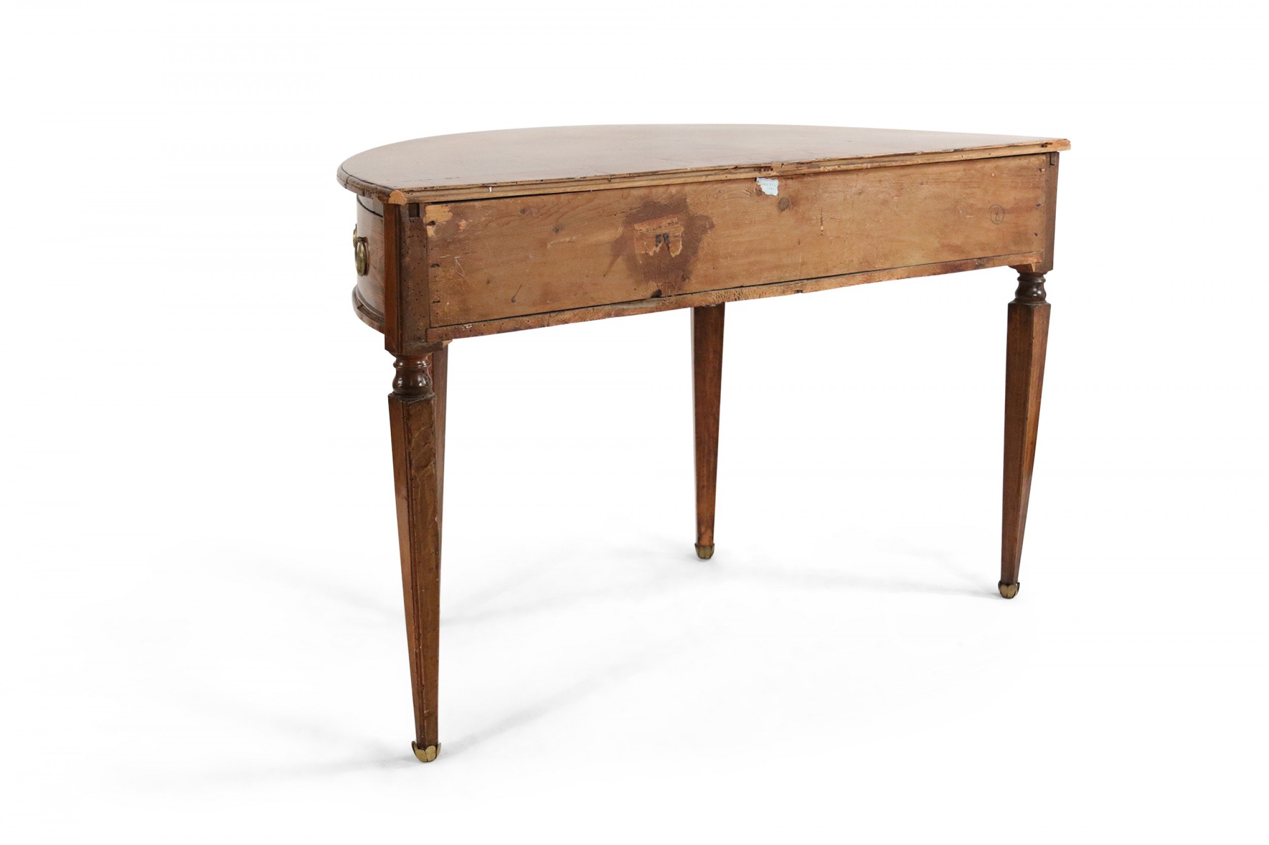 PAIR of English Sheraton (18th Century) demilune-shaped oak console tables with an inlaid compass patterned top, and 3 drawers with brass circular drawer pulls resting on four square tapered legs. (PRICED AS PAIR)