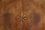 PAIR of English Sheraton (18th Century) demilune-shaped oak console tables with an inlaid compass patterned top, and 3 drawers with brass circular drawer pulls resting on four square tapered legs. (PRICED AS PAIR).
