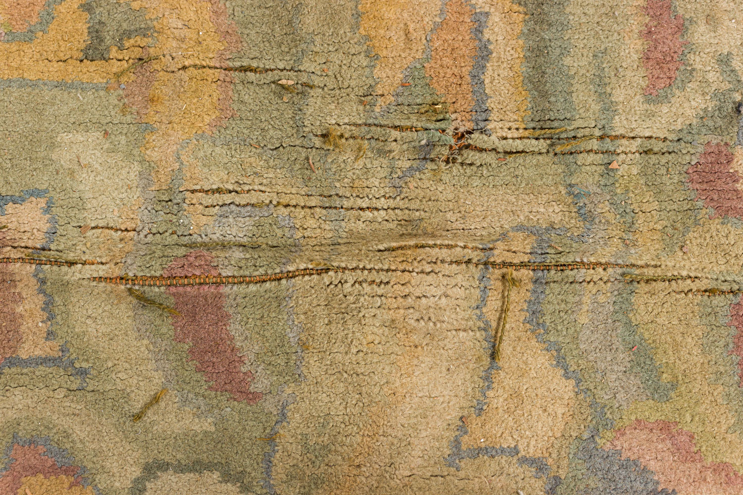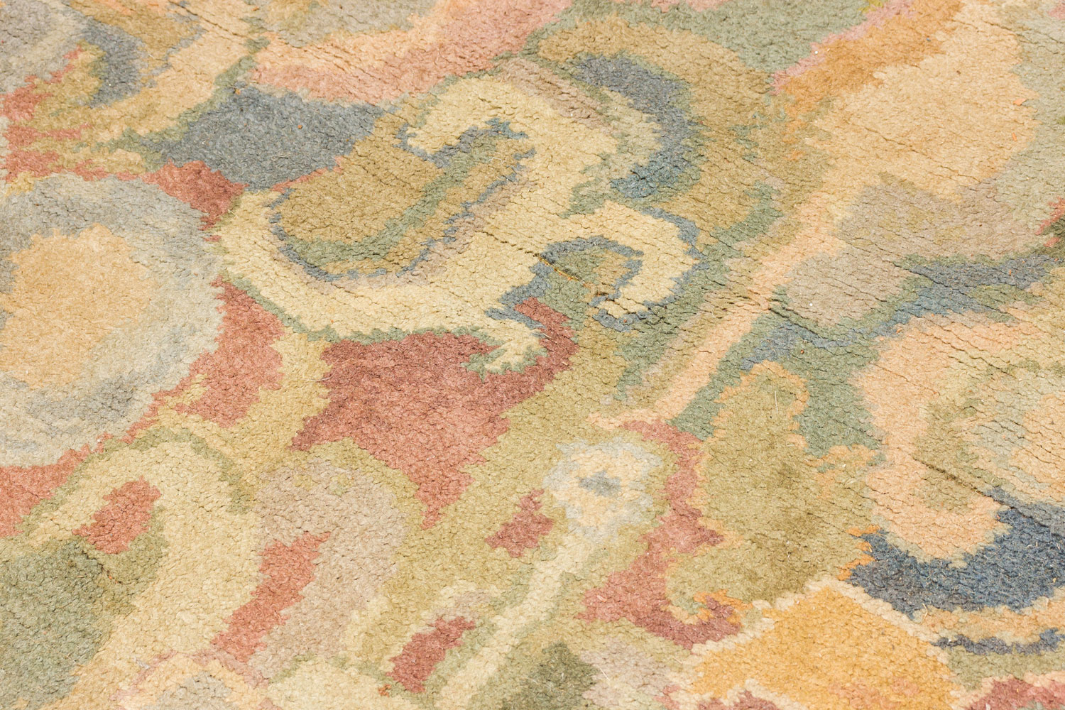 English Arts & Crafts wool rug carpet with pastel swirl design and border. Designed by Frank Brangwyn, R.A., circa 1930 for an exhibition of modern furnishings at E. Pollard and Company and produced by Templeton's Axminster, signed with artist's monogram in two of the corners. (JAMES TEMPLETON & CO., BY FRANK BRANGWYN) (15 x 11.5') (AS IS-damages) (ref: rug in the V&A http://collections.vam.ac.uk/item/O68310/carpet/carpet-brangwynfrank/.