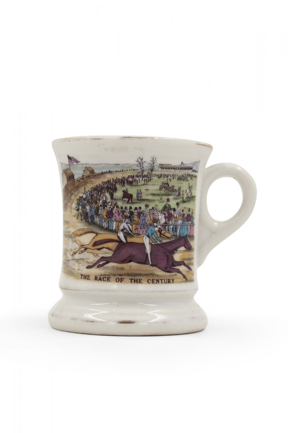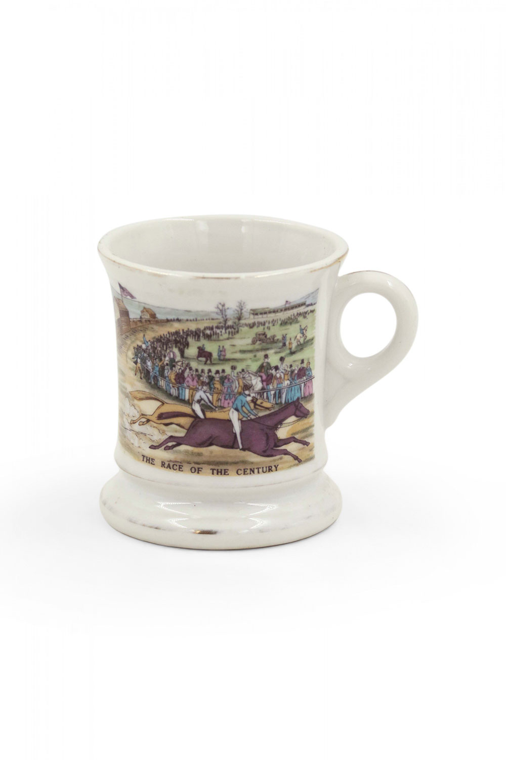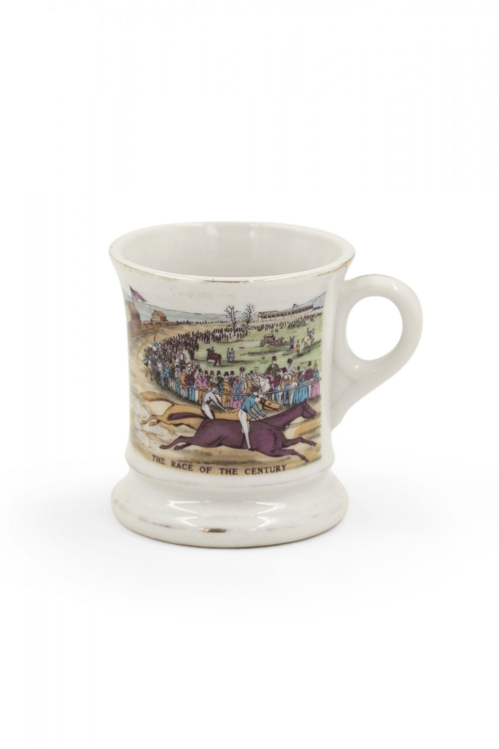 English (19th Century) footed shaving mug with traces of gilding depicting a horse racing scene.
