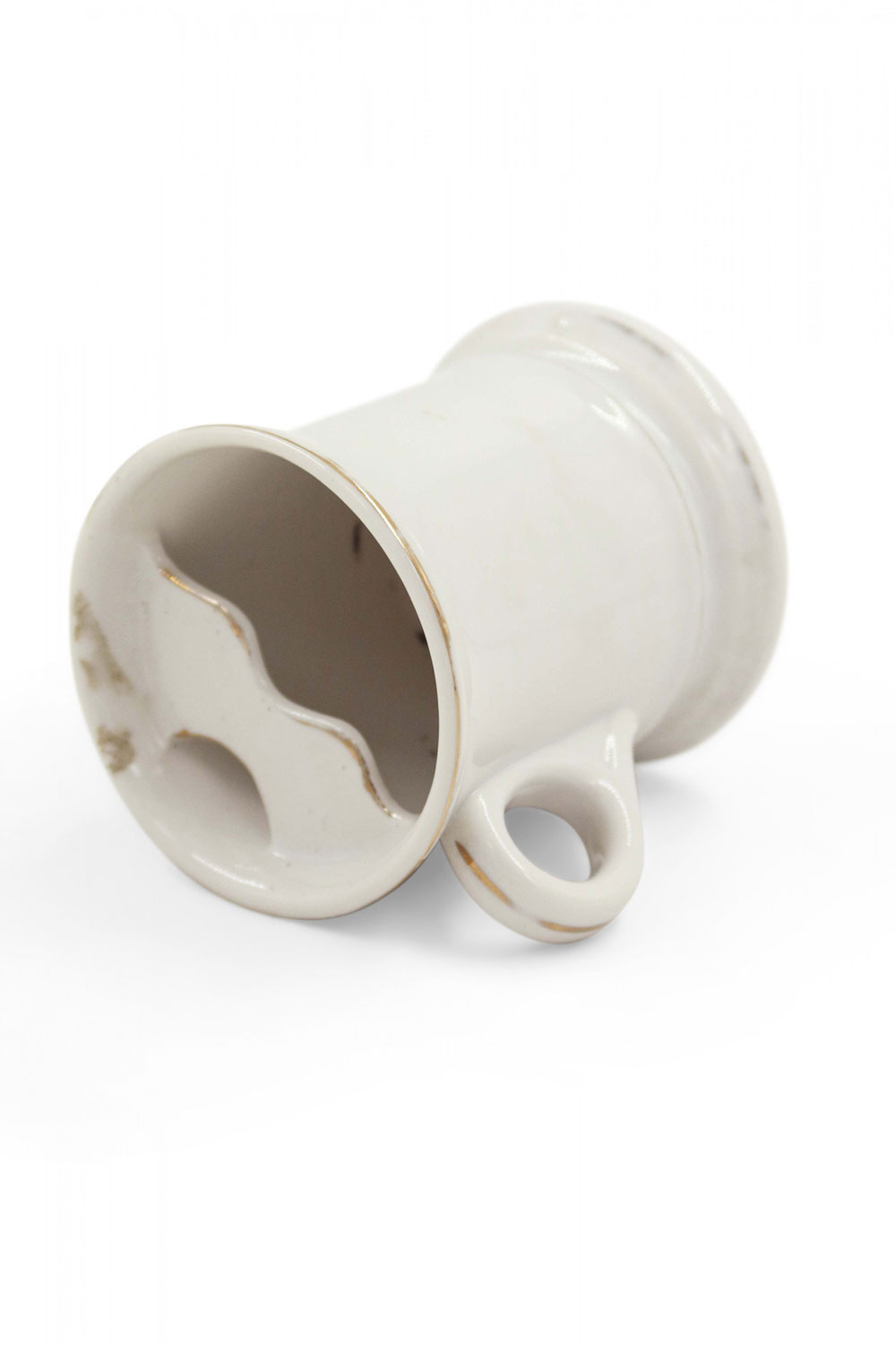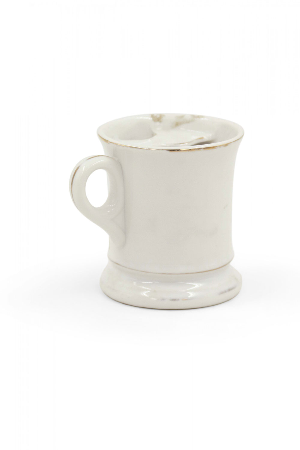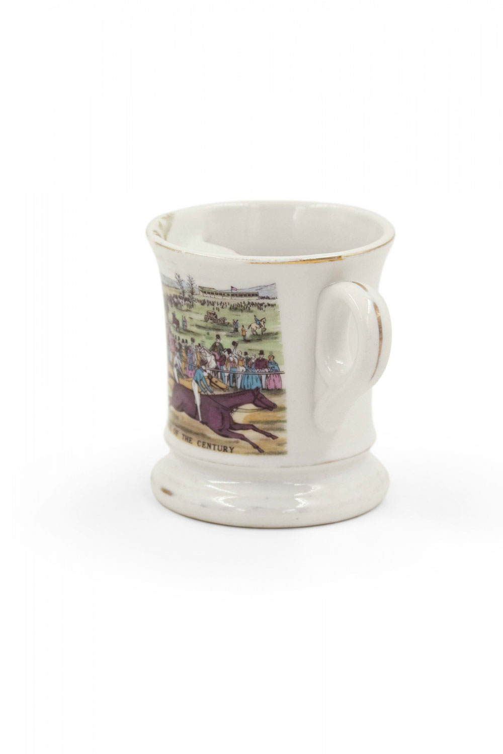 English (19th Century) footed shaving mug with traces of gilding depicting a horse racing scene..
