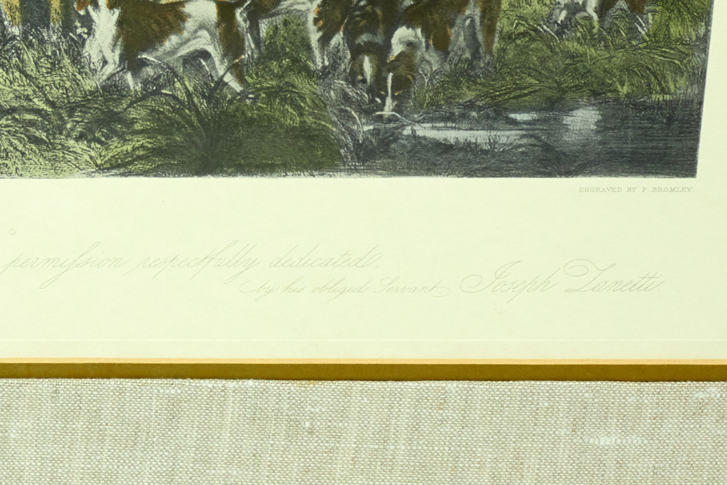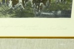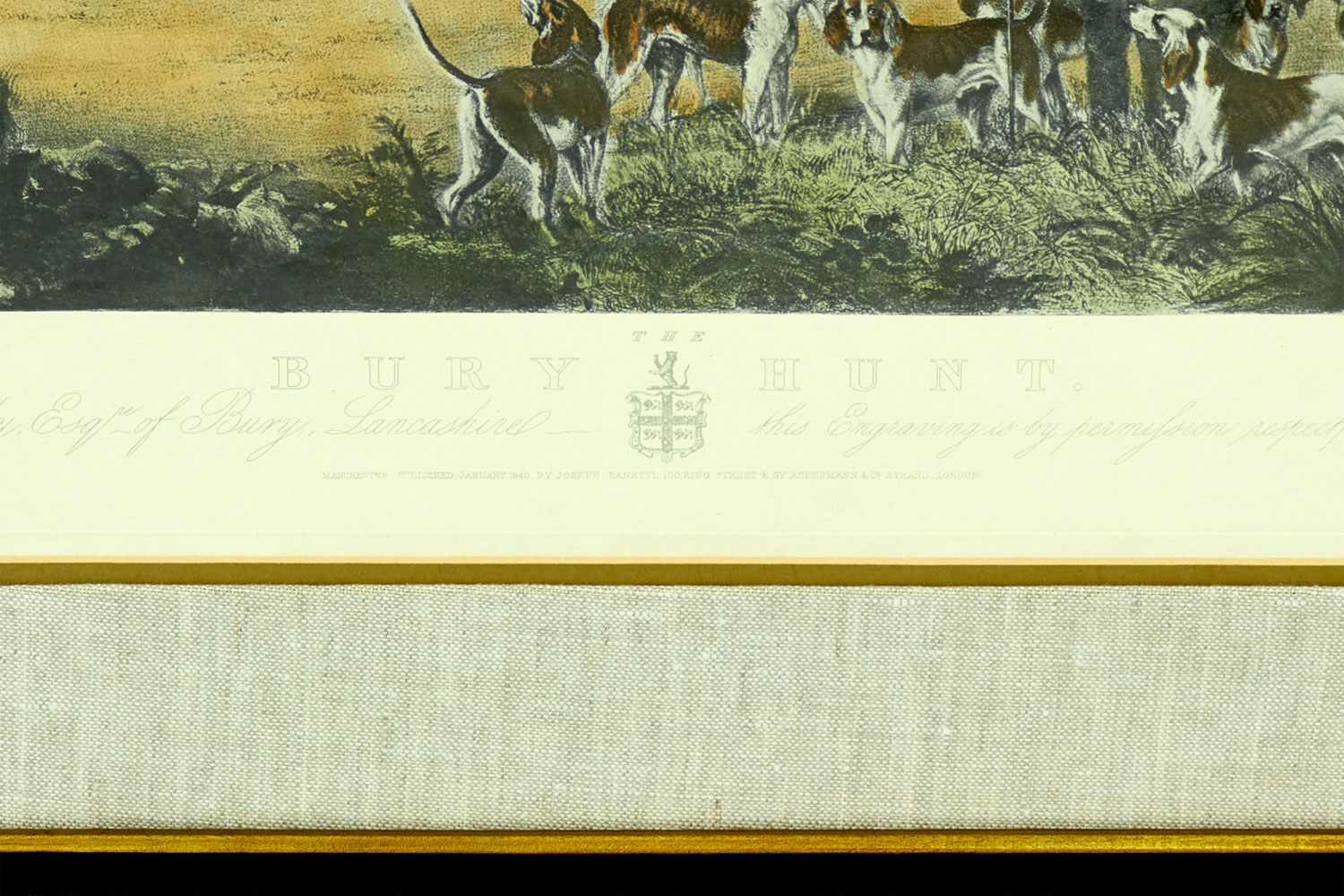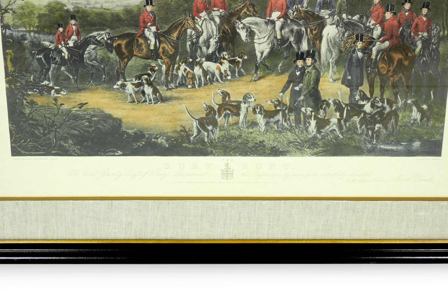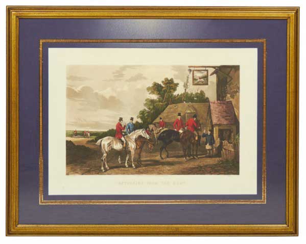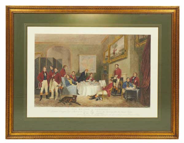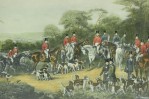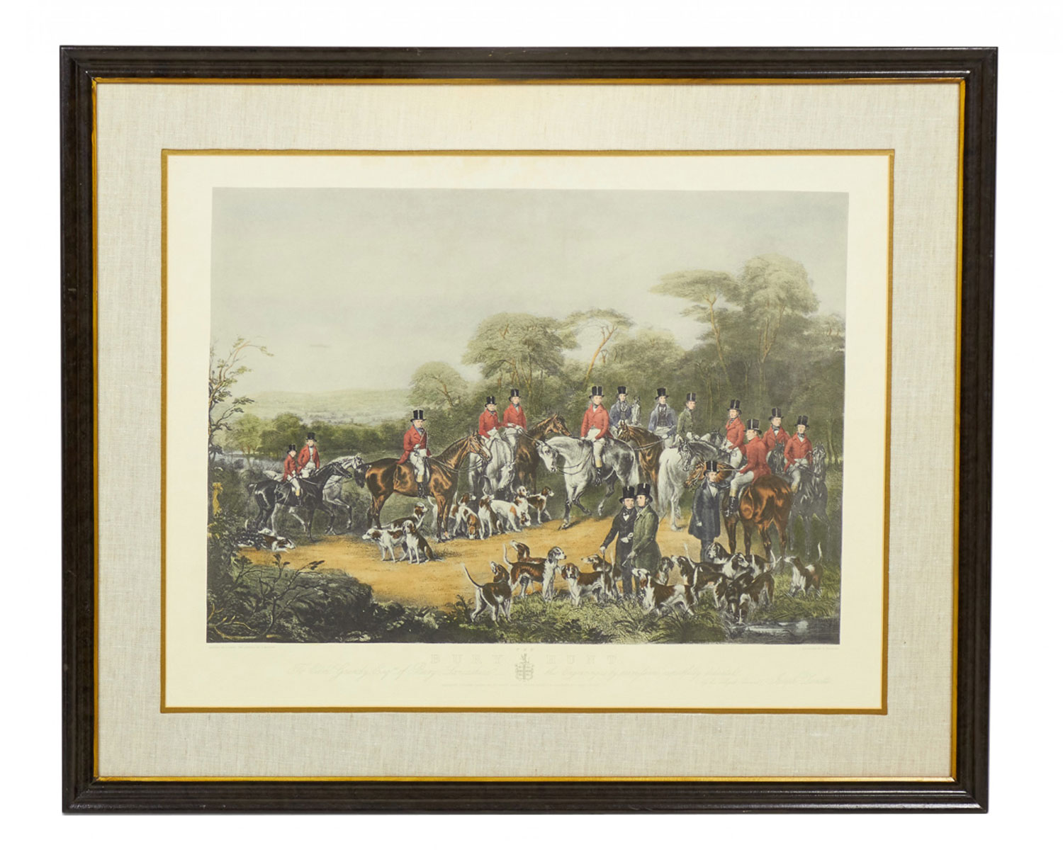 English Victorian style print of an equestrian scene depicting a meeting of the Bury Hunt in the 1830s including thirteen mounted riders, three smartly dressed attendants and a pack of hounds are waiting for the 'set off,' in a rectangular wooden frame with a beige and gray double mat. (similar items 062902-062921)