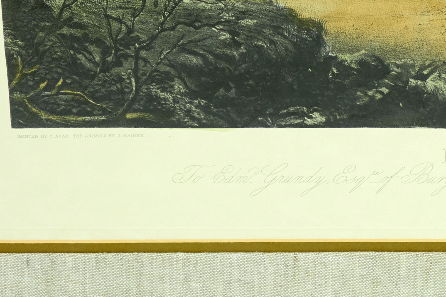 English Victorian style print of an equestrian scene depicting a meeting of the Bury Hunt in the 1830s including thirteen mounted riders, three smartly dressed attendants and a pack of hounds are waiting for the 'set off,' in a rectangular wooden frame with a beige and gray double mat. (similar items 062902-062921).