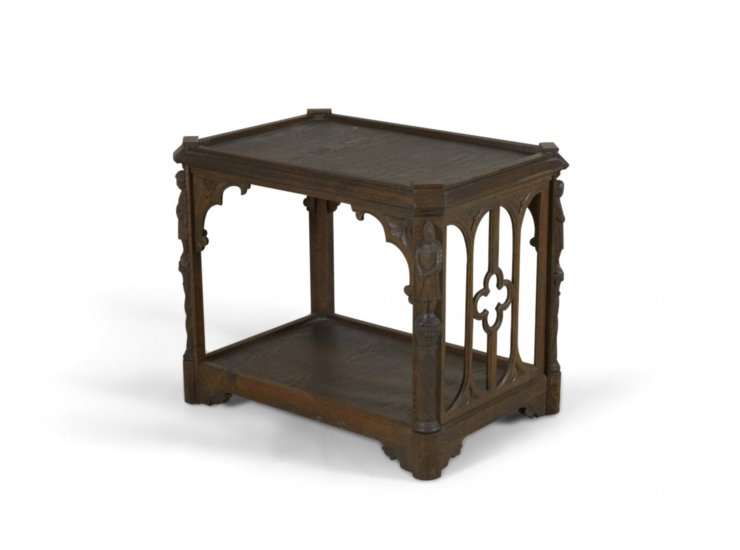 English Gothic style (early 20th century) oak end table with twisted pilaster corners surmounted by carved knight figures (marked: BELGIUM).
