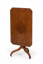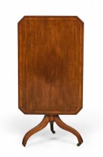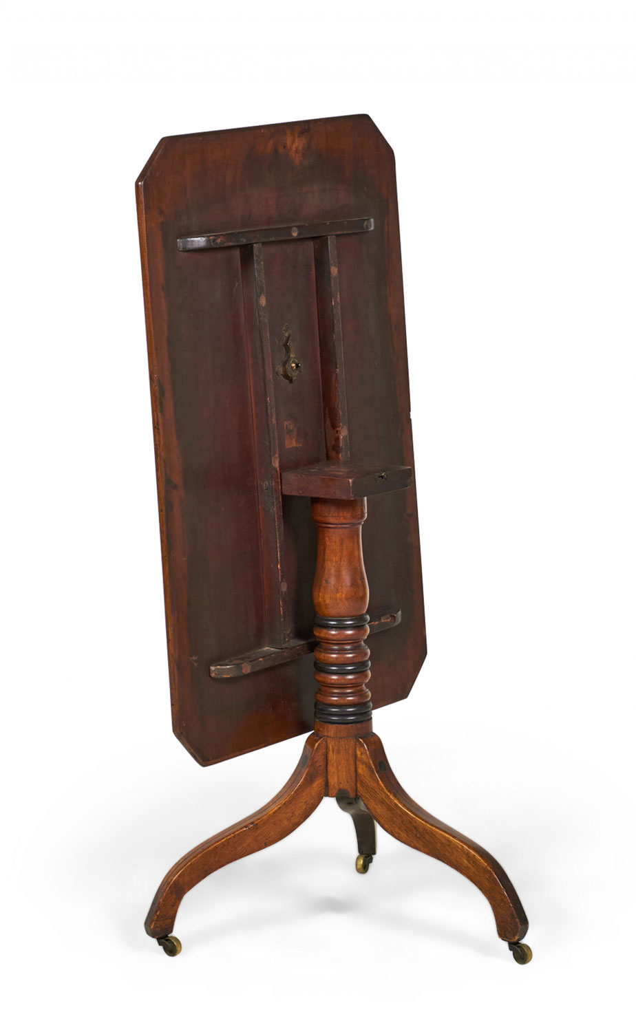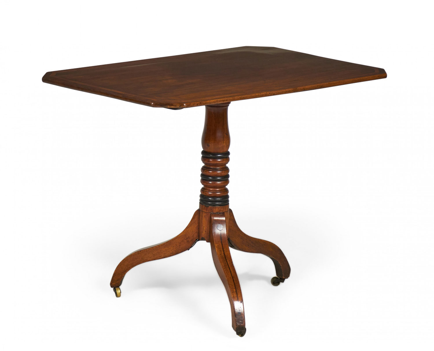 English Sheraton (18/19th Century) mahogany rectangular tilt-top end / tea table with canted corners resting on a turned pedestal base ending in three curved legs with brass casters.