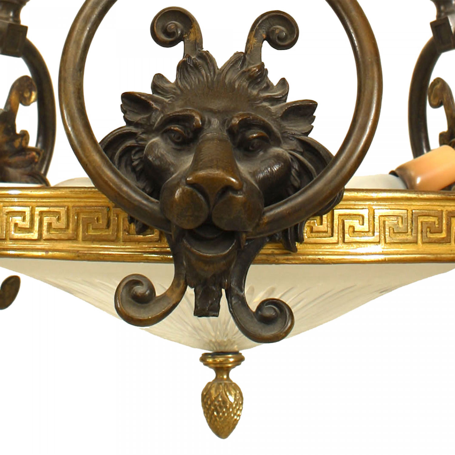 Bronze English Regency pendant chandelier comprised of a circular cut glass shade placed within a Greek key frame and suspended from decorative rods featuring three lion heads support links..