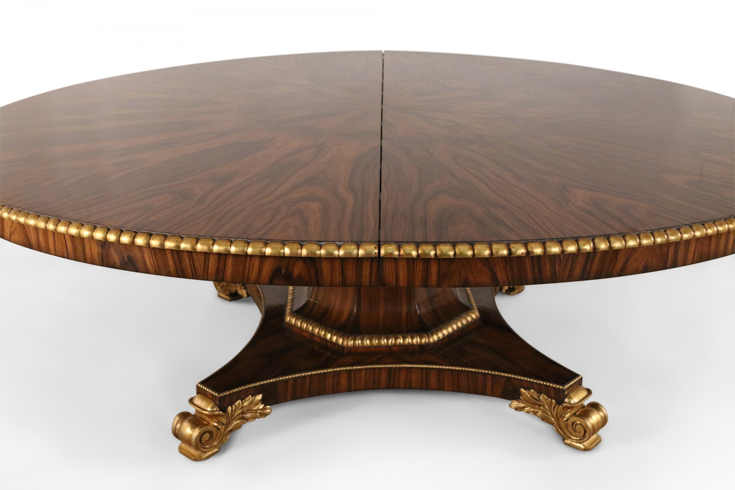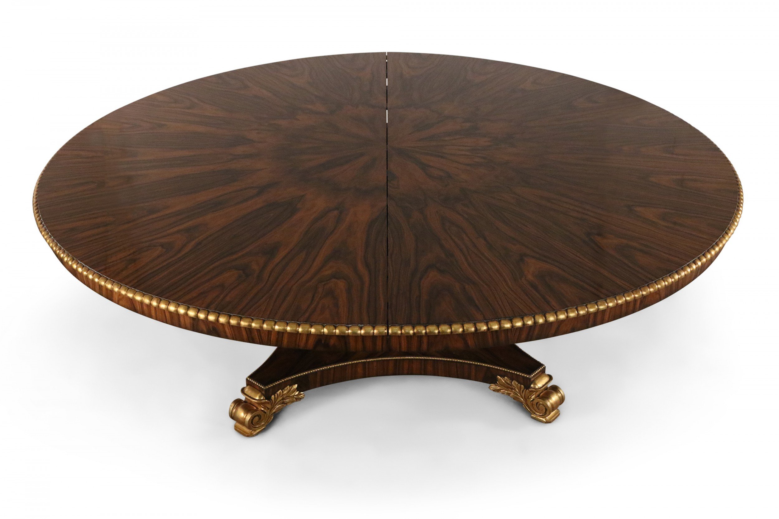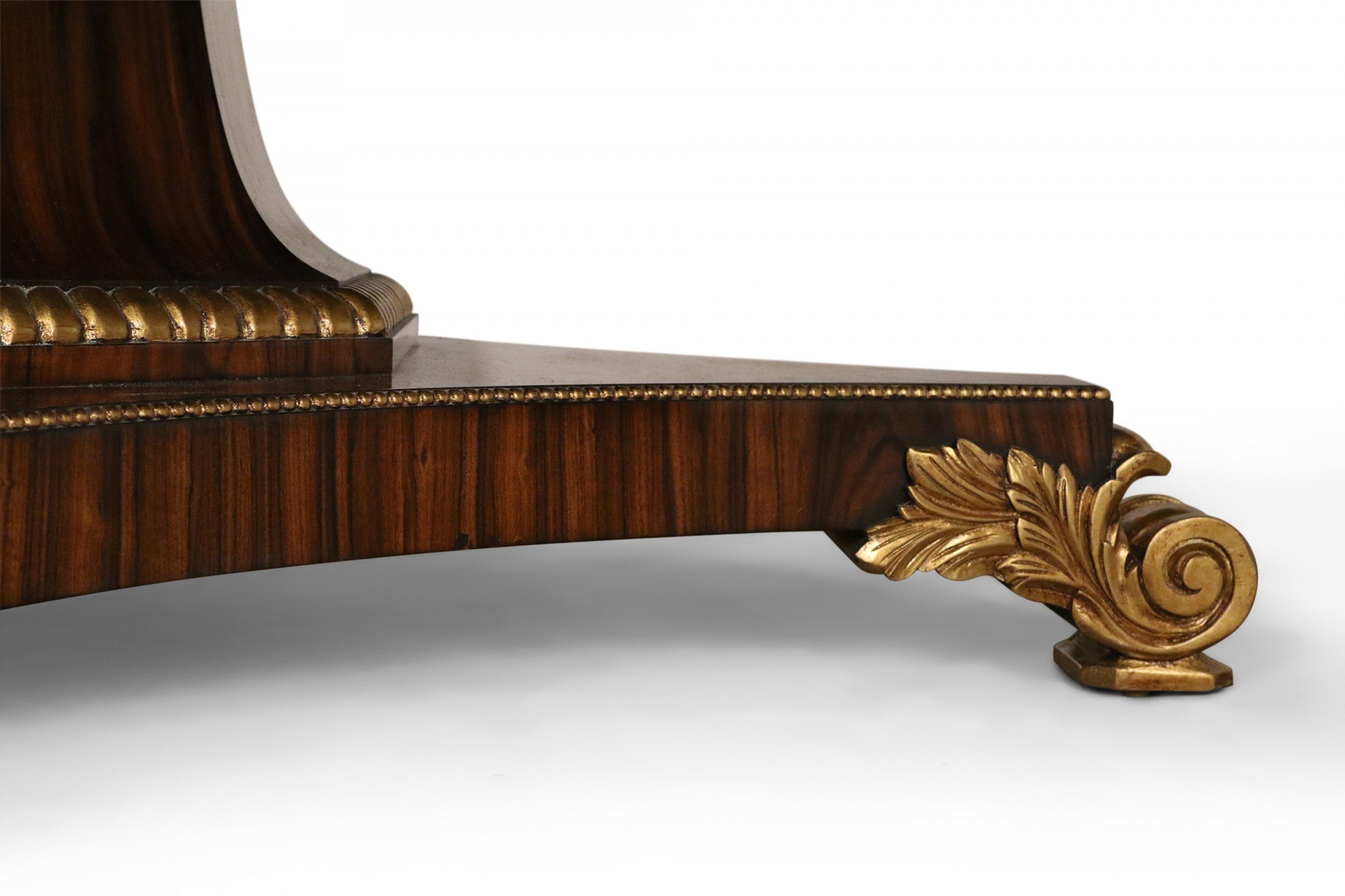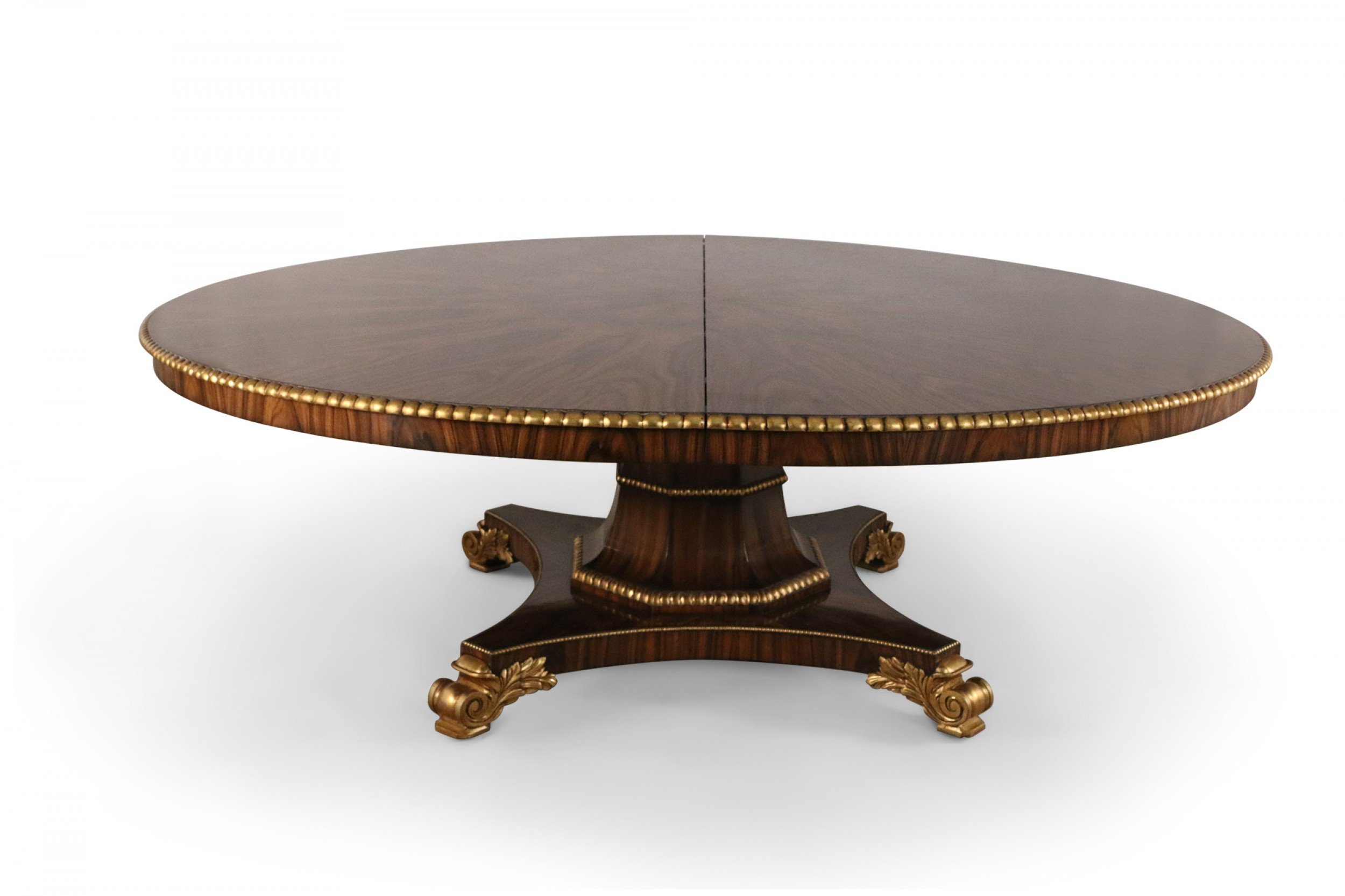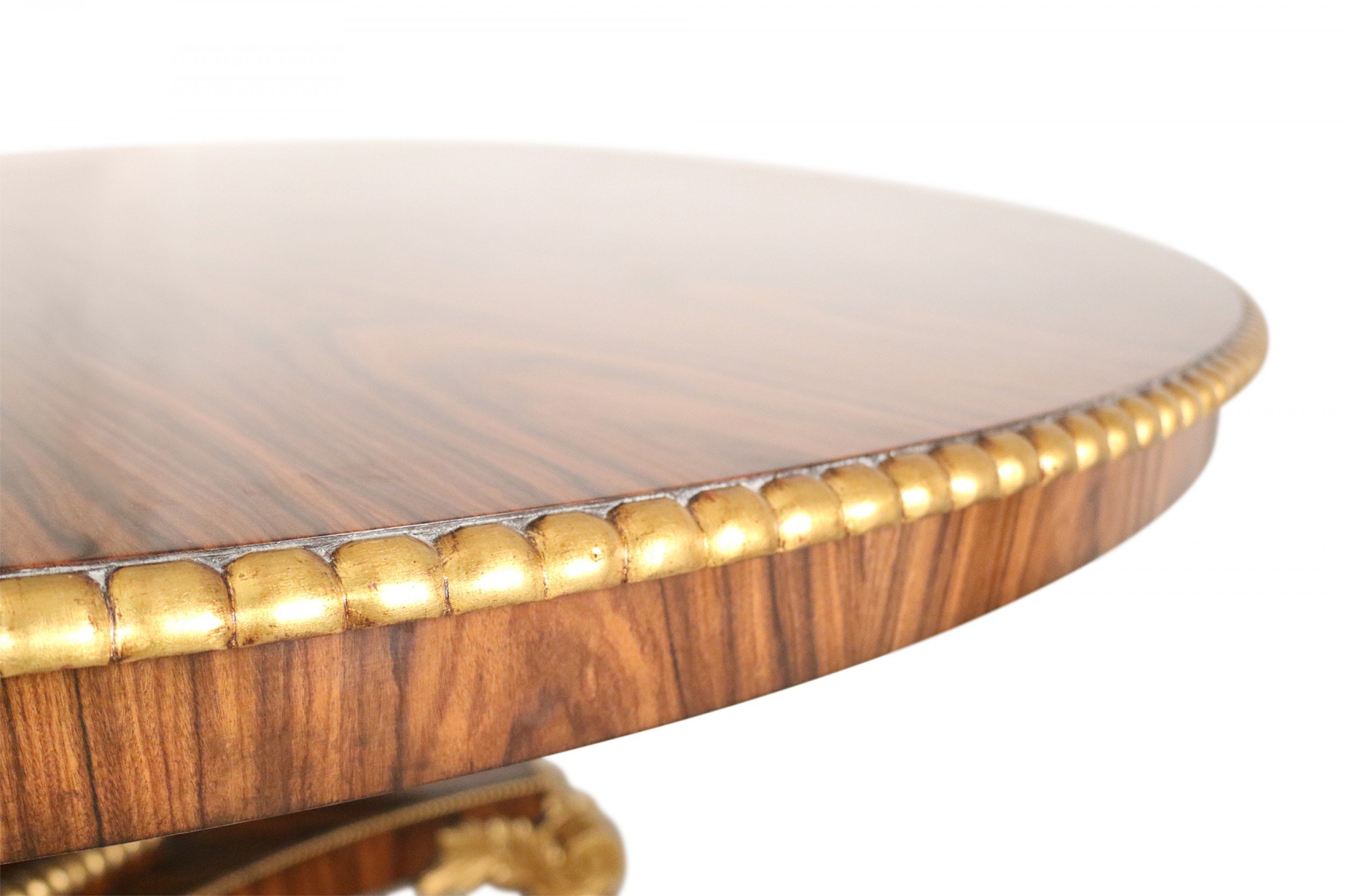 English Regency style circular mahogany pedestal base center table with carved detail and giltwood trim.