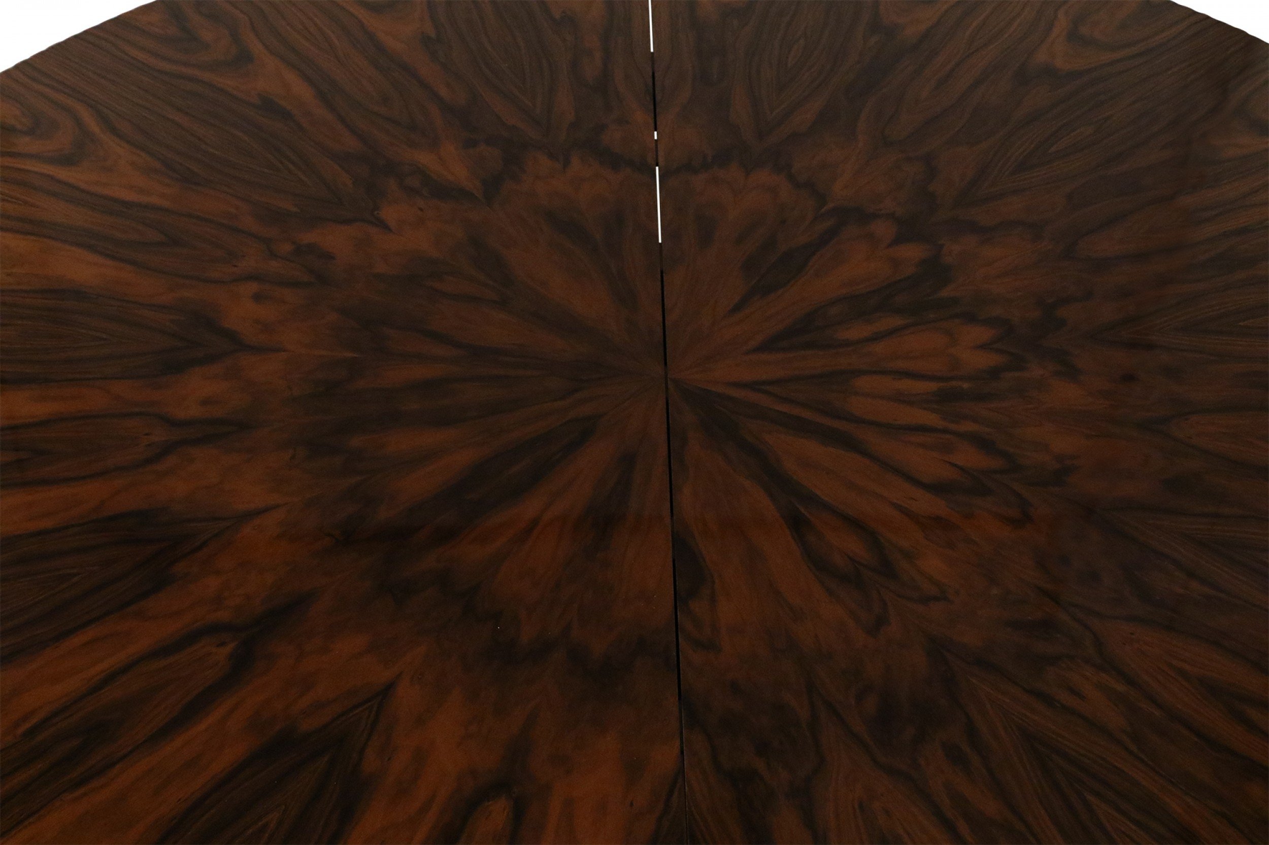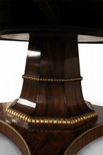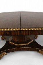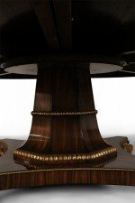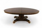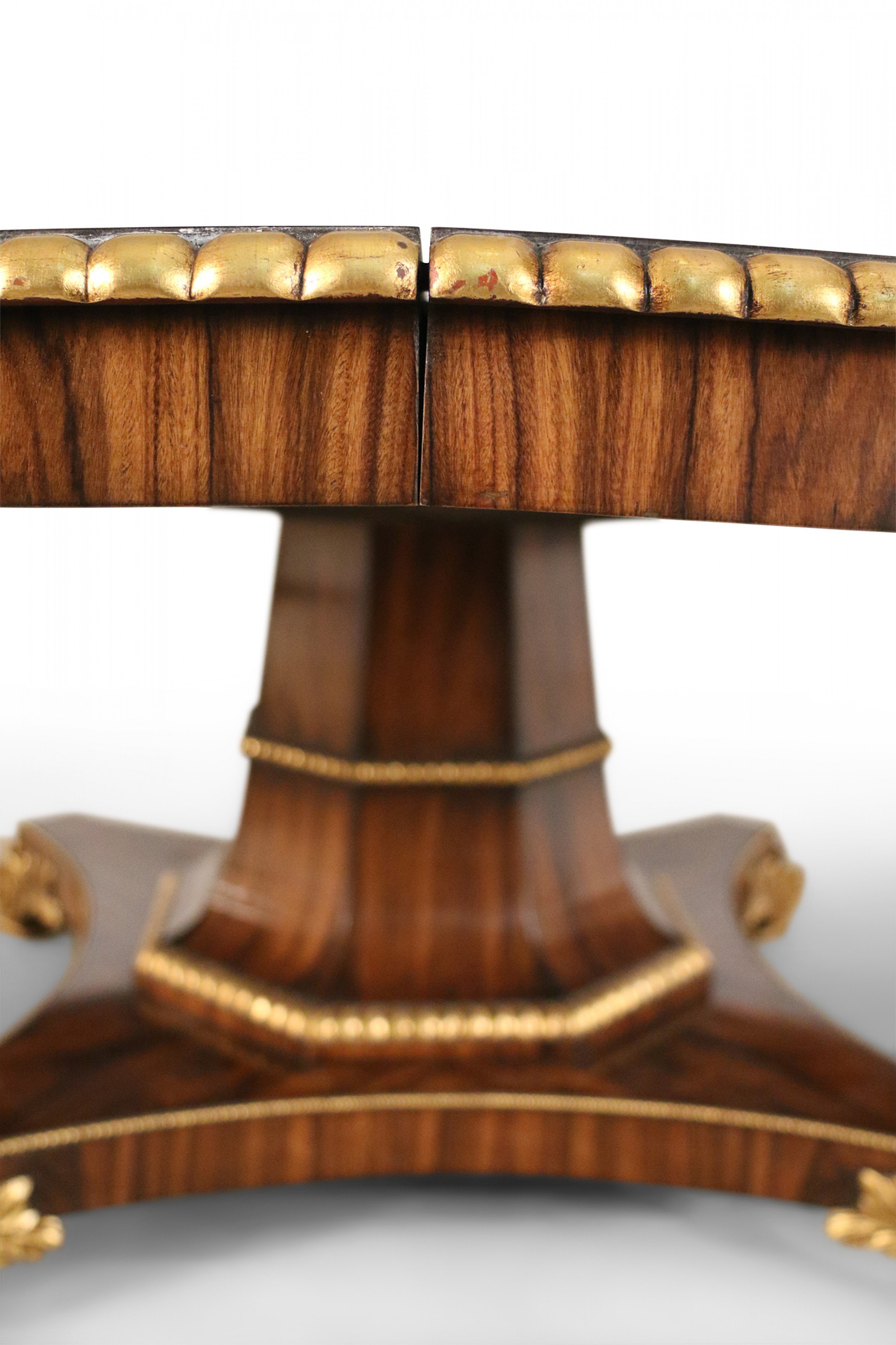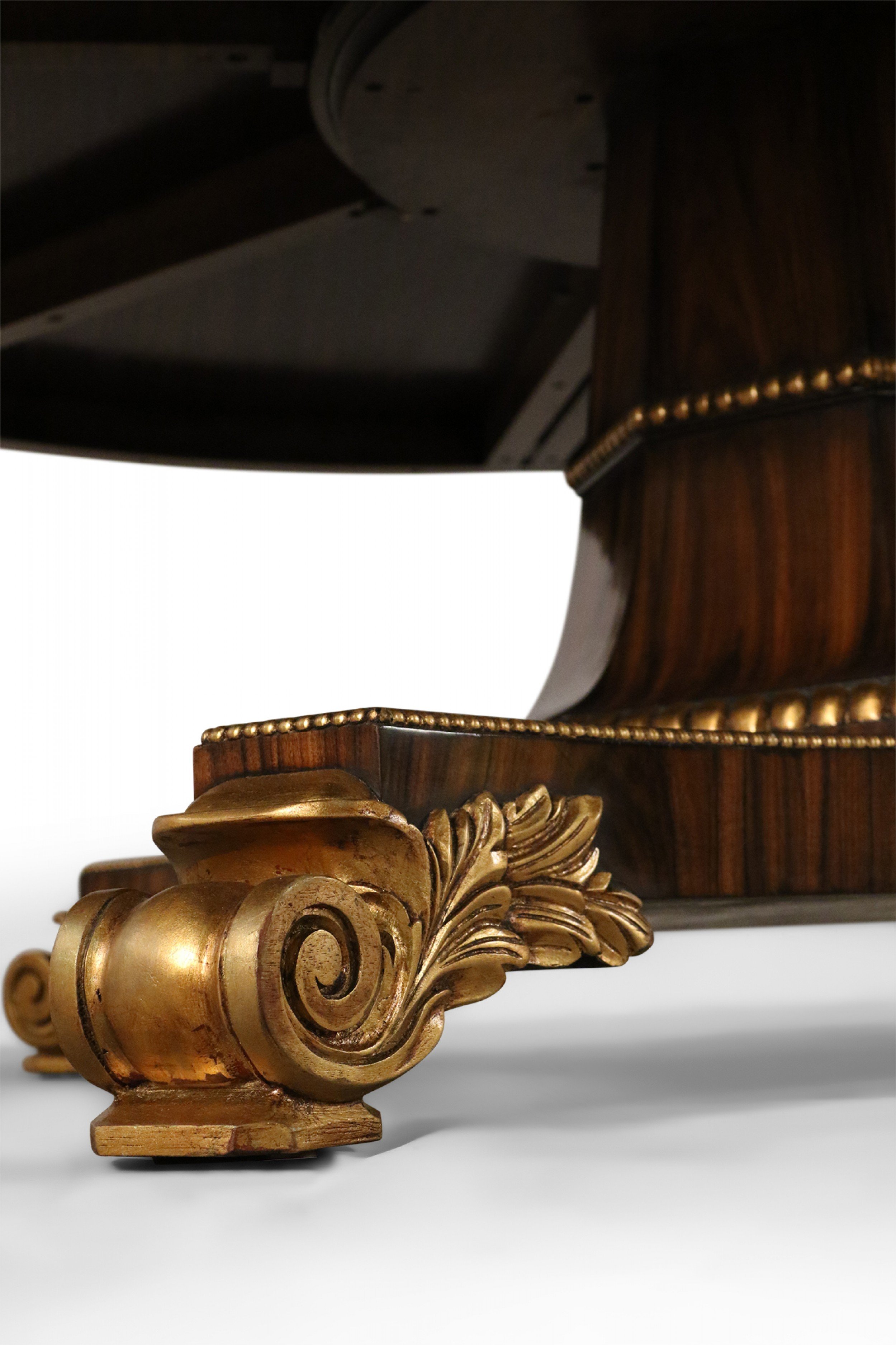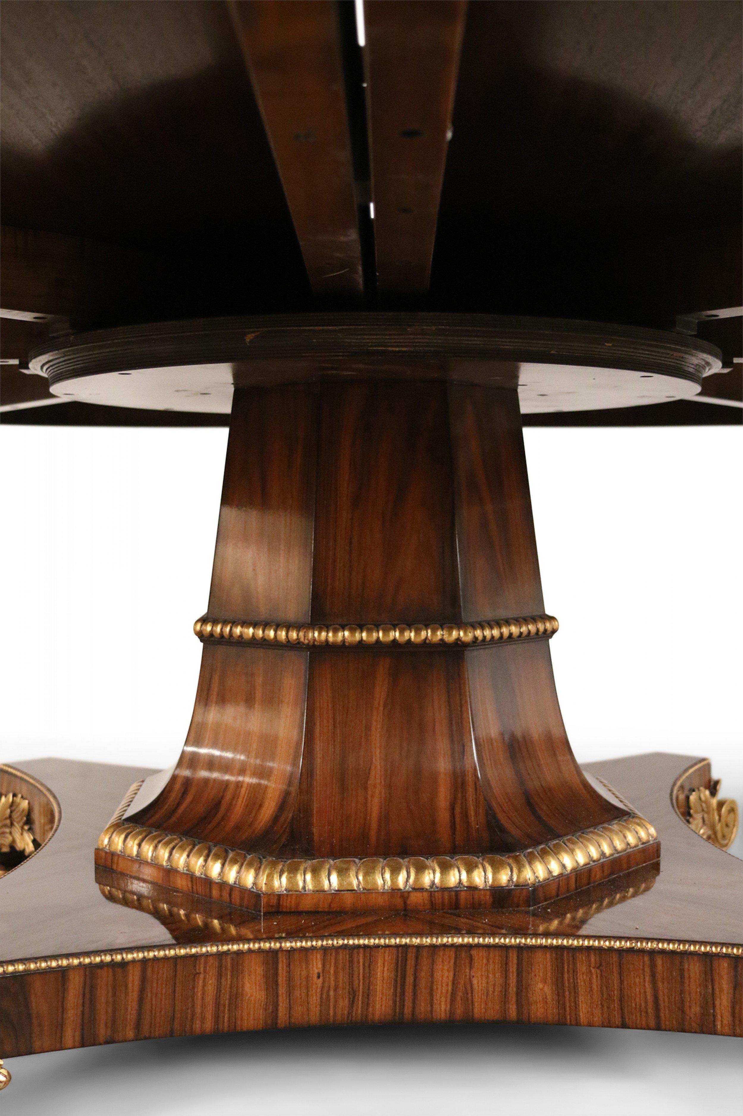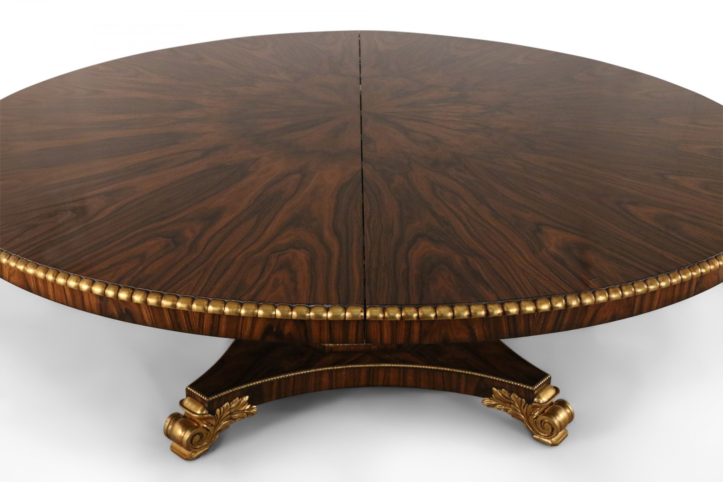 English Regency style circular mahogany pedestal base center table with carved detail and giltwood trim.