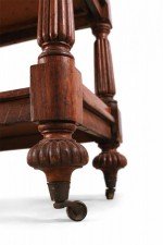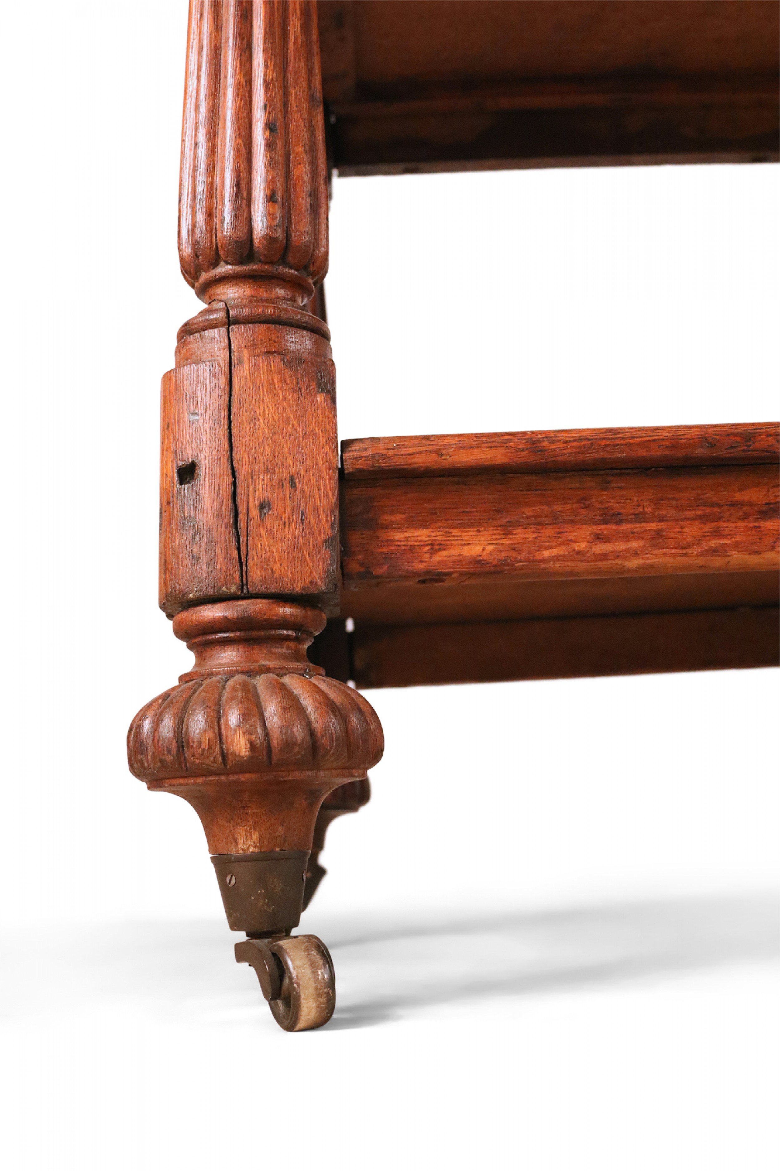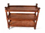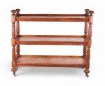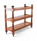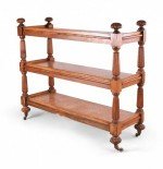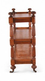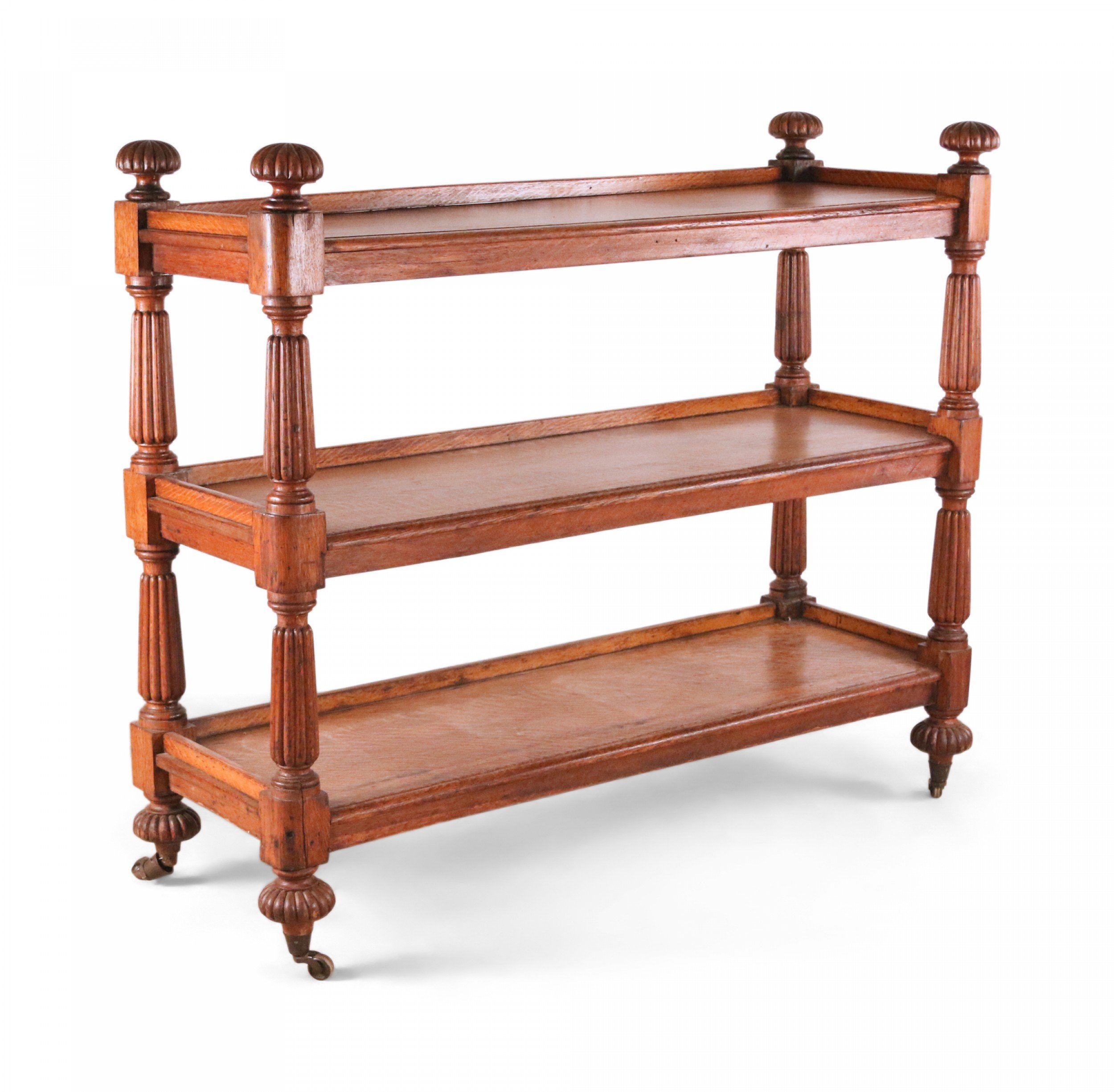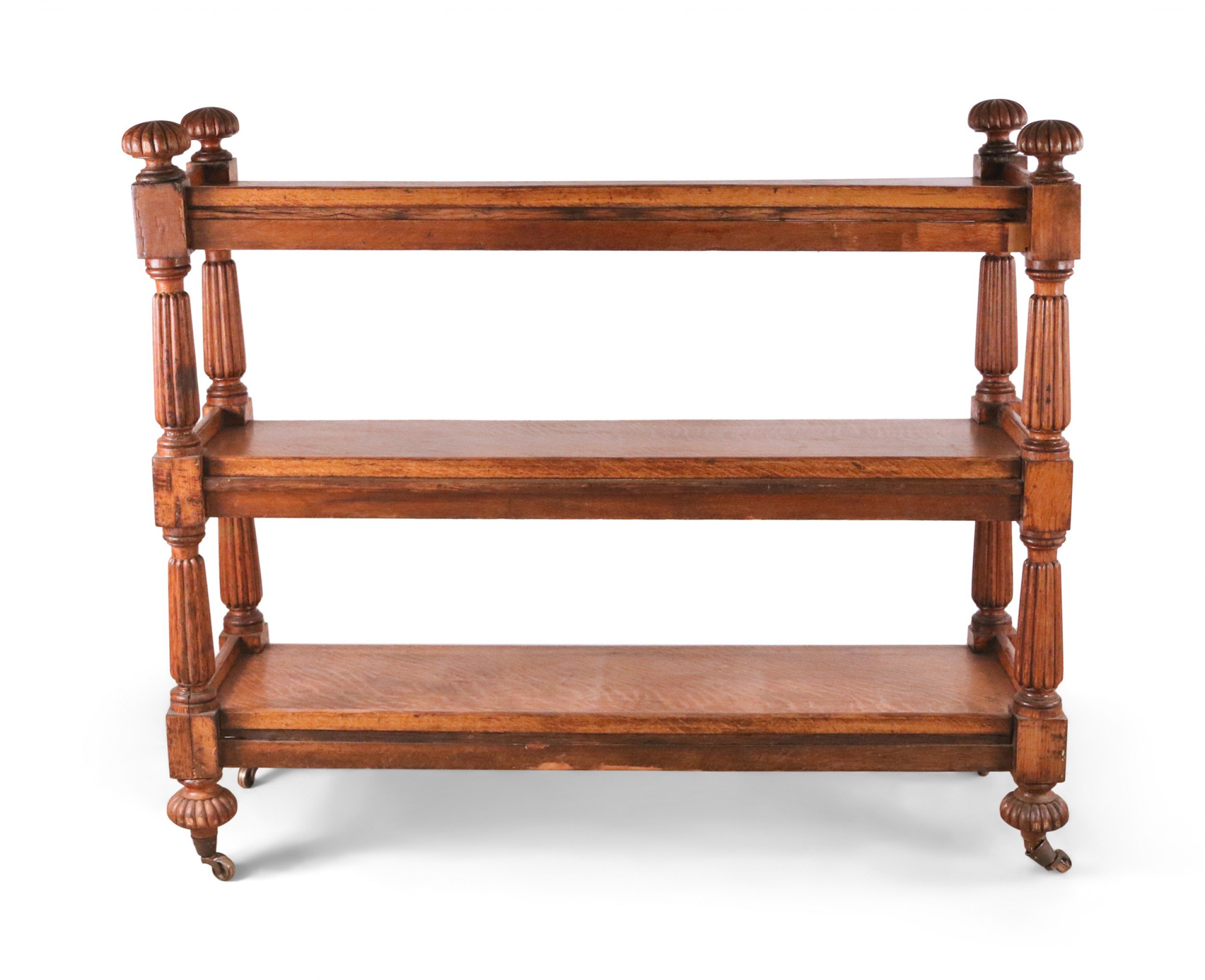English Regency oak three shelf etagere with reeded ball finials and supports on casters..