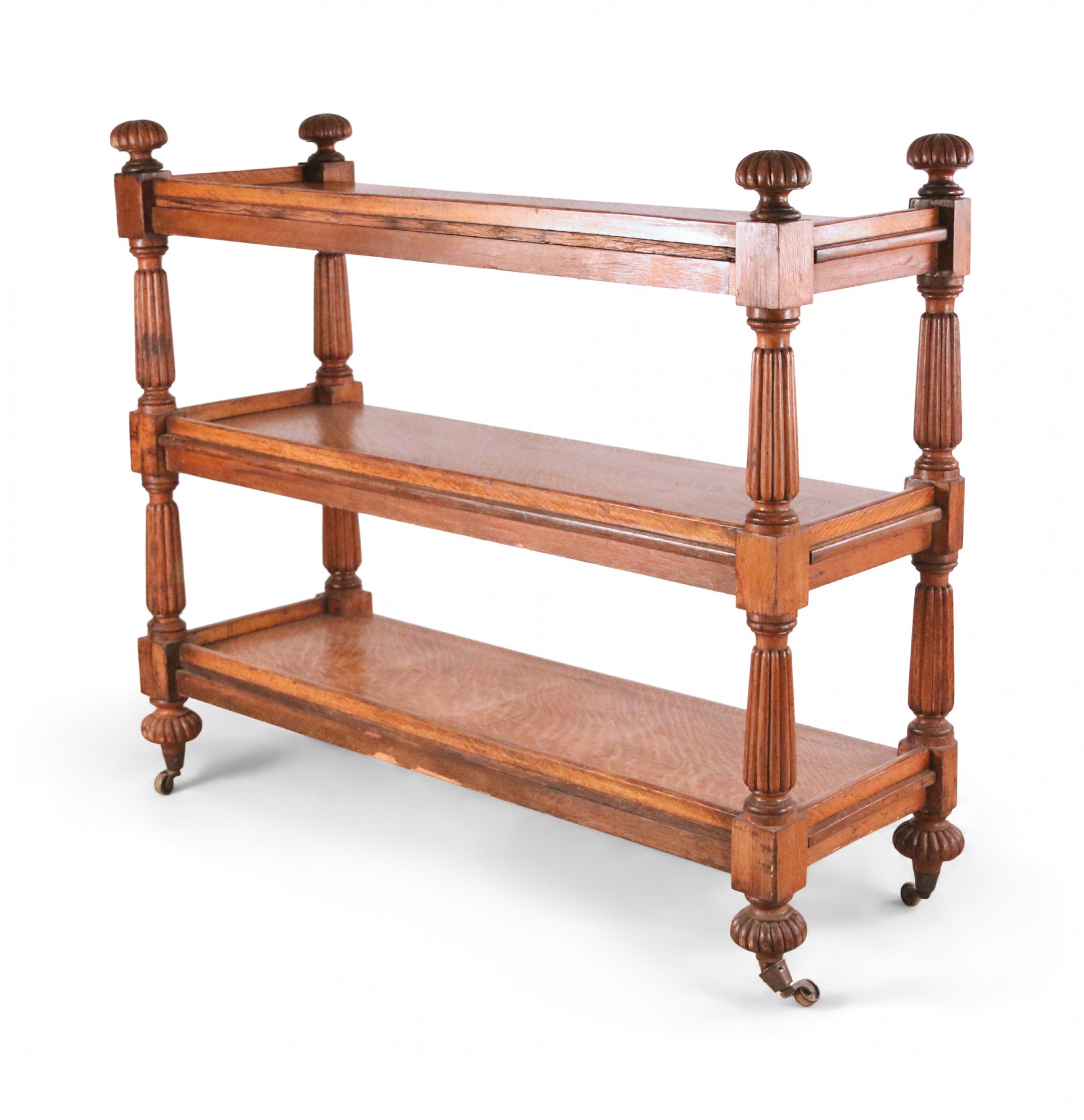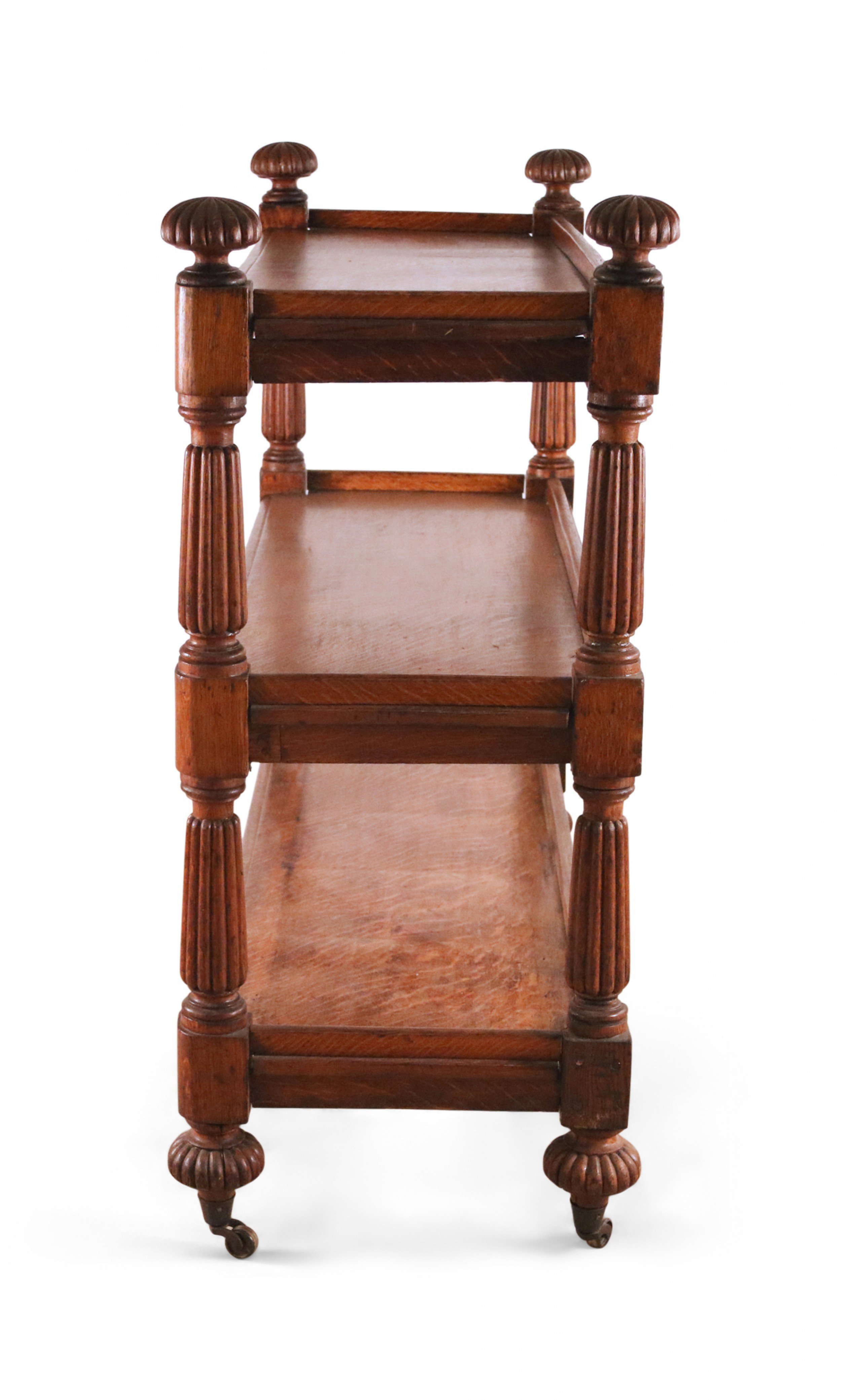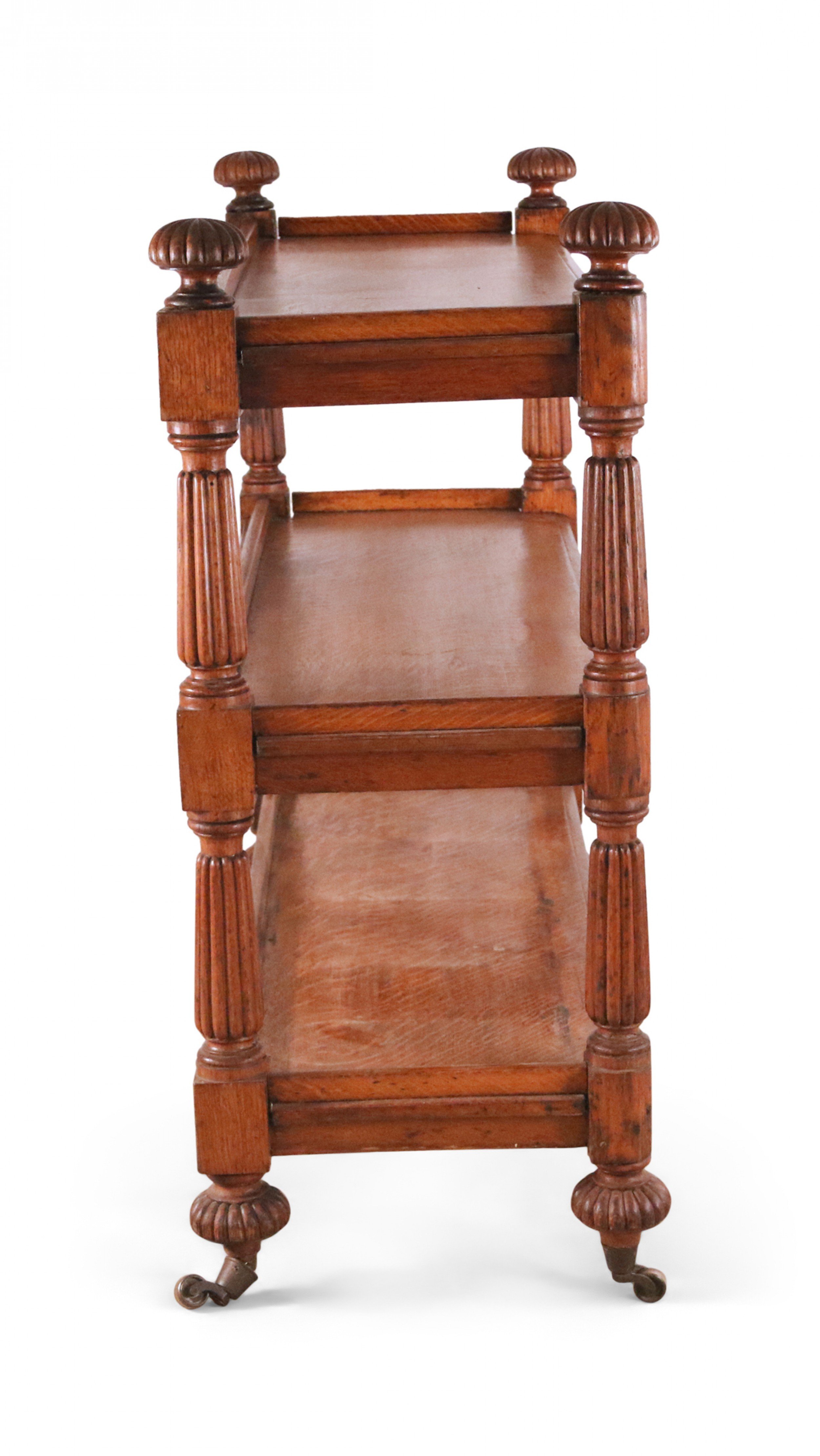 English Regency oak three shelf etagere with reeded ball finials and supports on casters.