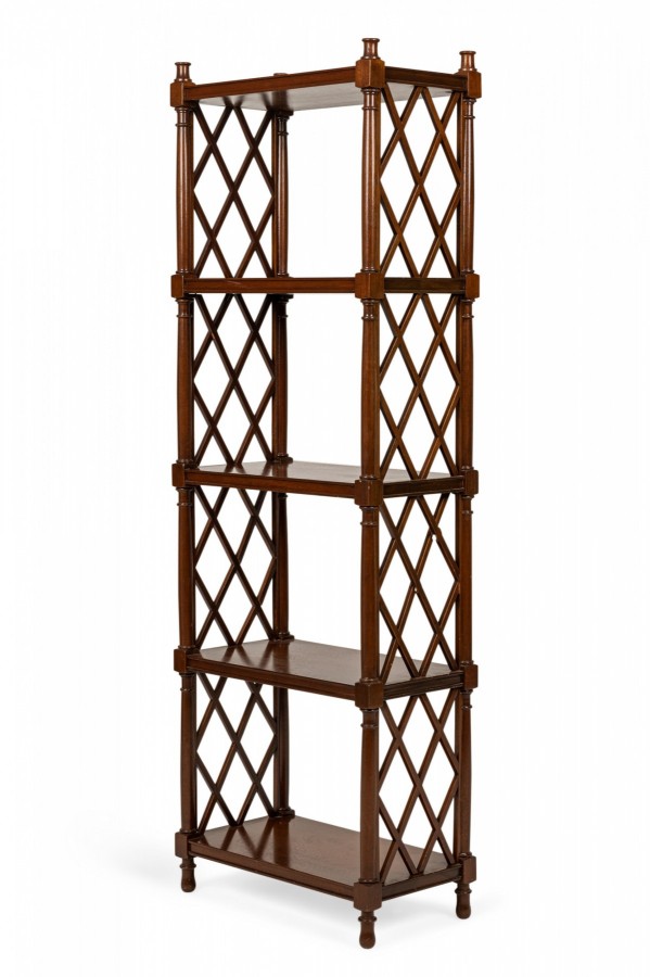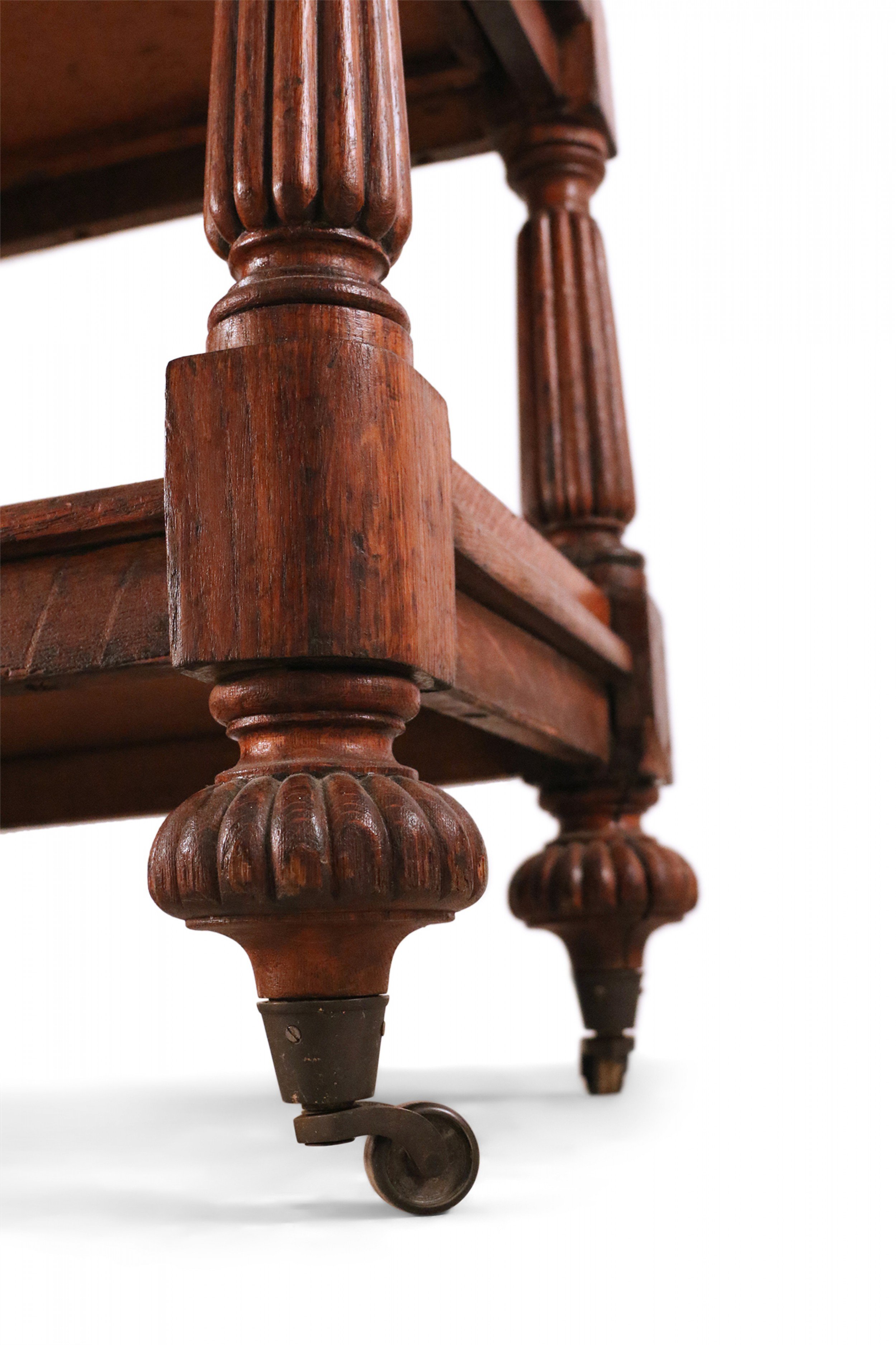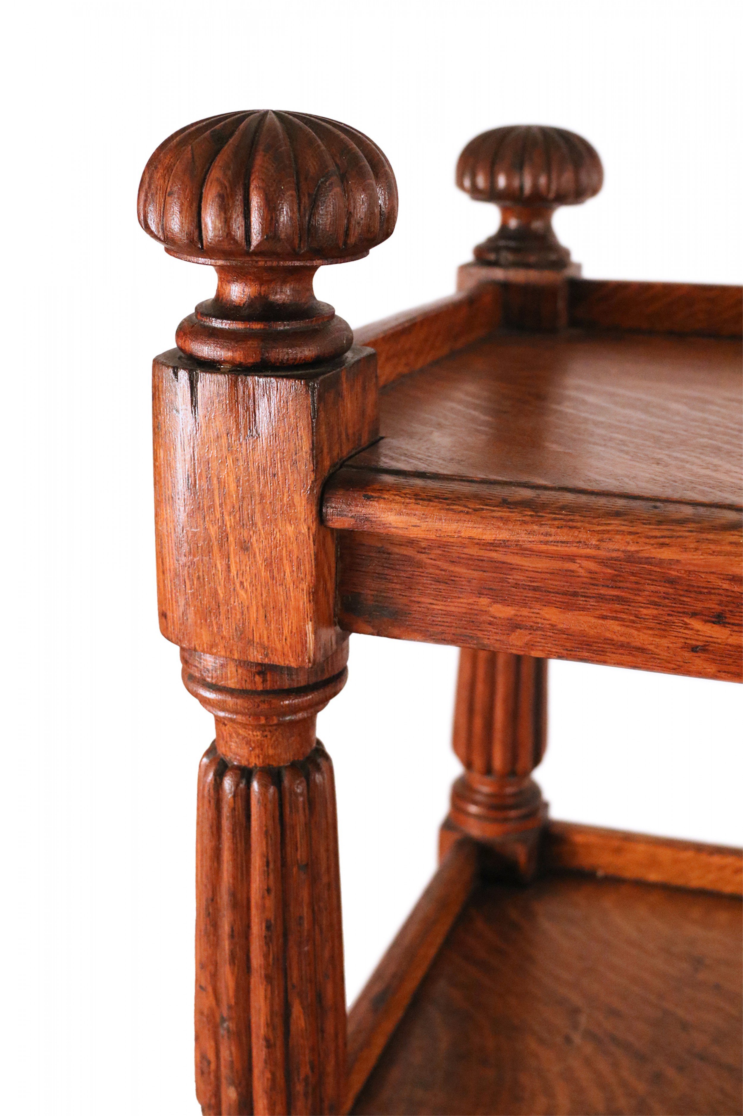 English Regency oak three shelf etagere with reeded ball finials and supports on casters.