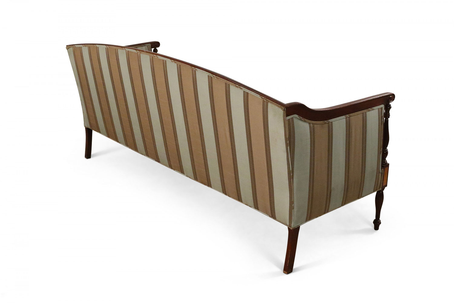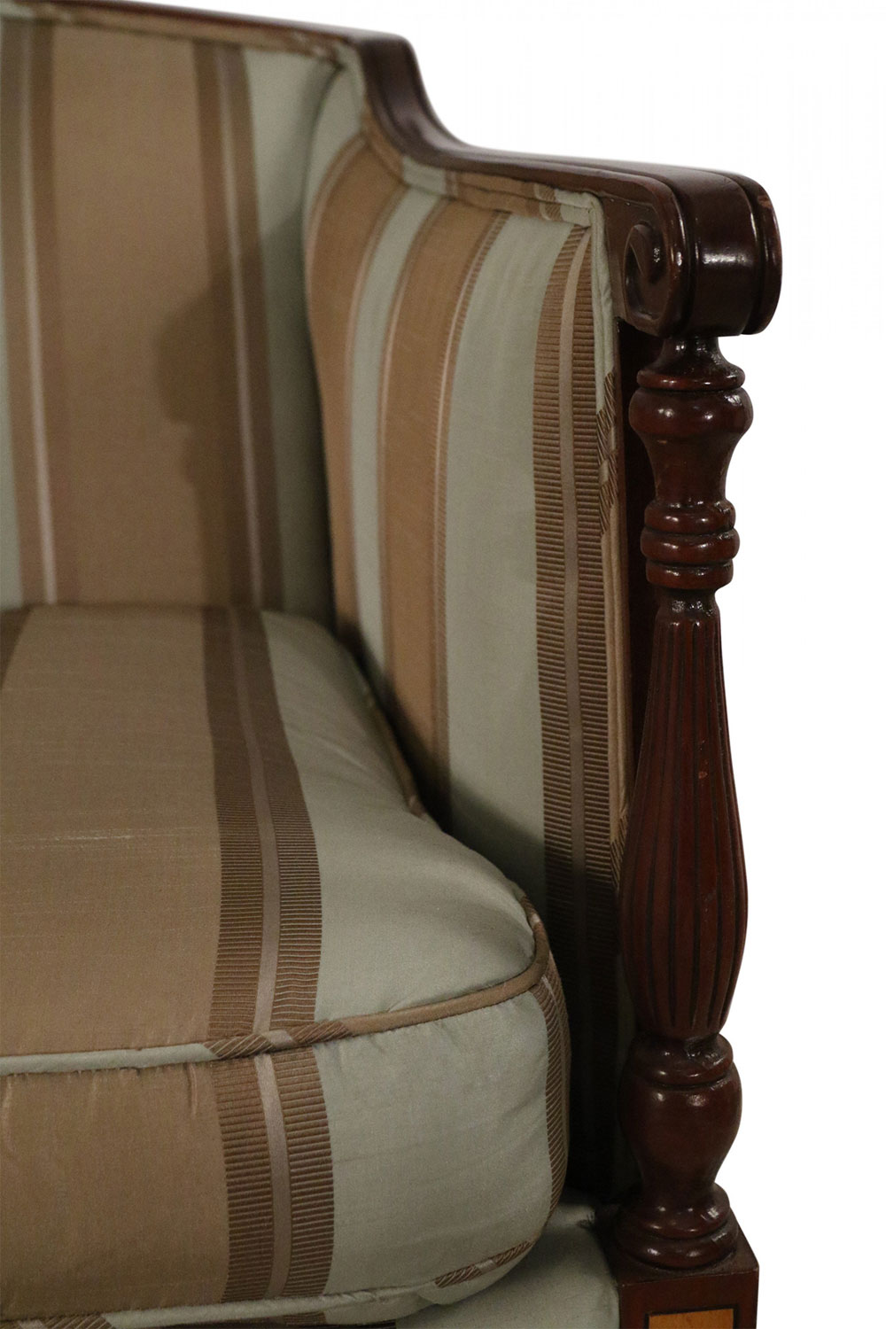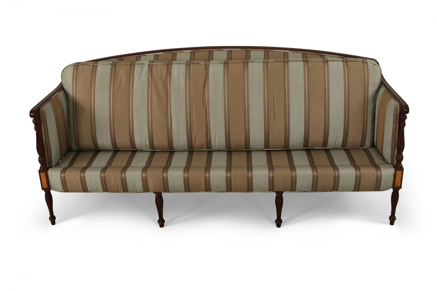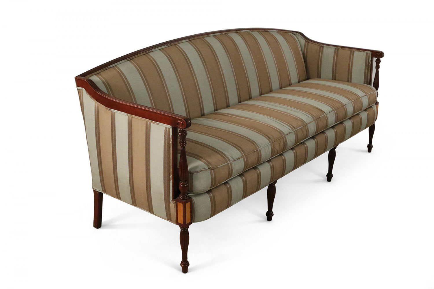 English Sheraton Style Blue and Brown Striped Upholstered Mahogany Sofa