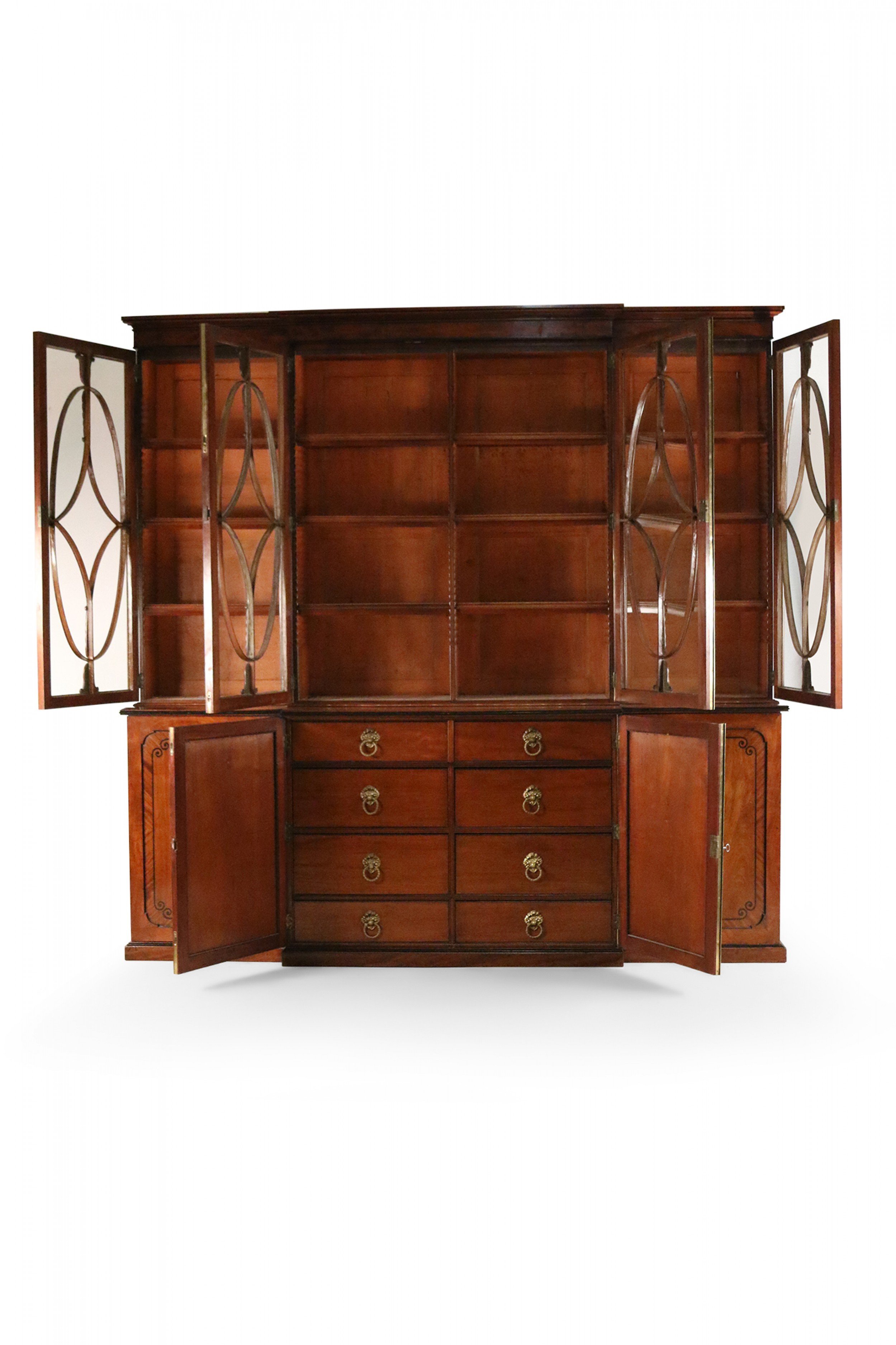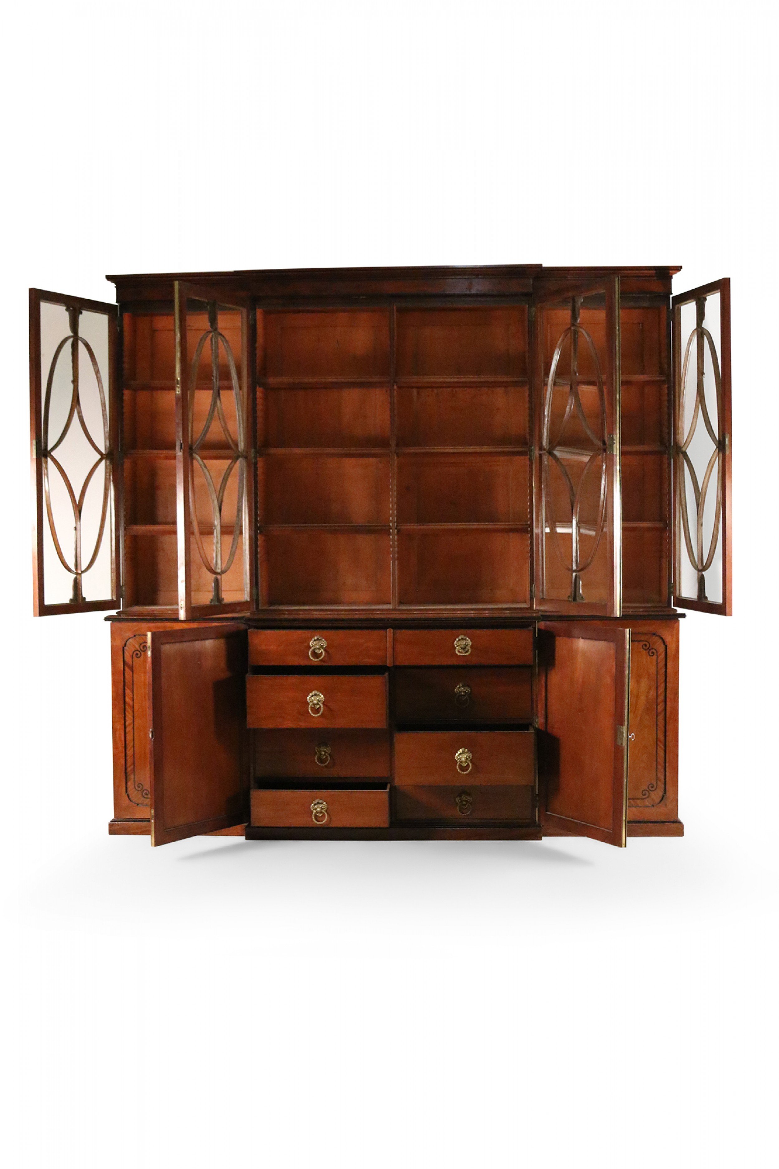 English Regency mahogany breakfront cabinet with four lower cabinets with decorative wood inlay and four upper lattice glass cabinets with under-shelf lighting.