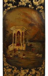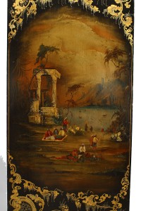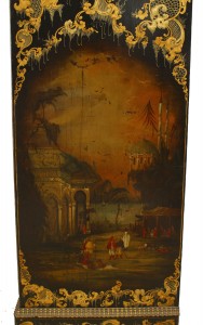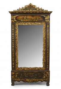 English Victorian black lacquered armoir with gilt embellishments, painted Moorish scenes, and mirrored door.