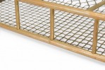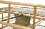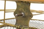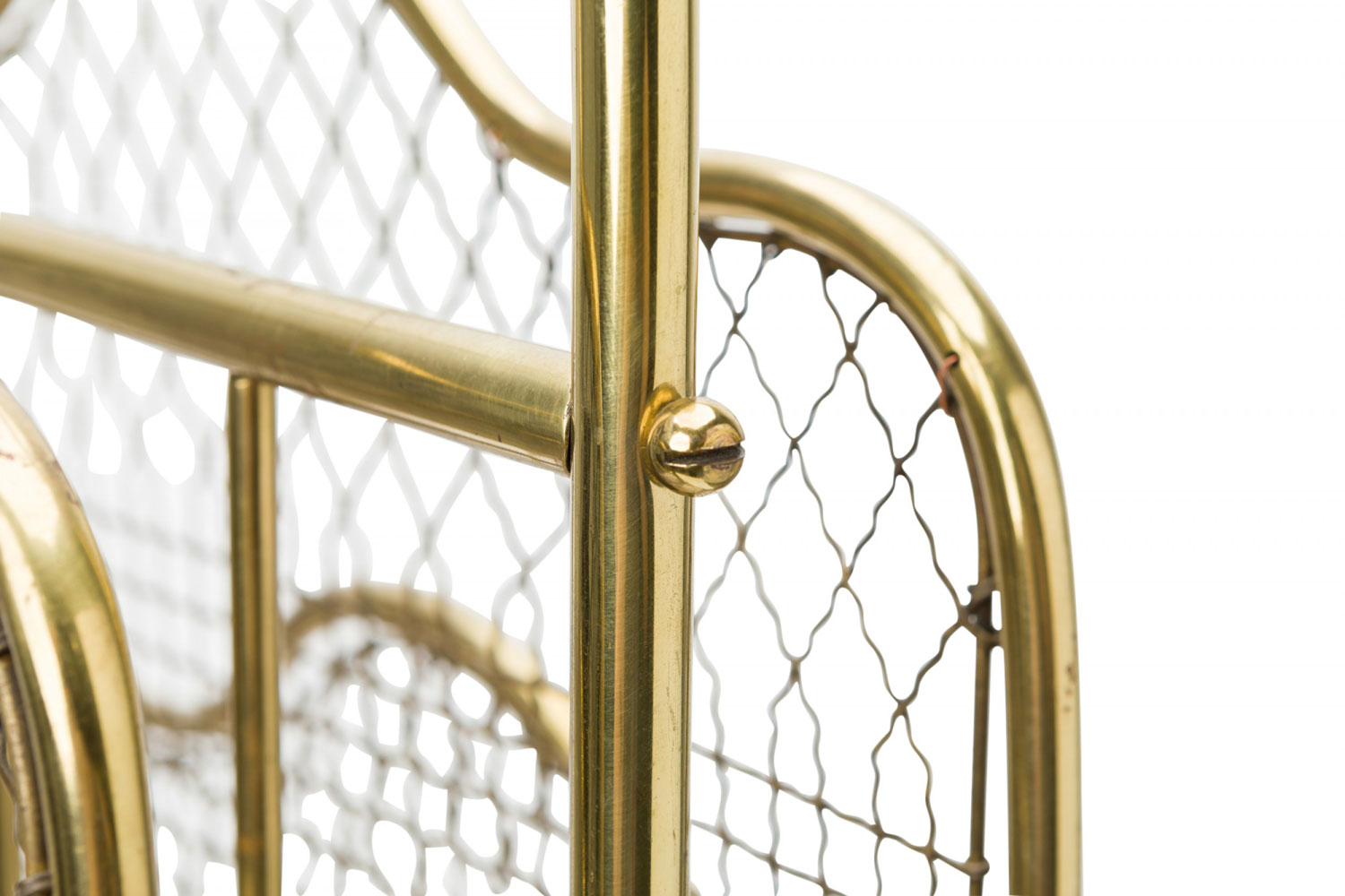 English Victorian-style magazine rack with a brass frame and handle and three tiered compartments walled with brass grid mesh..