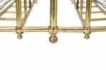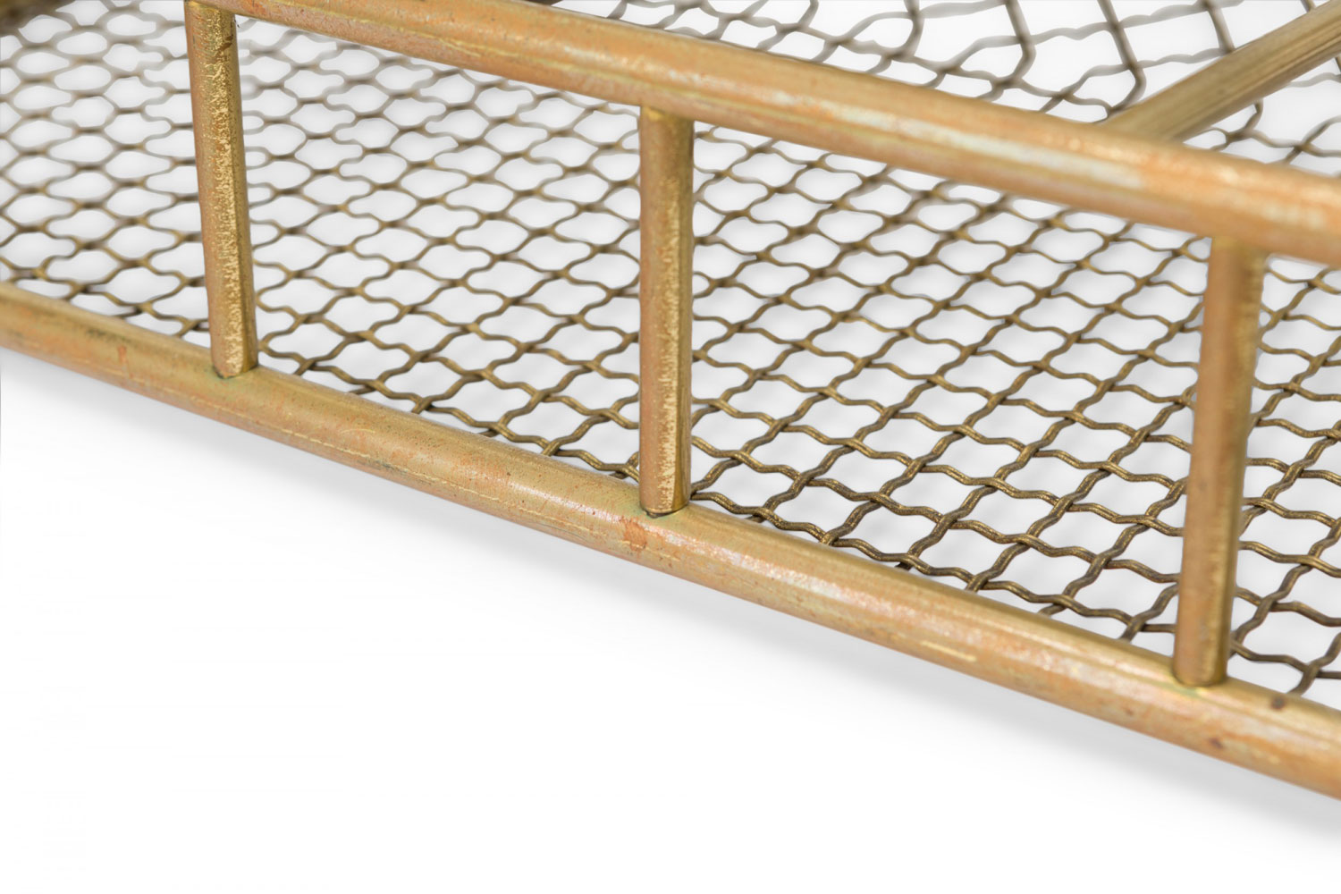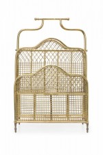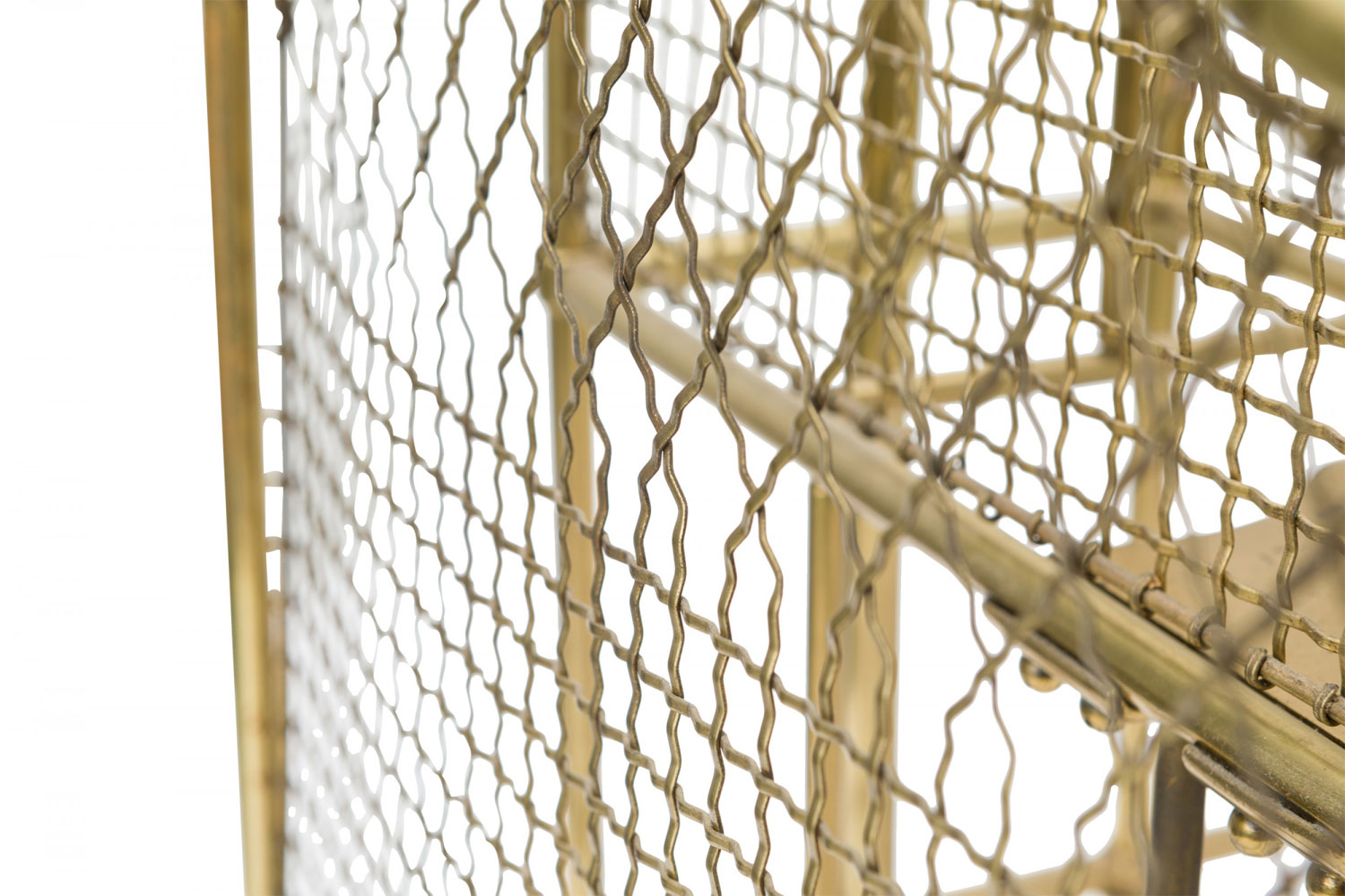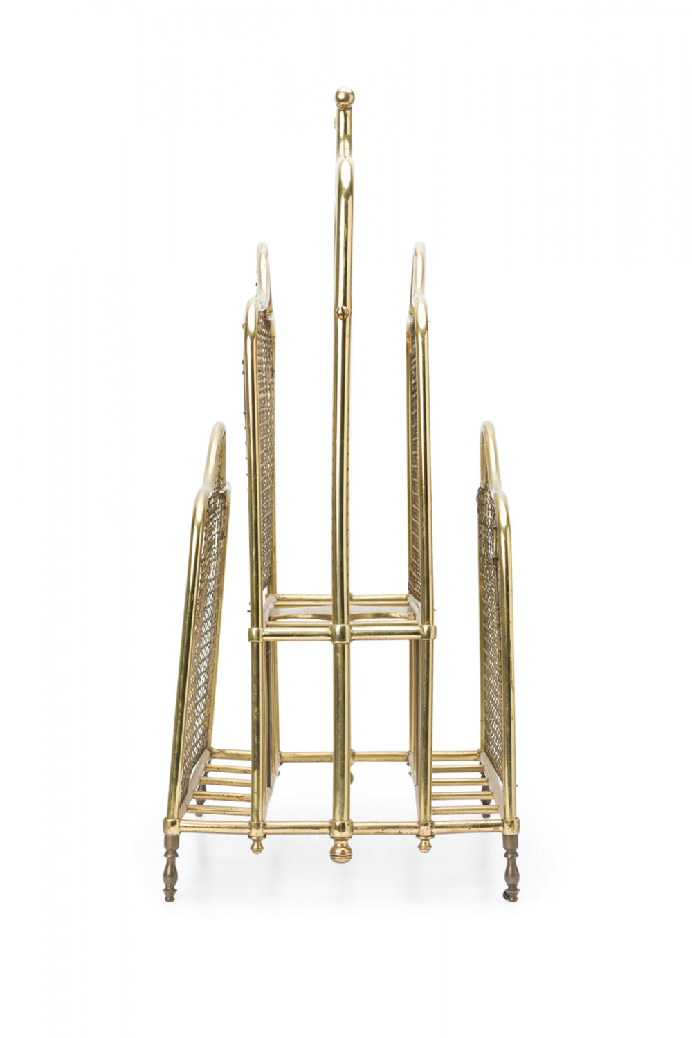 English Victorian-style magazine rack with a brass frame and handle and three tiered compartments walled with brass grid mesh.