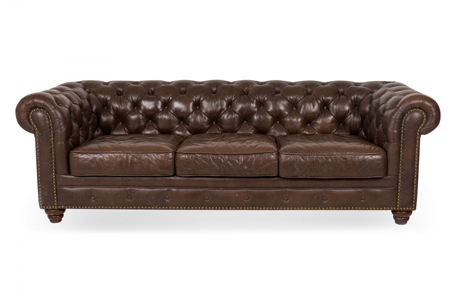 English Victorian style (20th Century) three-seat Chesterfield sofa with deep brown button tufted leather upholstery, three removable seat cushions, scroll arms, and antique brass nailhead trim, resting on four tapered walnut bun feet.