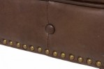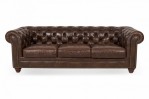English Victorian style (20th Century) three-seat Chesterfield sofa with deep brown button tufted leather upholstery, three removable seat cushions, scroll arms, and antique brass nailhead trim, resting on four tapered walnut bun feet..