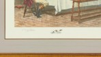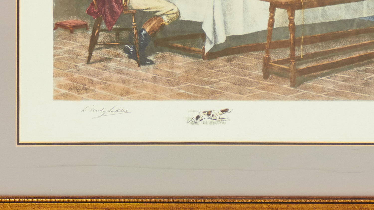 English Victorian-style lithograph print of a woman and gentleman accompanied by several men in hunting attire gathered around a table for a meal in a rectangular wooden frame and light gray mat. (similar items 062902-062921).