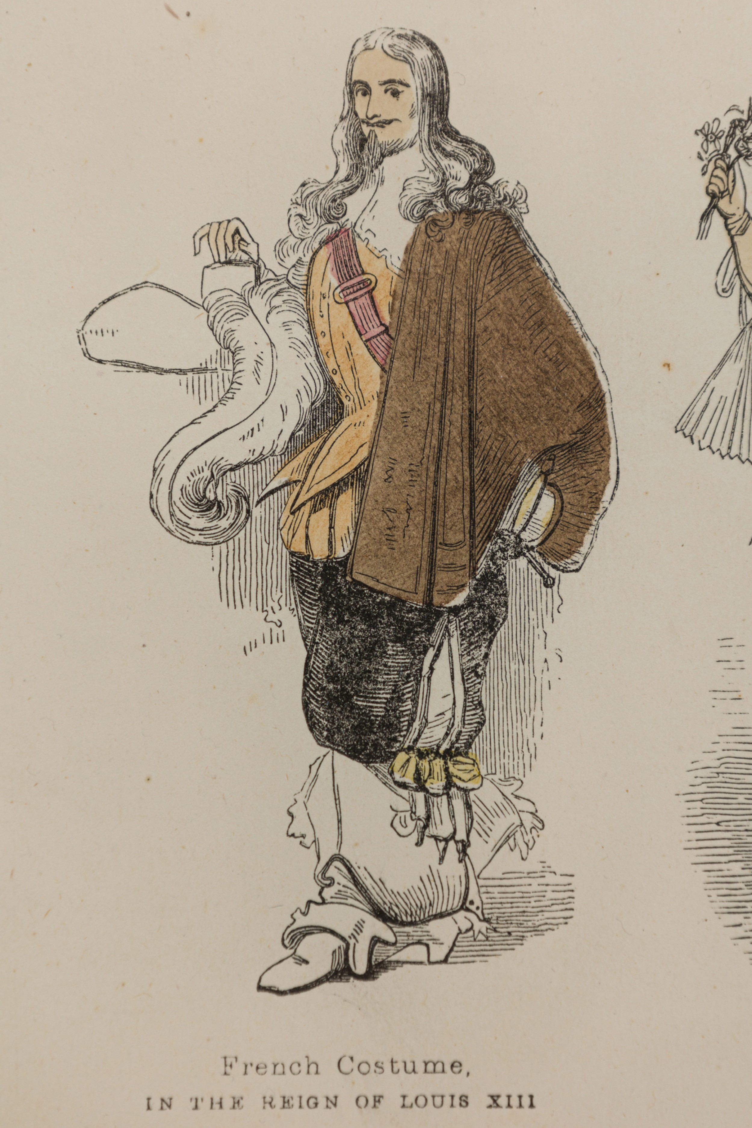 English Victorian prints featuring four styles of French noble attires from historical periods in a carved silver/gilt frame with a mat (Similar items: NWL6149A-F).