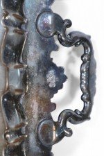 Style: English Materials & Techniques: Engraved, metal Category: Dining Room, Accessories/Décor/Bric-a-Brac Condition: Silver plating has mostly worn away. One handle has become detatched.