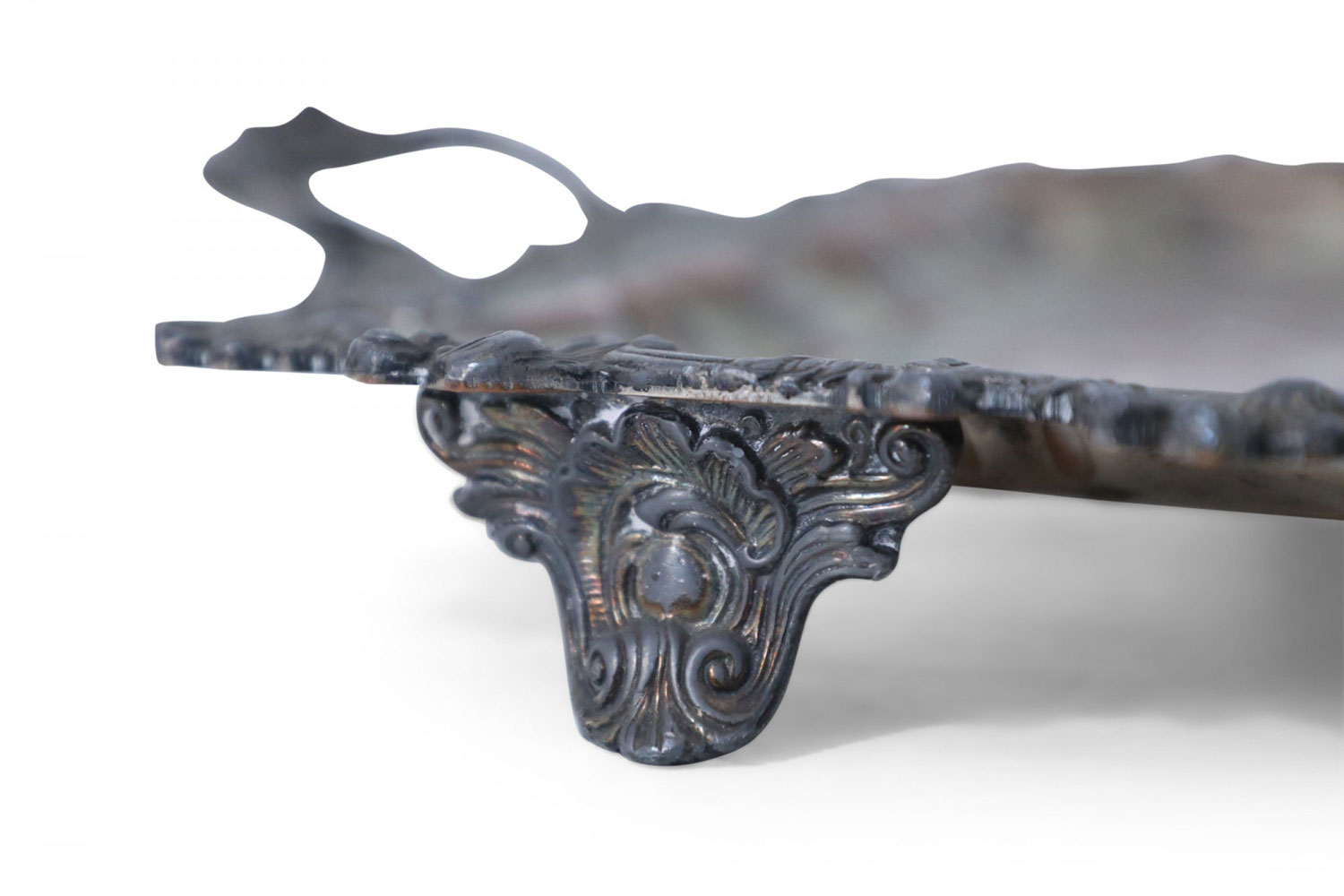 English Victorian silver plate rectangular serving tray with a heavy patina, engraved surface, and ornate handles, border, and four feet..