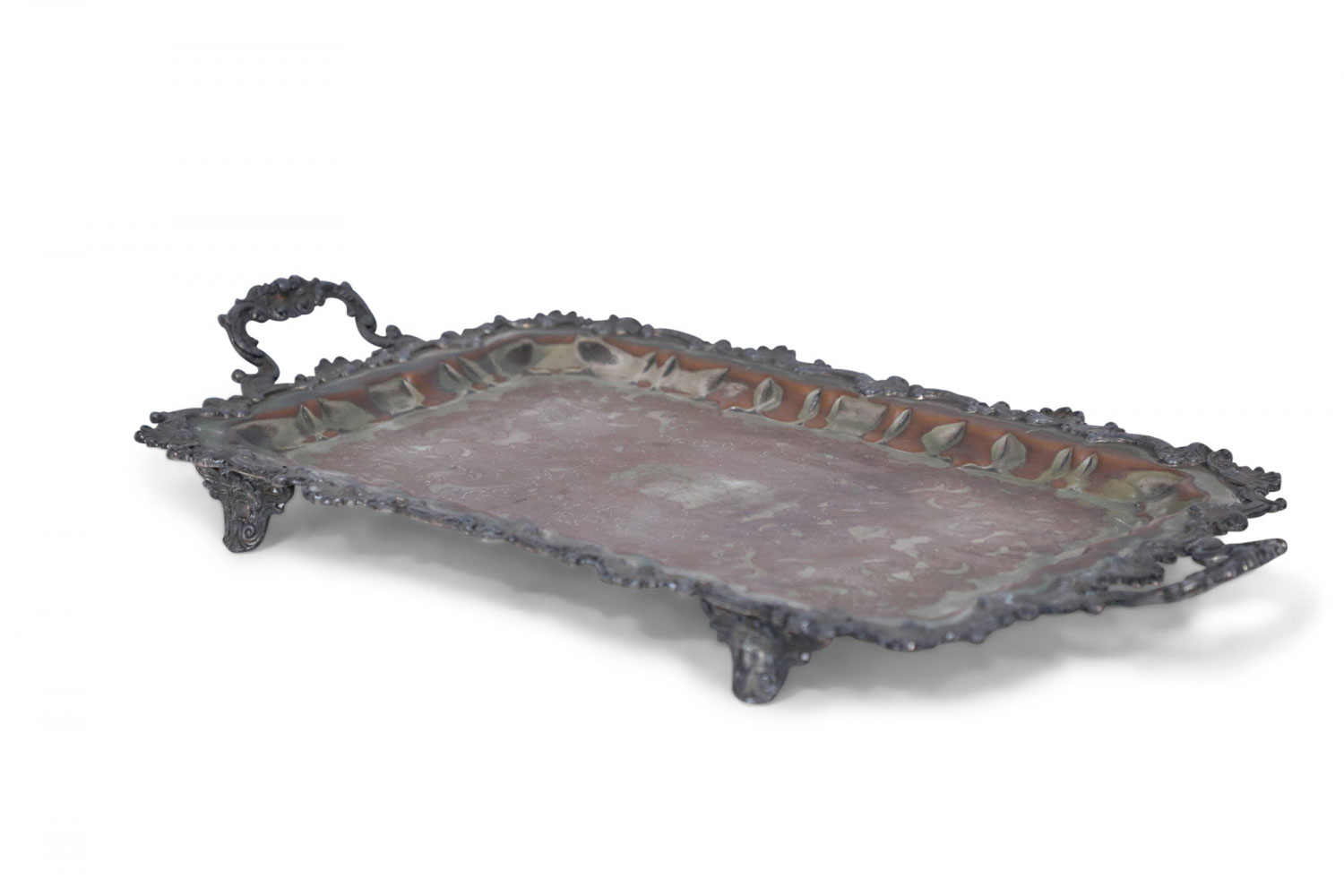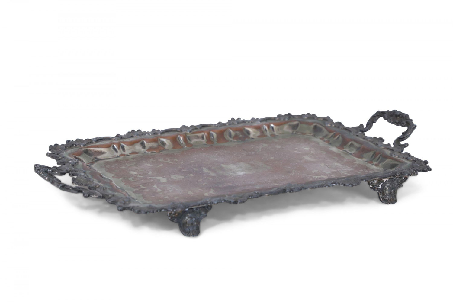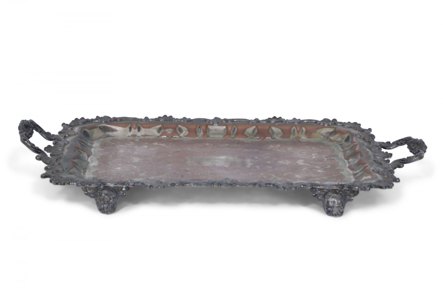 English Victorian silver plate rectangular serving tray with a heavy patina, engraved surface, and ornate handles, border, and four feet.