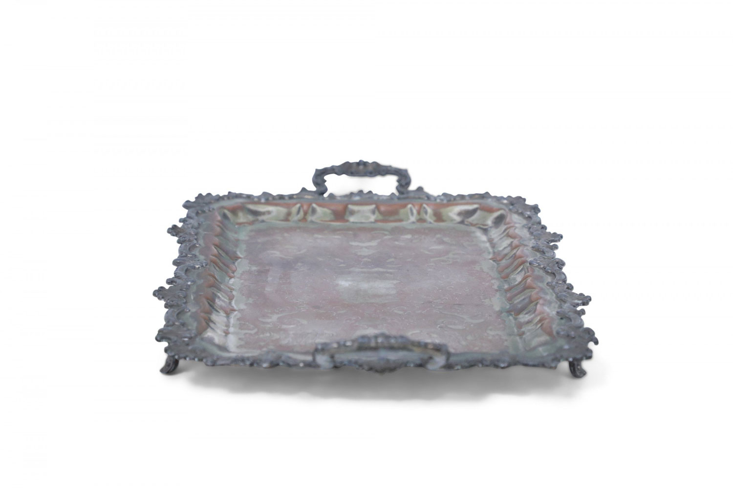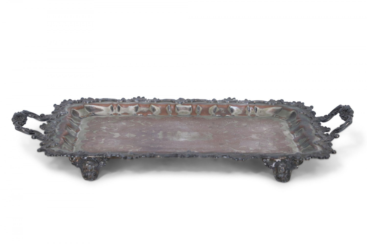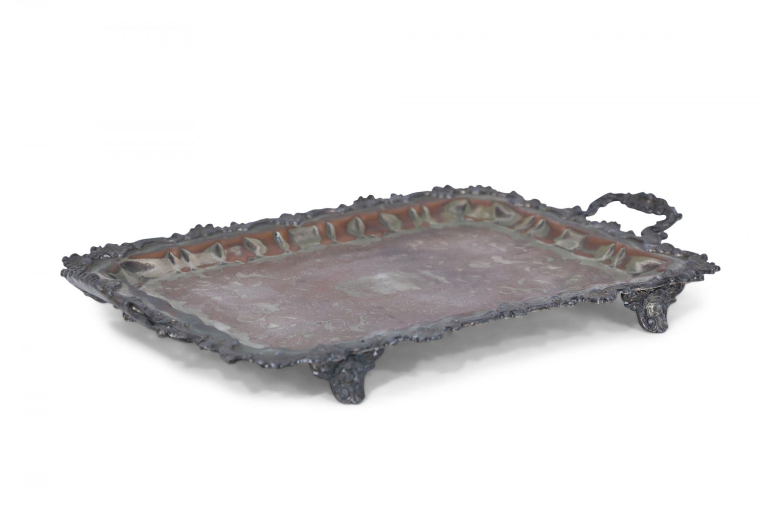 English Victorian silver plate rectangular serving tray with a heavy patina, engraved surface, and ornate handles, border, and four feet.