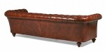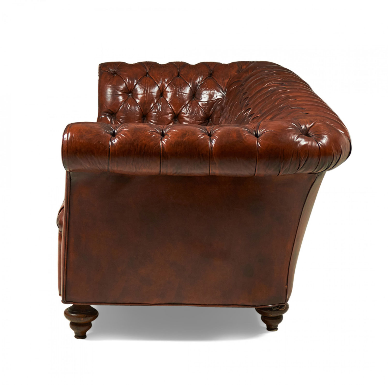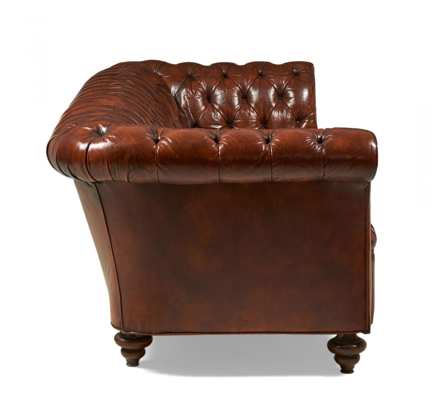 English Victorian style chesterfield sofa upholstered in warm chestnut brown tufted leather and resting on six wooden bun feet with casters.