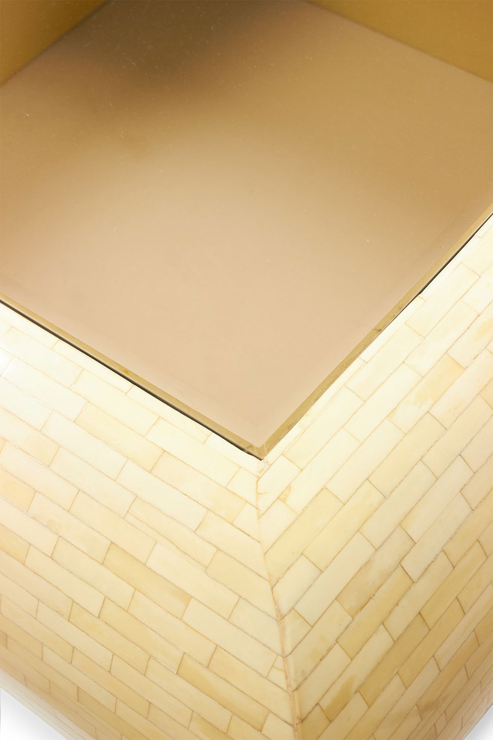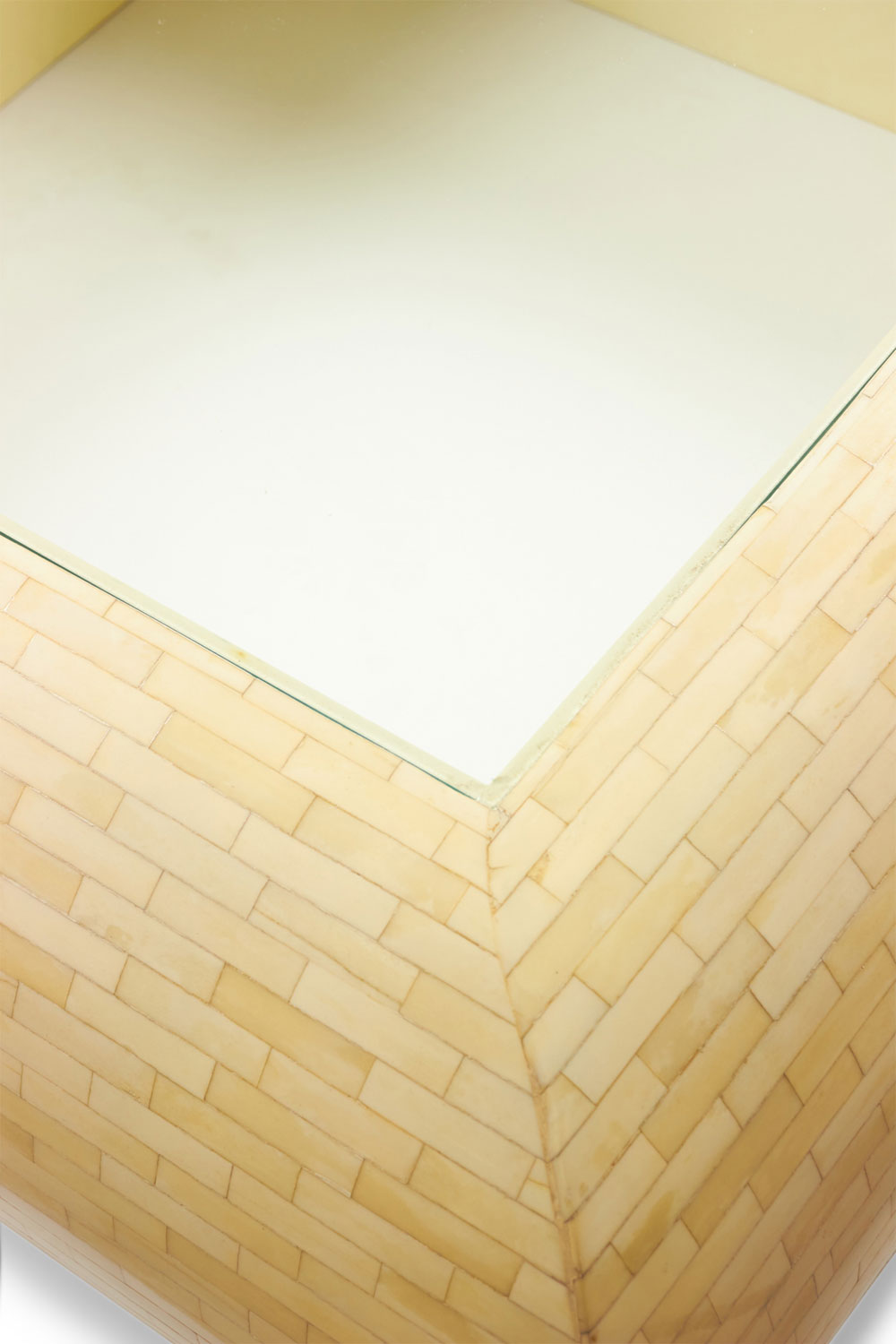 Columbian High Style (circa 1980) 'bull nose' coffee / cocktail table with rectangular tiled bone veneer over its rounded square form with a square inset smoked glass table top. (clear glass insert also available)(ENRIQUE GARCES).