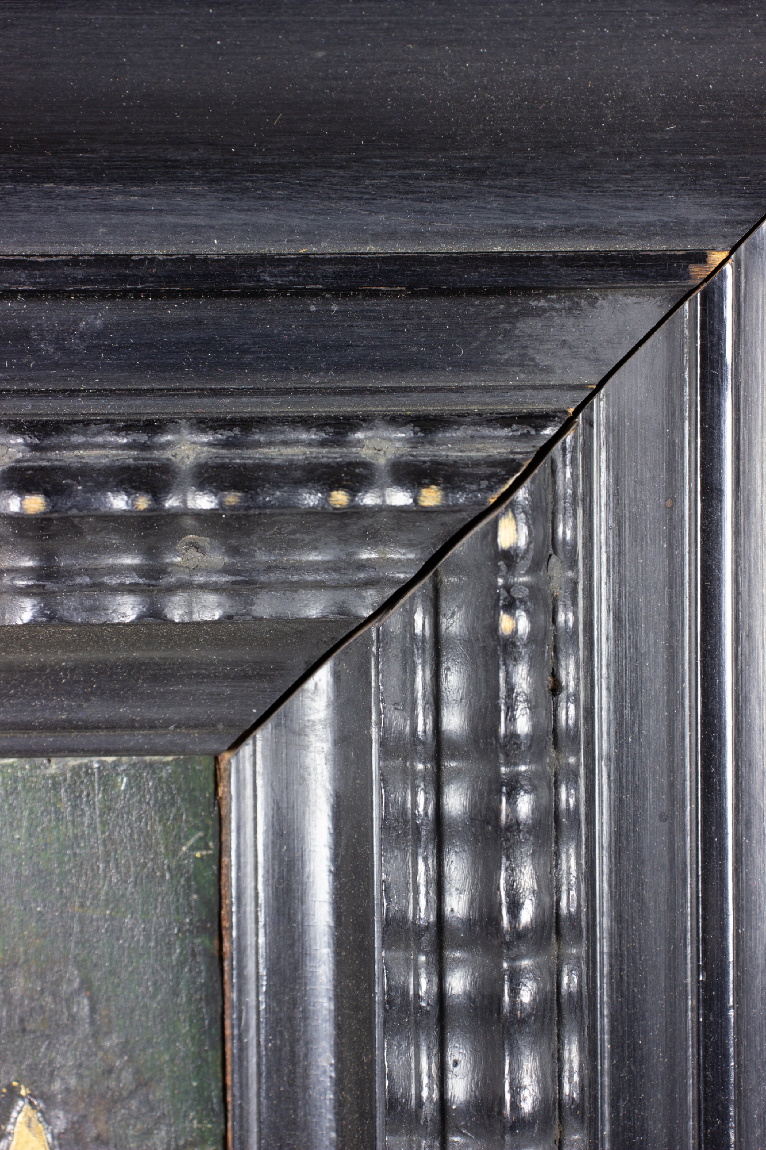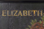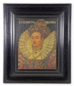 English Renaissance style (dated 1903) framed incised wood and oil paint portrait of Queen Elizabeth against a black background in a rectangular wooden frame (inscribed on back: adapted decoratively from an old engraving, New York, painted by F. WM FOSDICK)