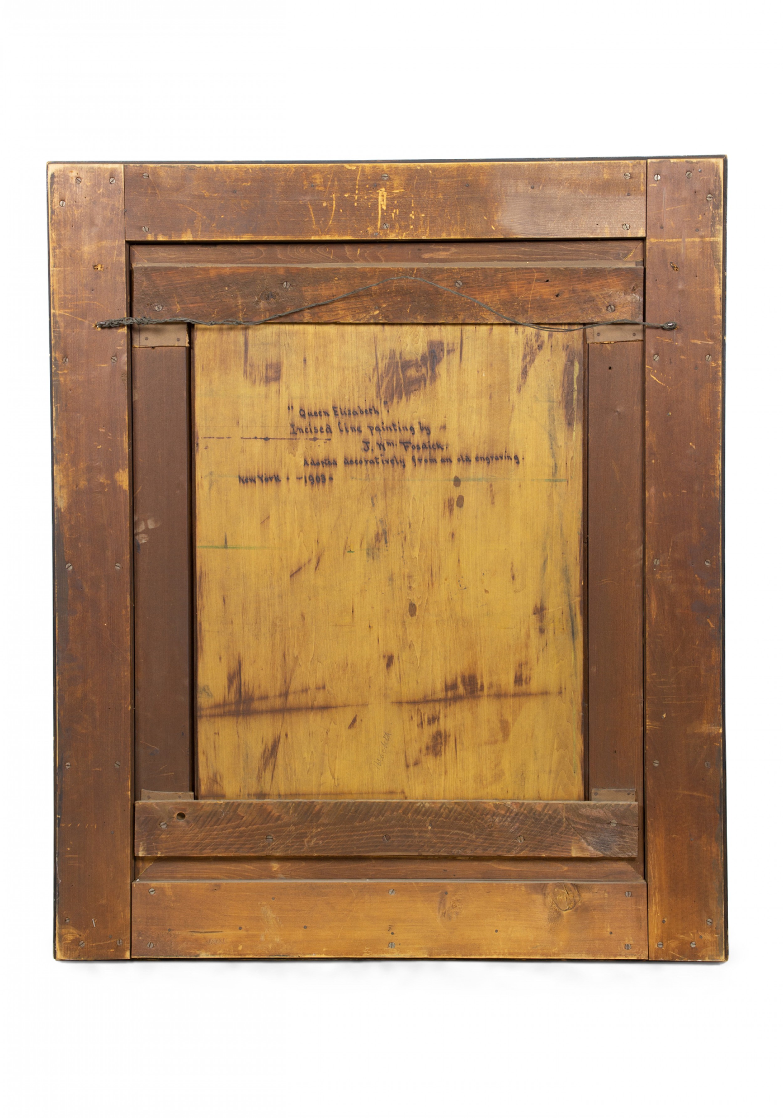 English Renaissance style (dated 1903) framed incised wood and oil paint portrait of Queen Elizabeth against a black background in a rectangular wooden frame (inscribed on back: adapted decoratively from an old engraving, New York, painted by F. WM FOSDICK).