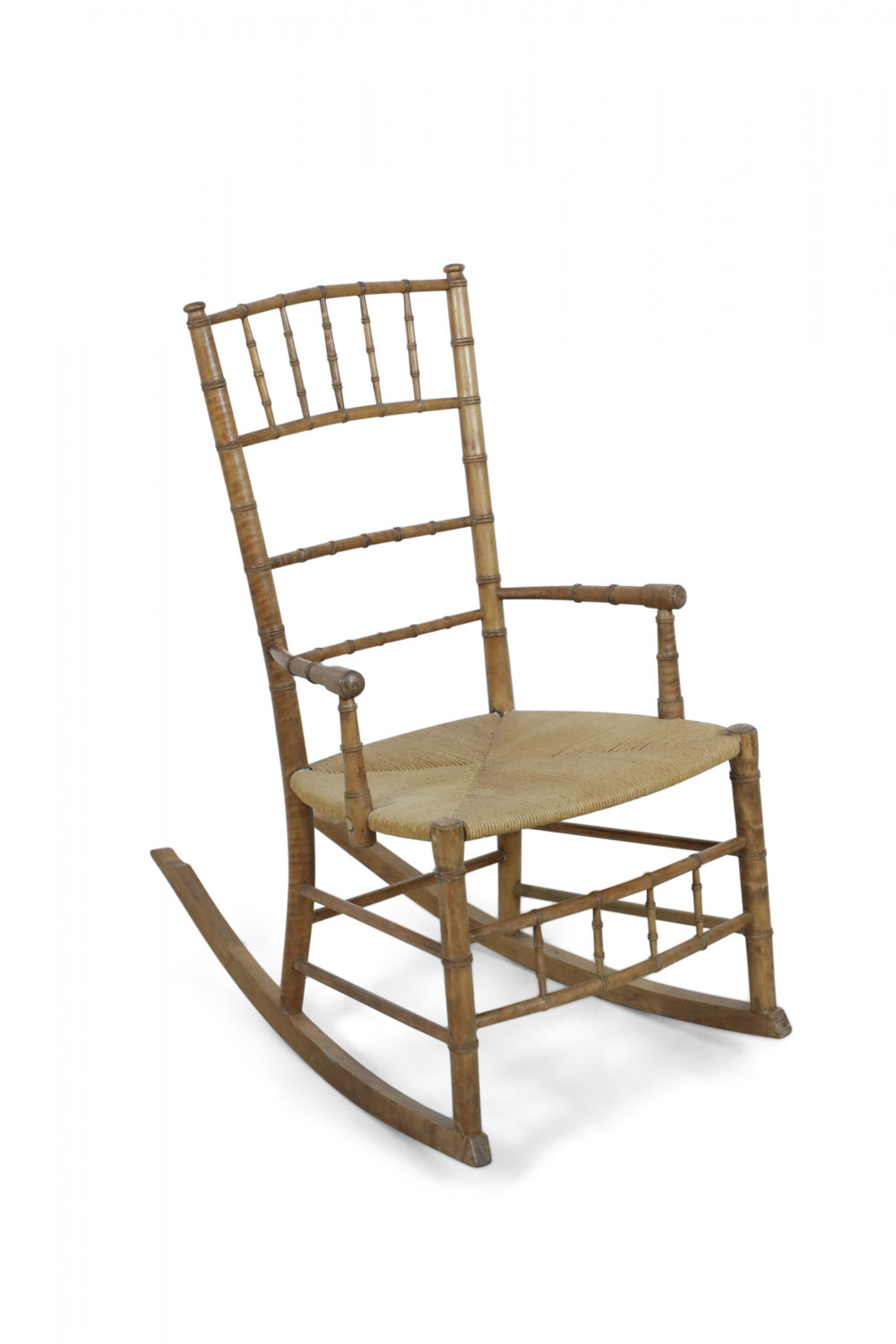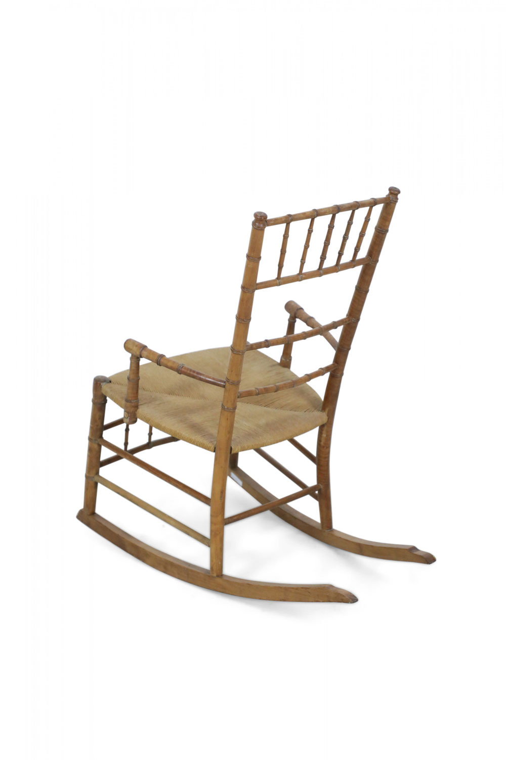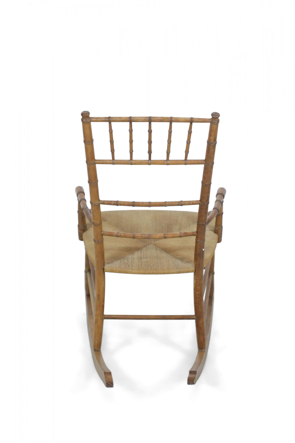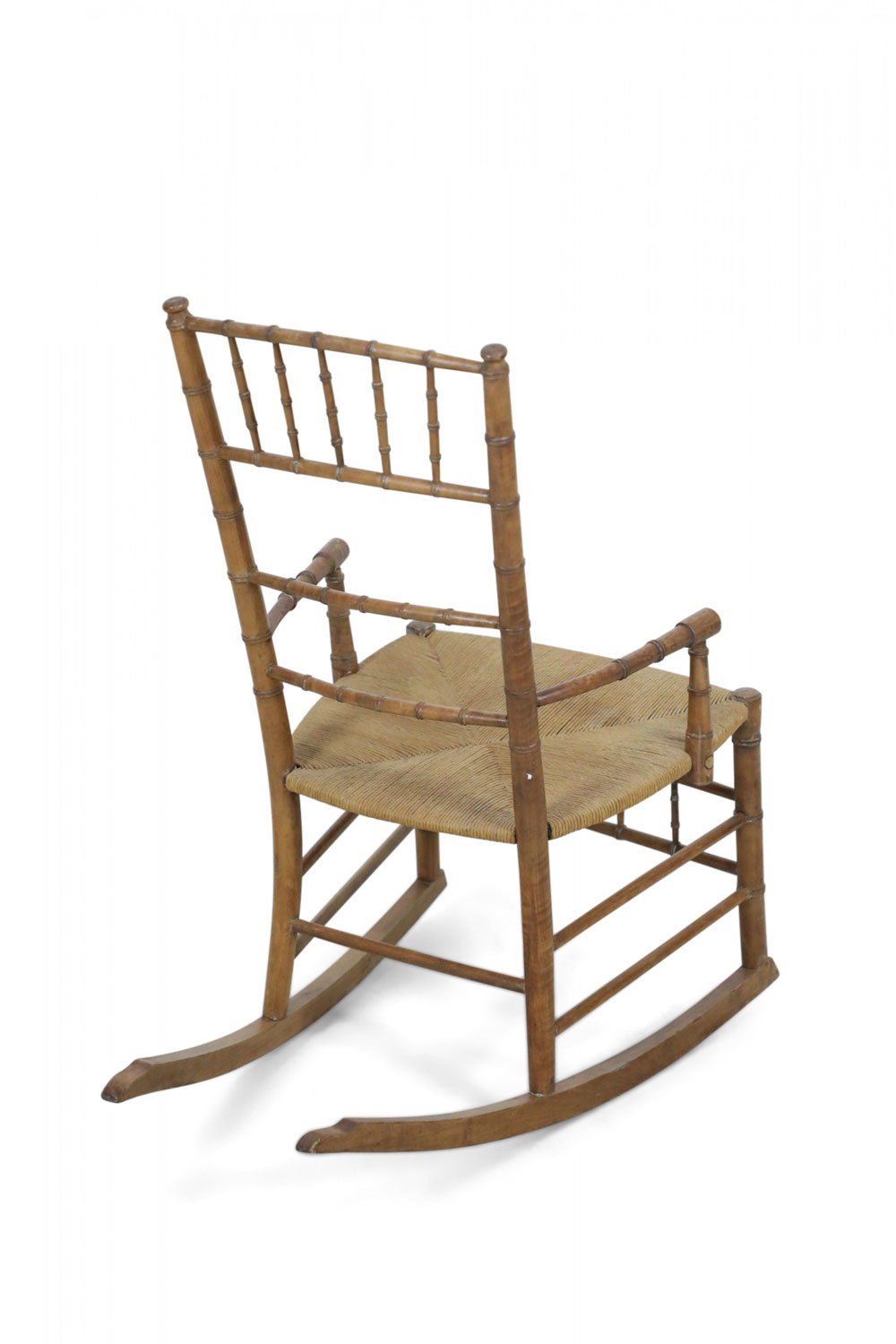 American Victorian Aesthetic Movement amber stained birdseye maple faux bamboo child-sized rocking chair with arms and a ladder back with spindle top section and a rush seat.