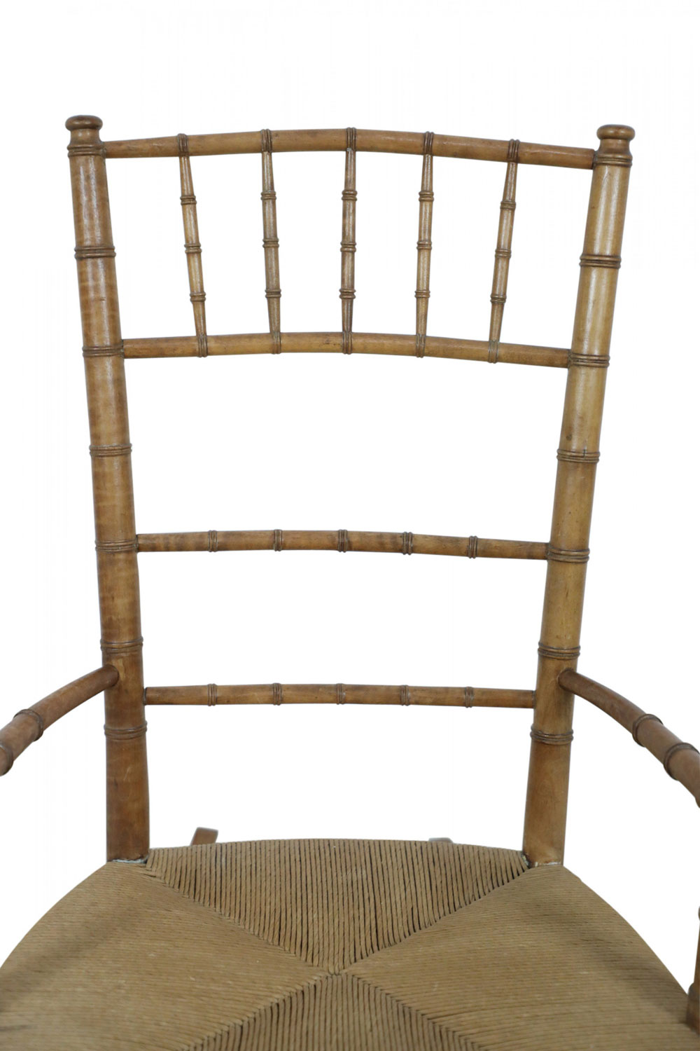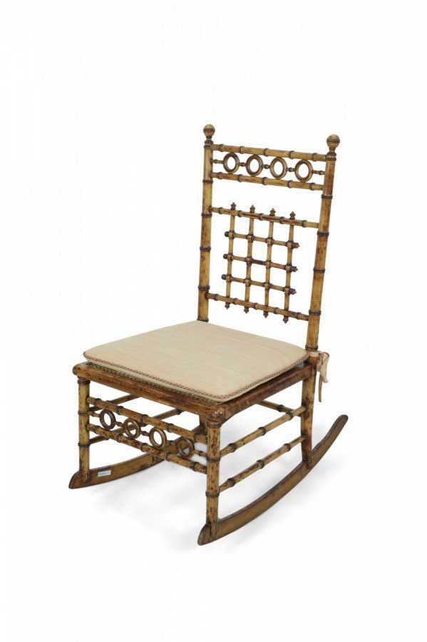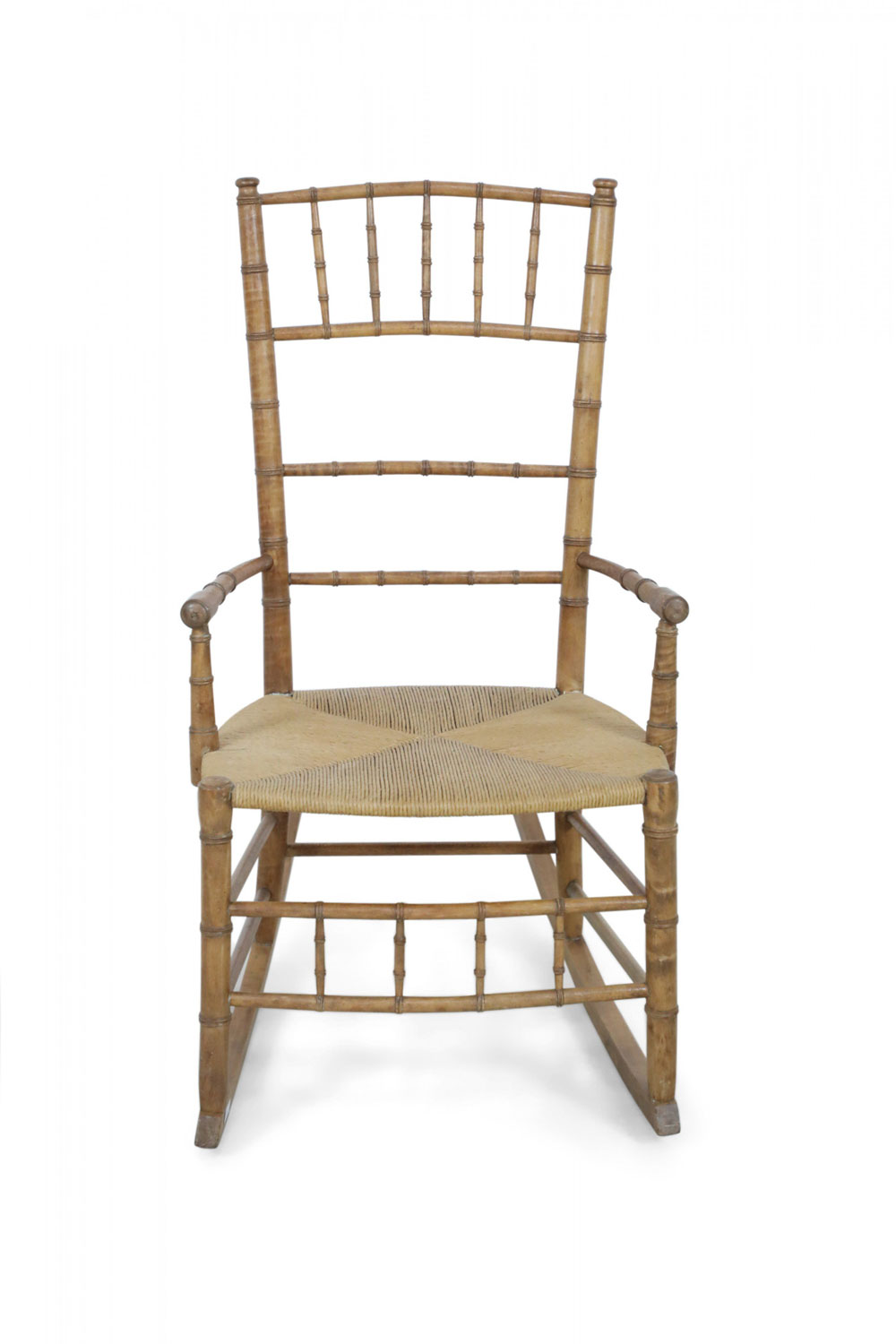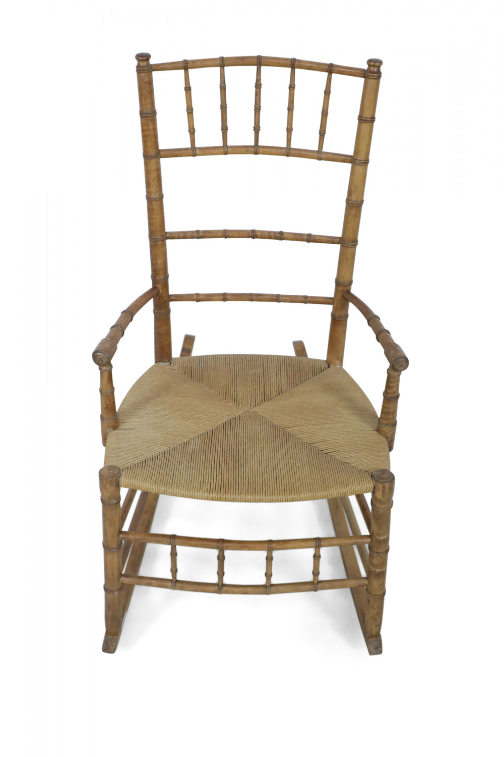 American Victorian Aesthetic Movement amber stained birdseye maple faux bamboo child-sized rocking chair with arms and a ladder back with spindle top section and a rush seat.