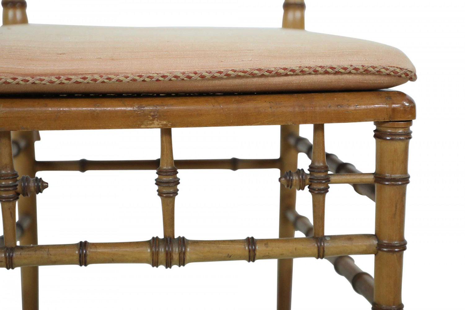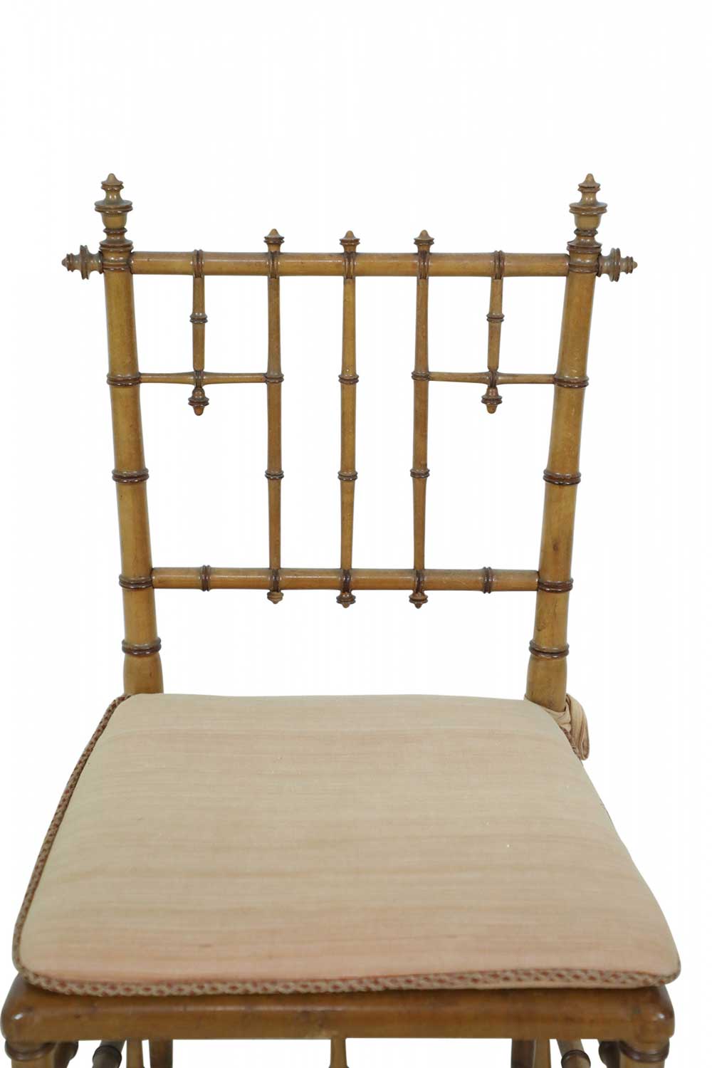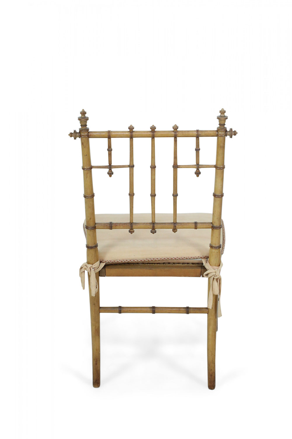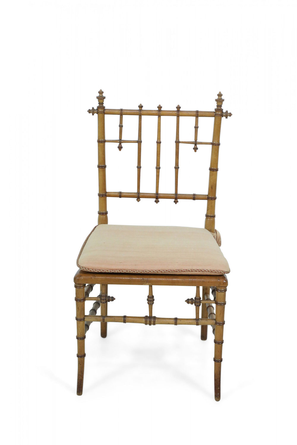 American Victorian Aesthetic Movement faux bamboo maple side chair with a cane seat and removable peach colored upholstered cushion with rope trim.