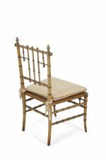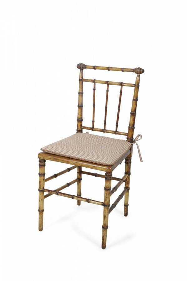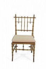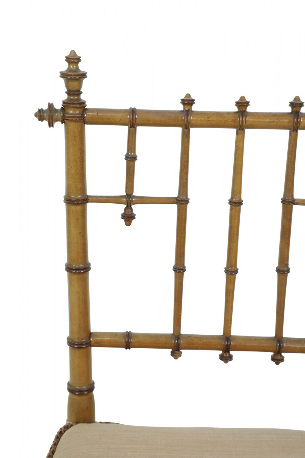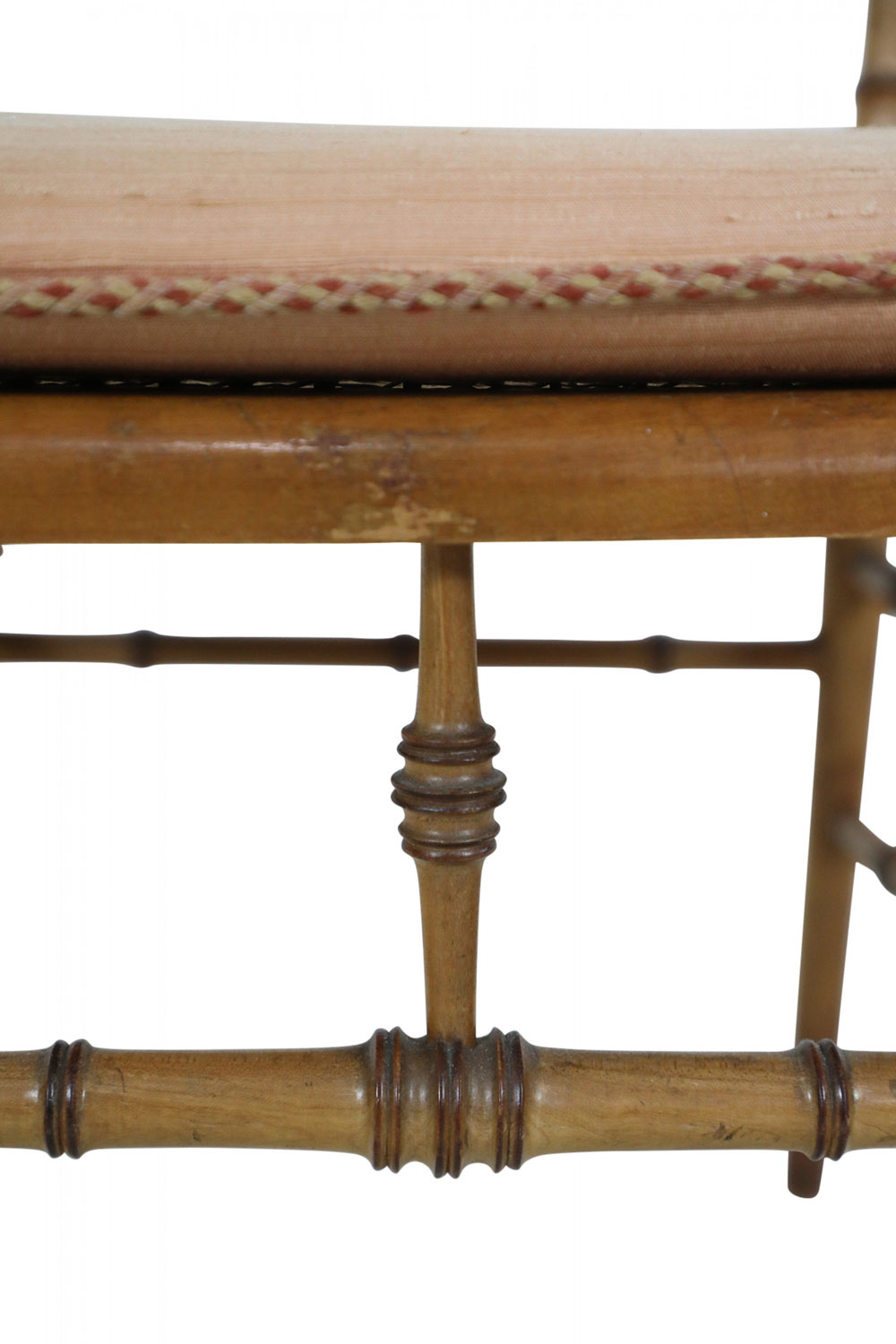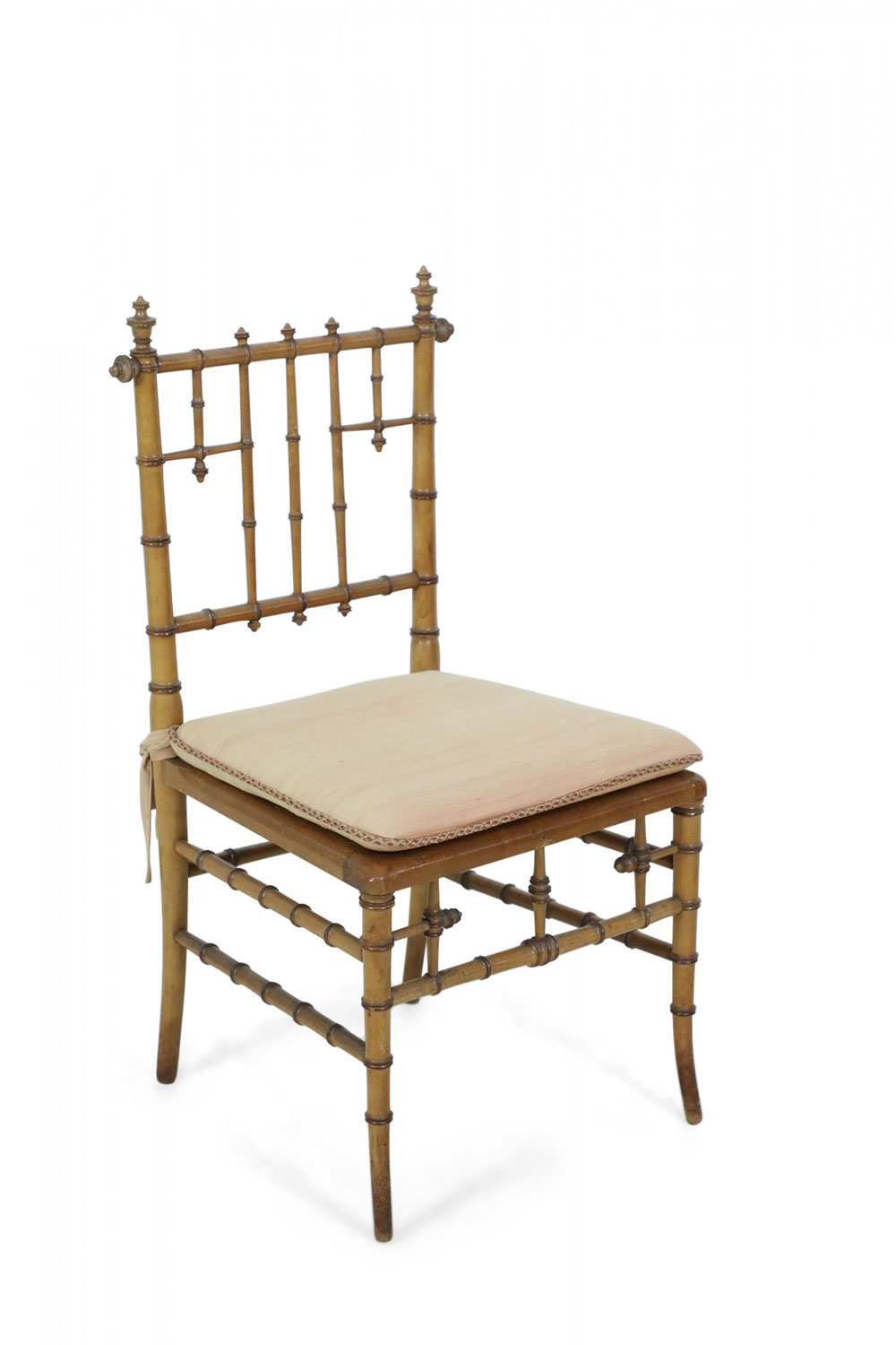 American Victorian Aesthetic Movement faux bamboo maple side chair with a cane seat and removable peach colored upholstered cushion with rope trim.