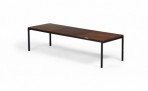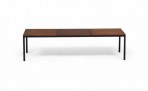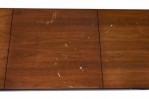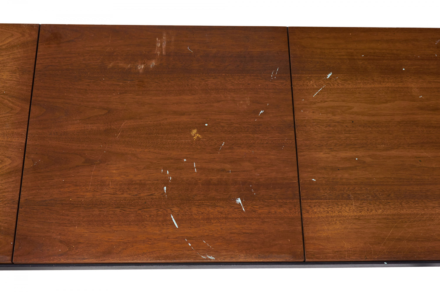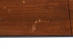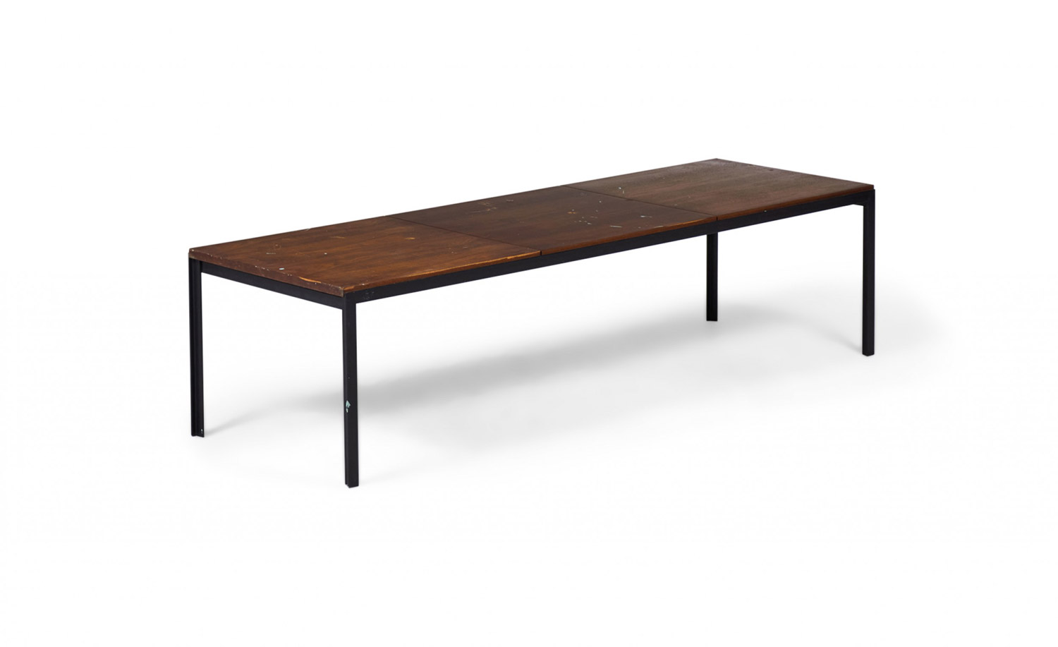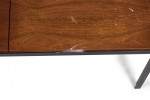 Style: Mid-Century Materials & Techniques: Metal, walnut, wood Category: Tables Condition: Light blue paint splatters and damage to table surface. Good; Wear consistent with age and use