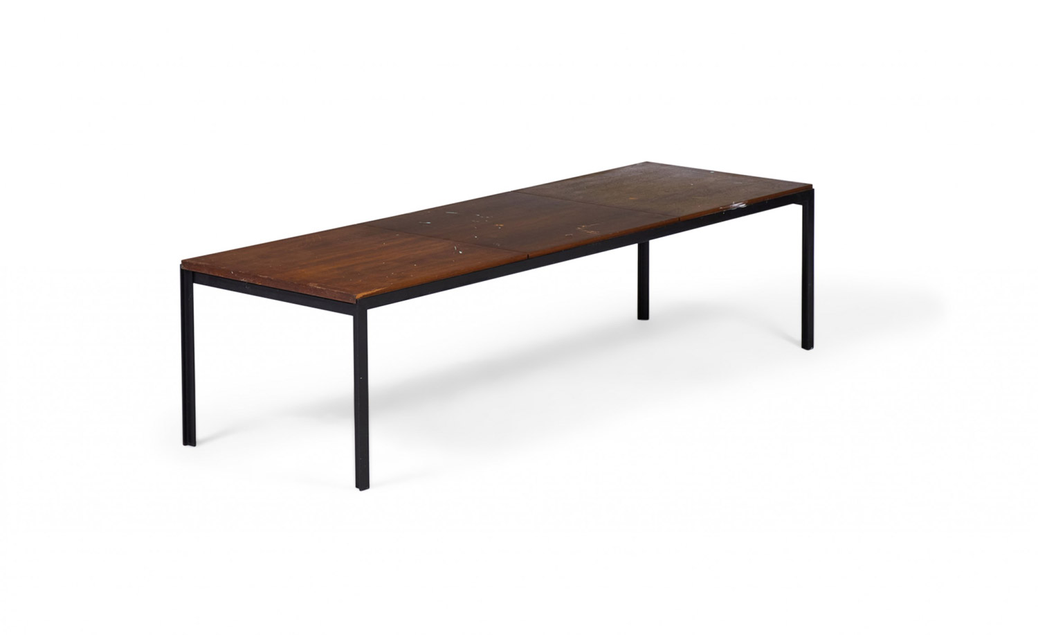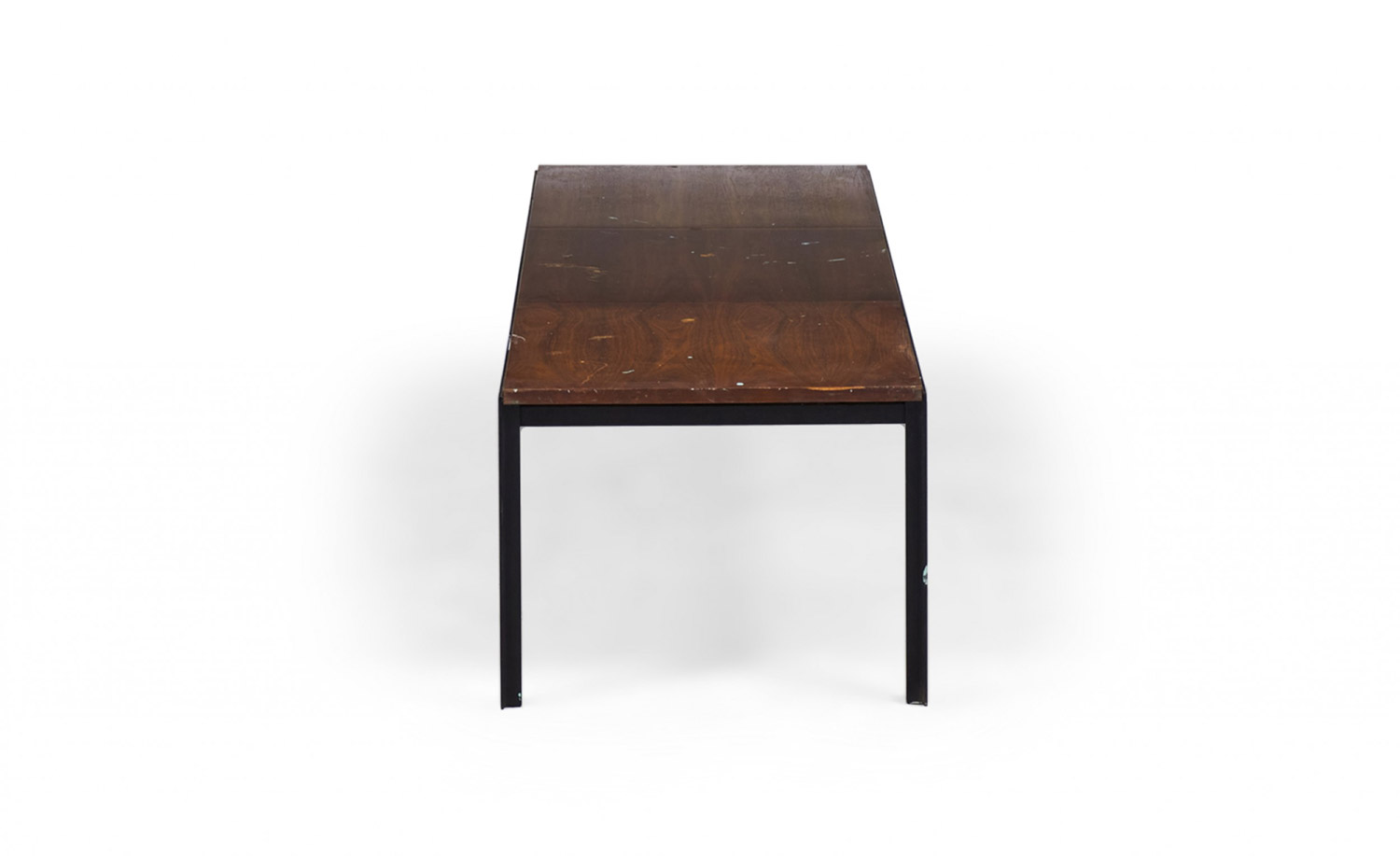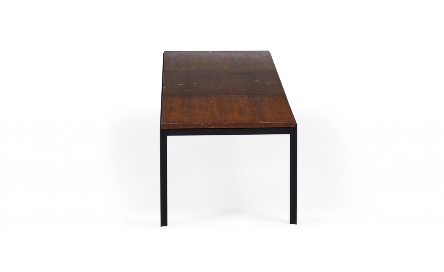 American Mid-Century rectangular coffee / cocktail table with a walnut top supported on a T-shaped black metal base. (FLORENCE KNOLL)(Similar table: DUF0083)