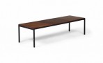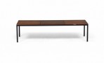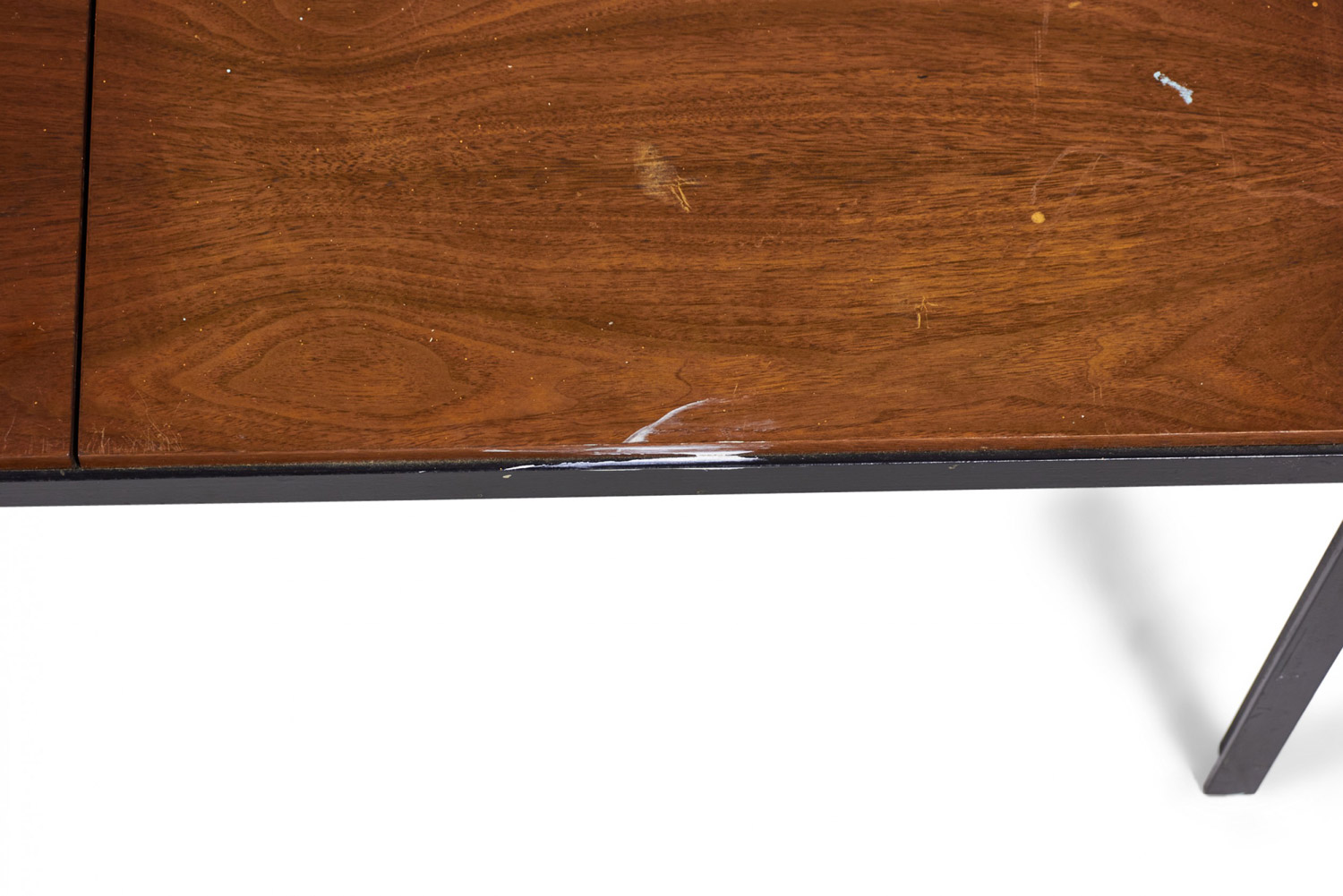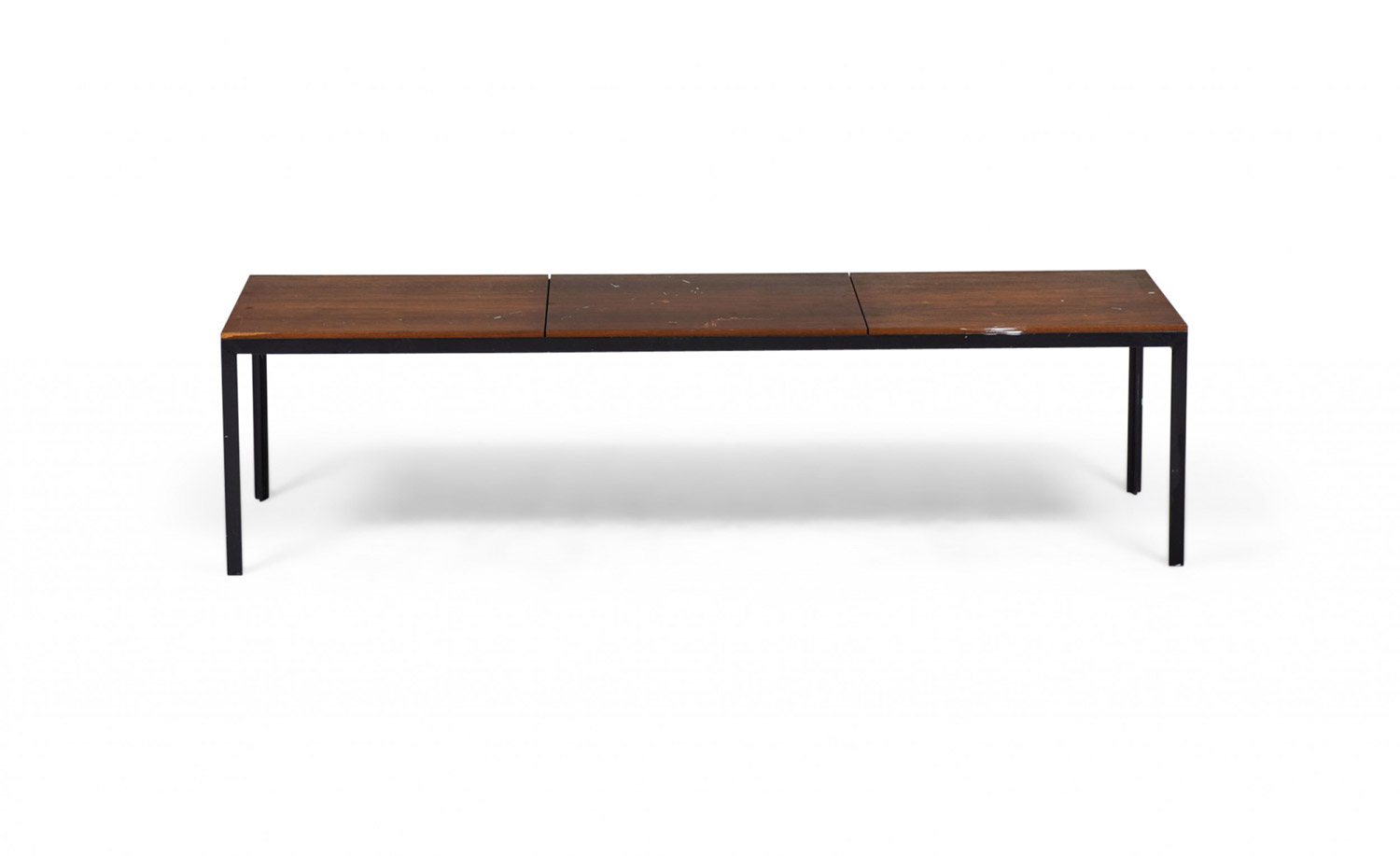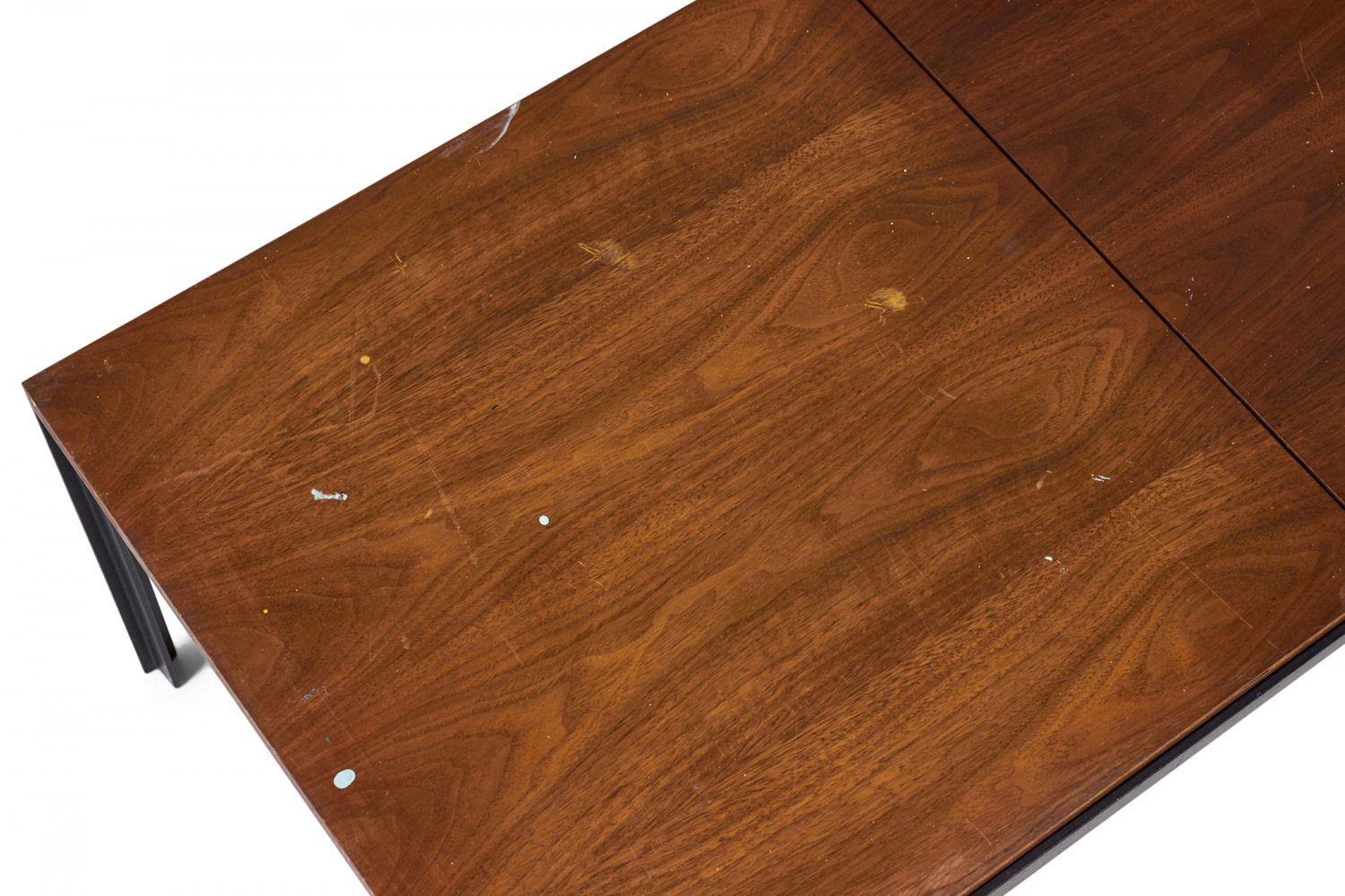 American Mid-Century rectangular coffee / cocktail table with a walnut top supported on a T-shaped black metal base. (FLORENCE KNOLL)(Similar table: DUF0083)