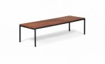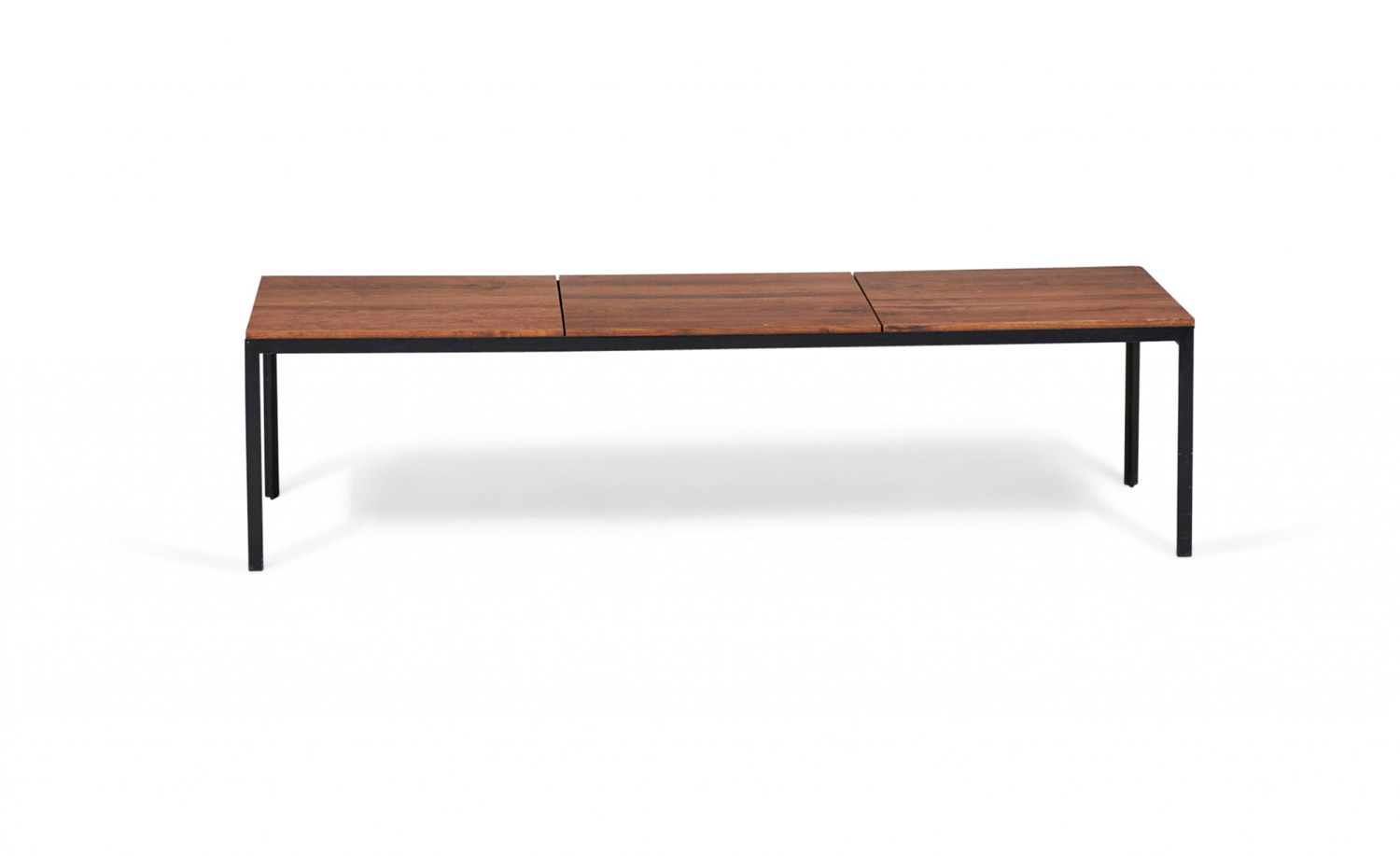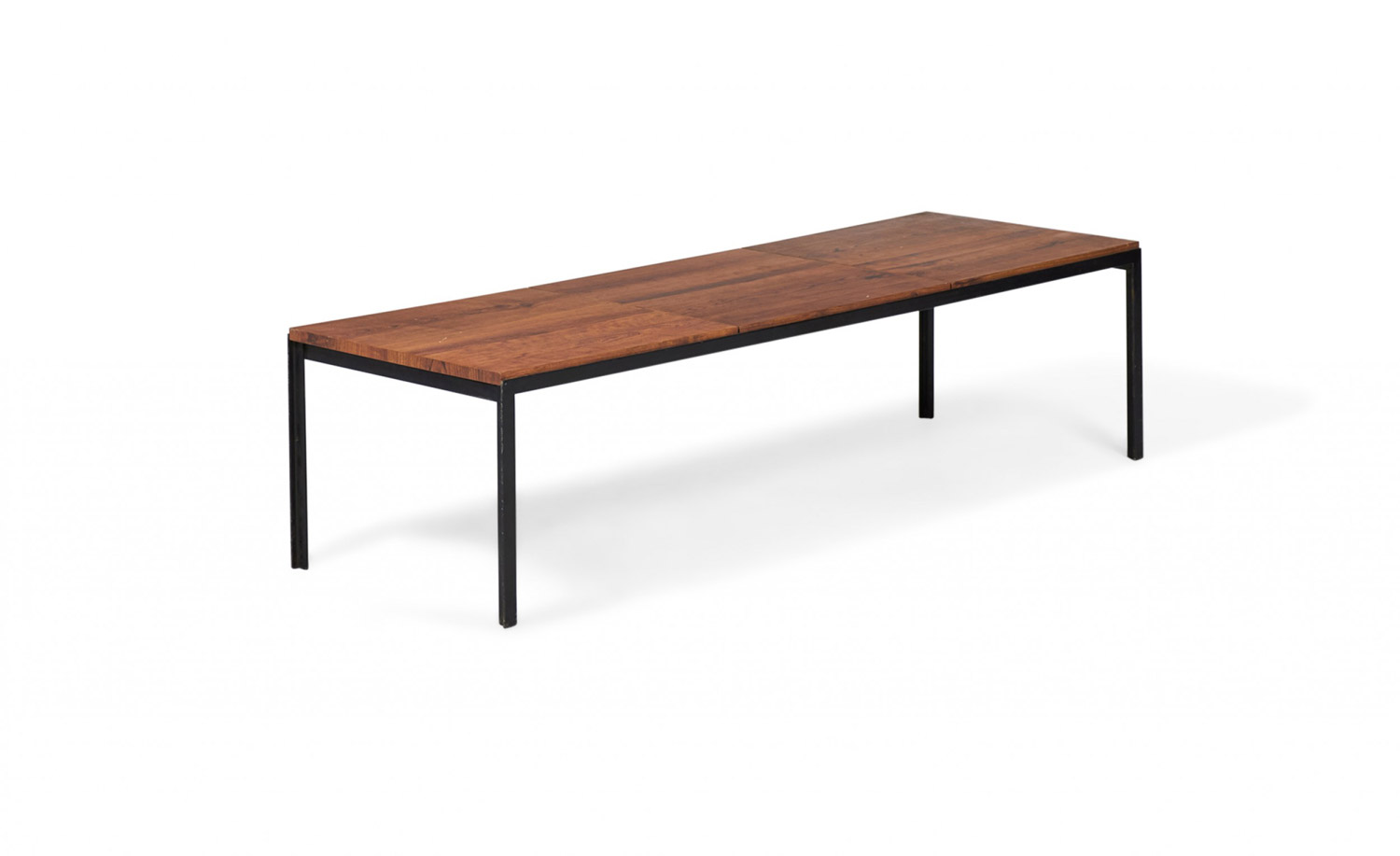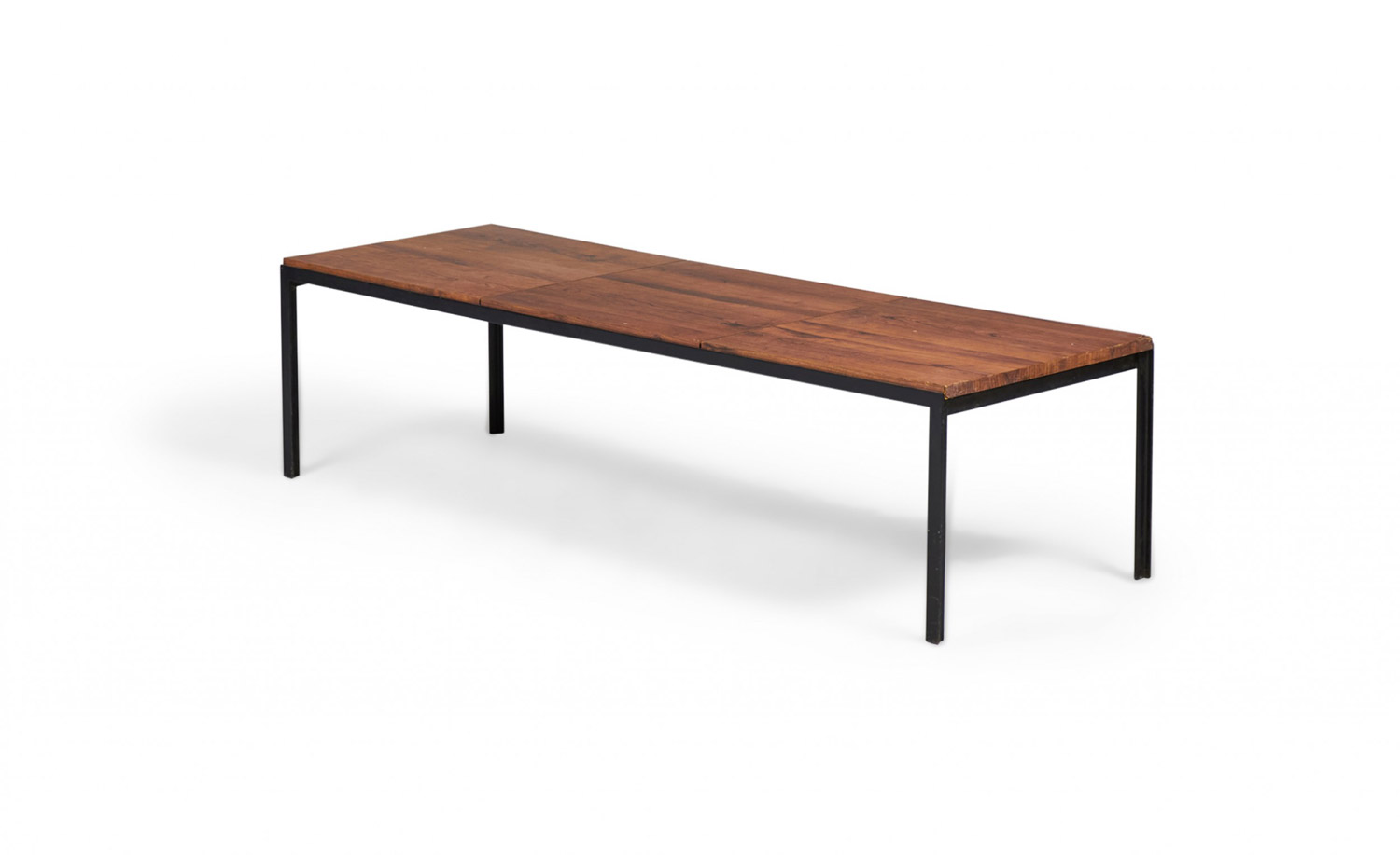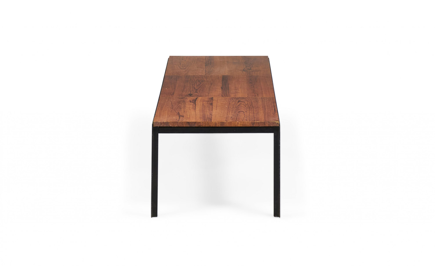American Mid-Century rectangular coffee / cocktail table with a walnut laminate top in three sections supported on a T-shaped black metal base. (FLORENCE KNOLL)(Similar table: DUF0082)