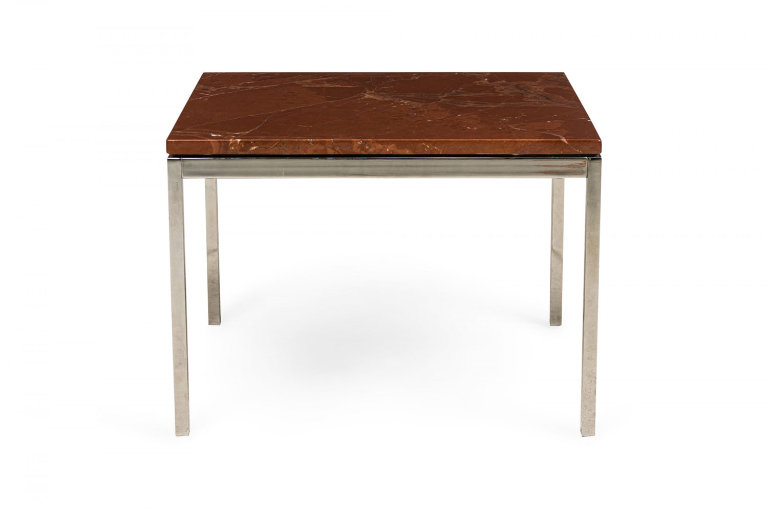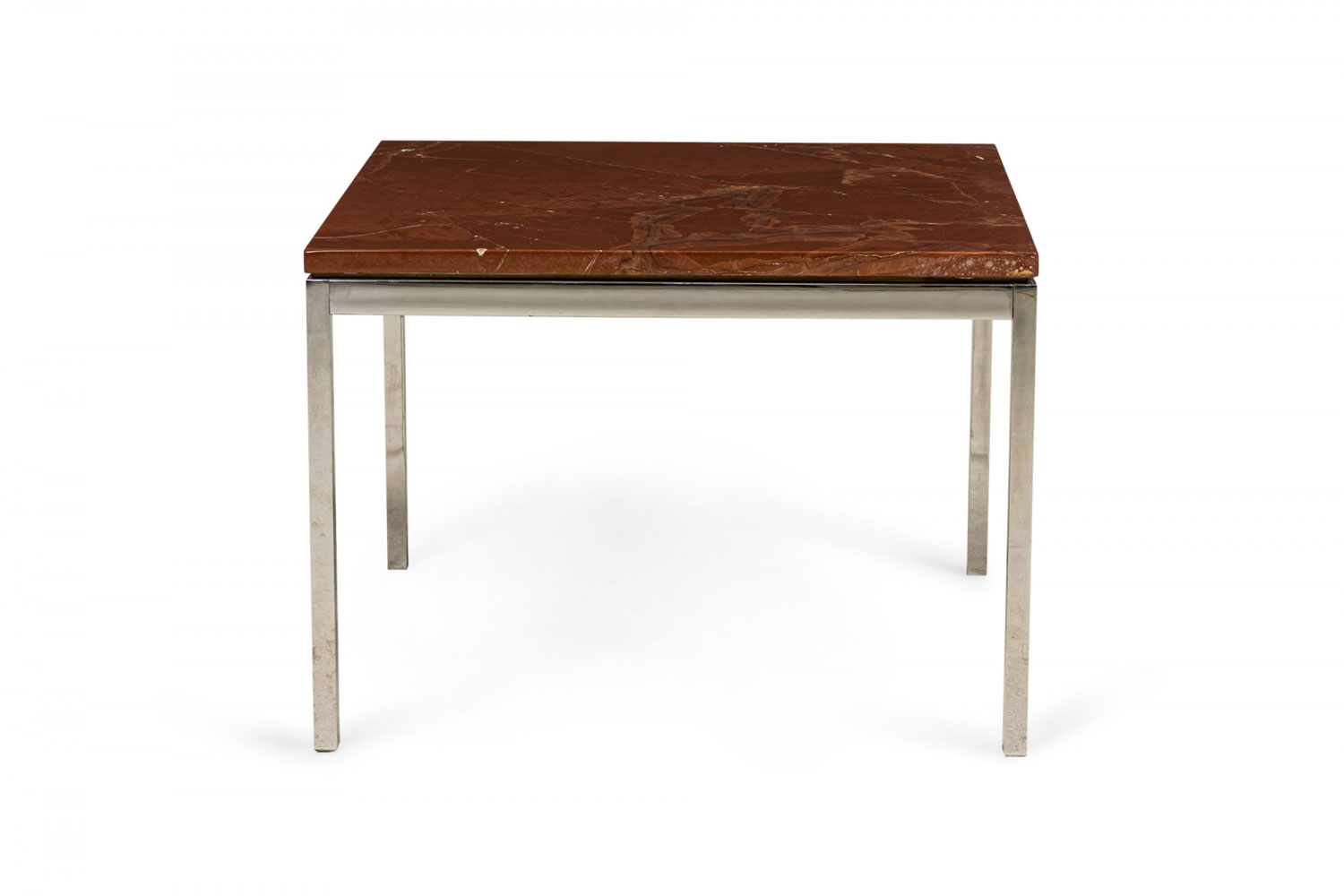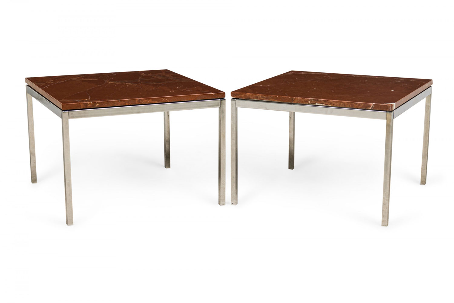 PAIR of American Mid-Century square end / side tables with brown marble tops resting on square steel bases with four square legs. (FLORENCE KNOLL FOR KNOLL INTERNATIONAL)(PRICED AS PAIR).