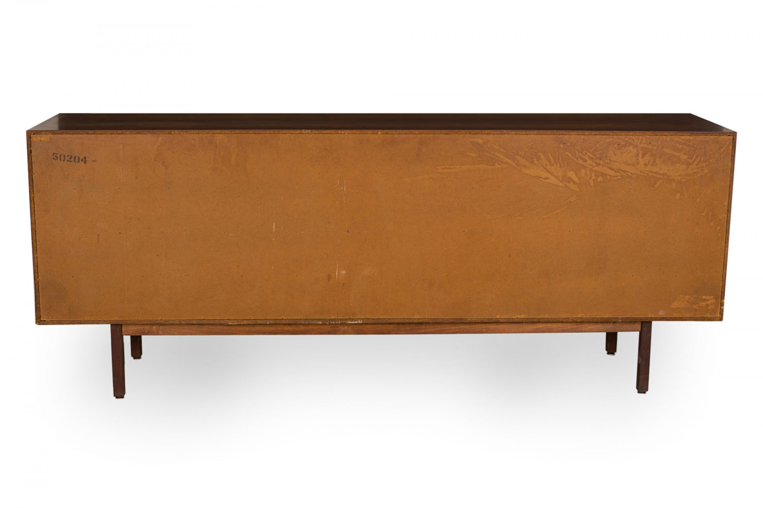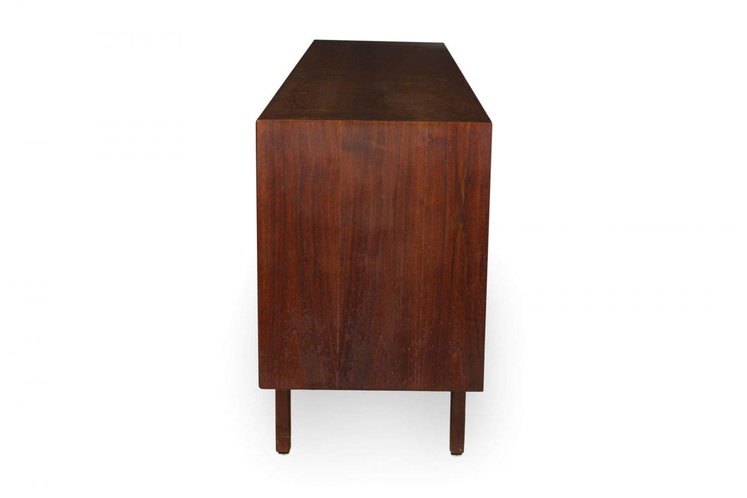 American Mid-Century teak 12-drawer low chest with three sections of four drawers each with circular brass drawer pulls in a rectangular cabinet resting on four square teak legs. (FOUNDERS / DILLINGHAM FURNITURE)