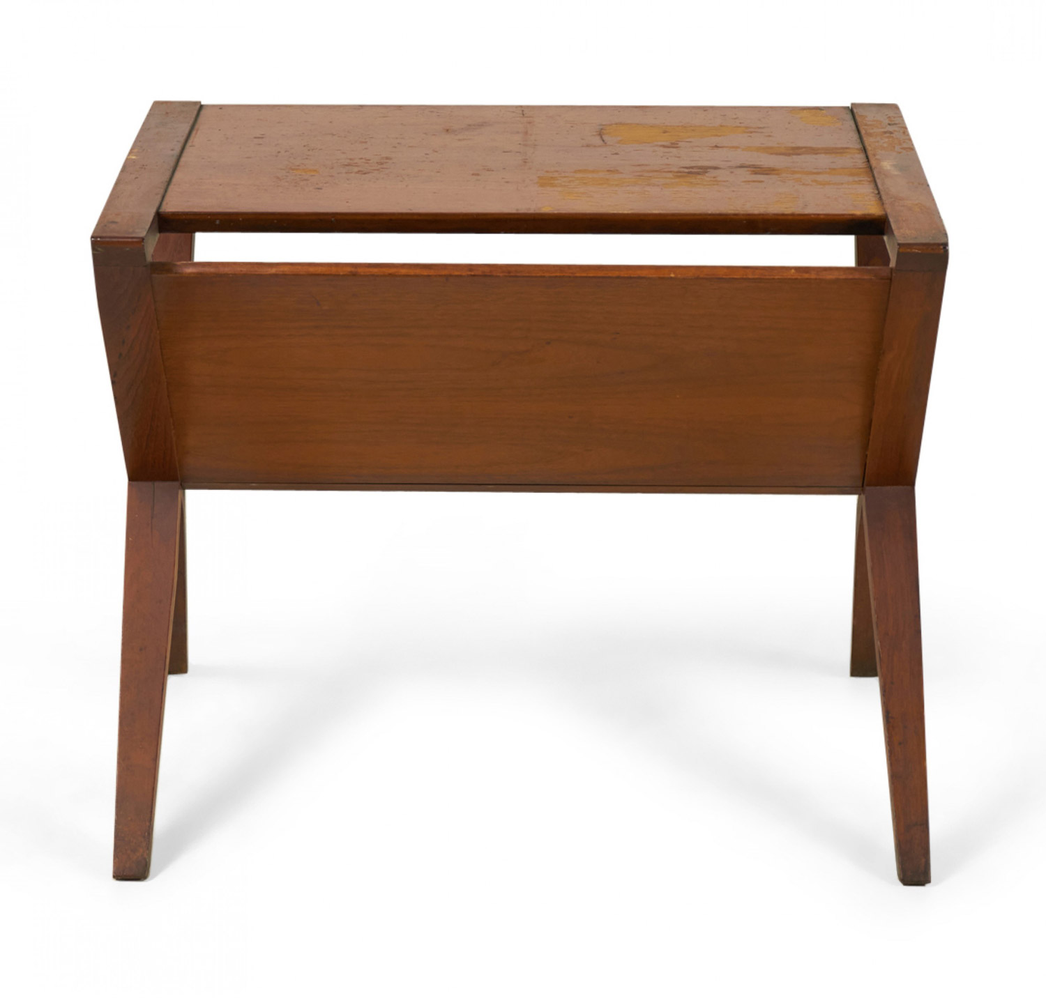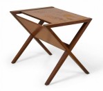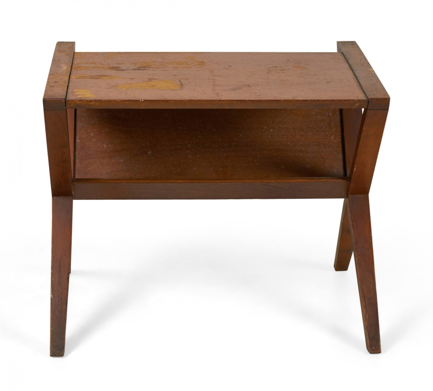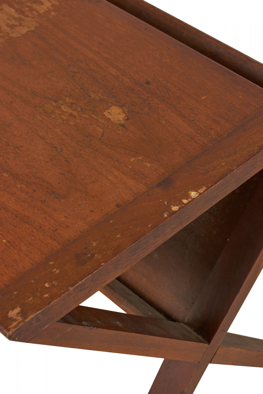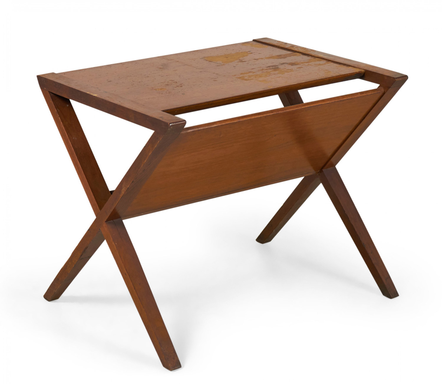 American Mid-Century walnut end / side table with a rectangular table top inset in an X-shaped frame with a diagonally-sloped built-in magazine shelf below the table surface. (FOUNDERS FURNITURE COMPANY)