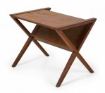 American Mid-Century walnut end / side table with a rectangular table top inset in an X-shaped frame with a diagonally-sloped built-in magazine shelf below the table surface. (FOUNDERS FURNITURE COMPANY).
