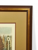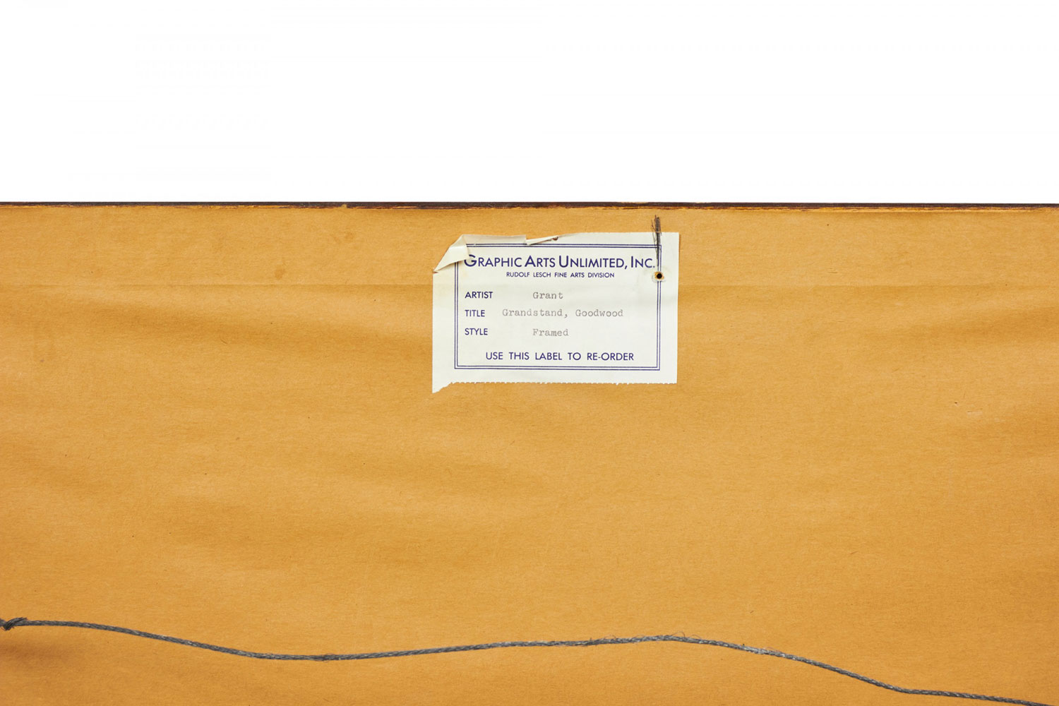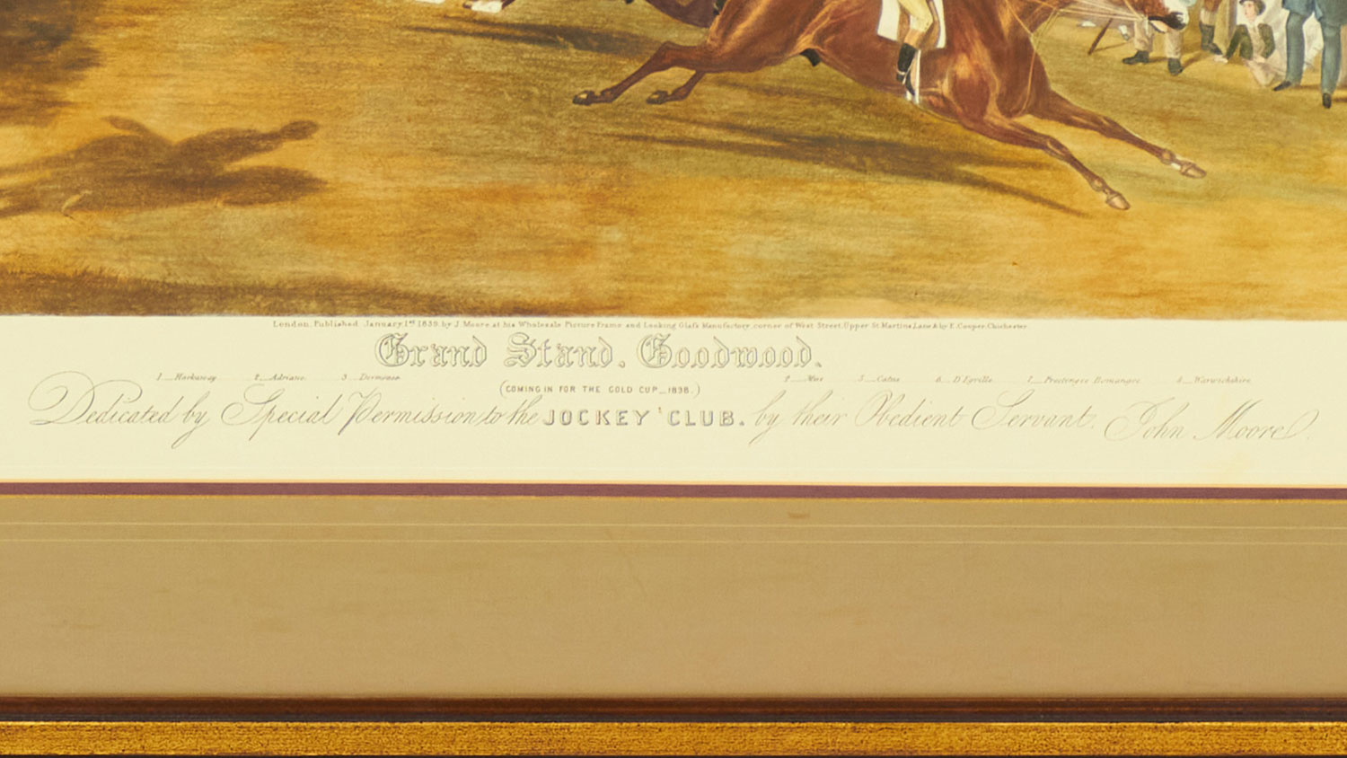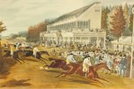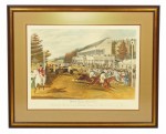 English Victorian-style lithography print of a horse racing scene depicting mounted jockeys riding down the track while spectators look on from a large grandstand and behind a gate in a rectangular wooden frame and tan mat. (similar items 062902-062921).